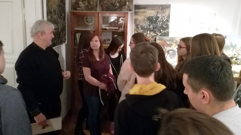 Szczególnie zainteresował młodzież opowieściami o tym, jak powstają obrazy. Zaprezentował szkice, które poprzedzają powstanie każdego malarskiego dzieła. Na zakończenie spotkania, wszyscy pozowali do wspólnej fotografii ze wspaniałym twórcą, który nie tylko rozszerzył historyczną wiedzę uczniów, ale również rozbawił ich swoim poczuciem humoru. Dziękujemy za wspaniałą lekcję historii.