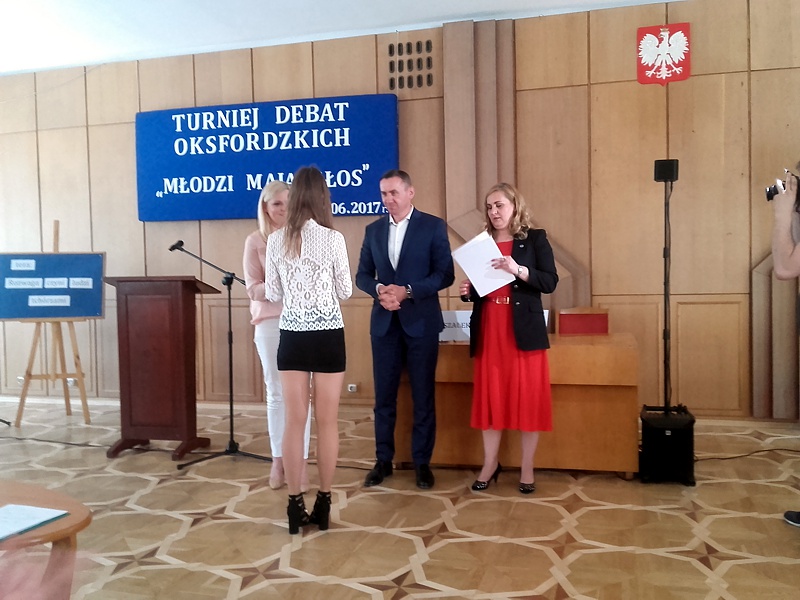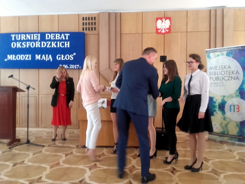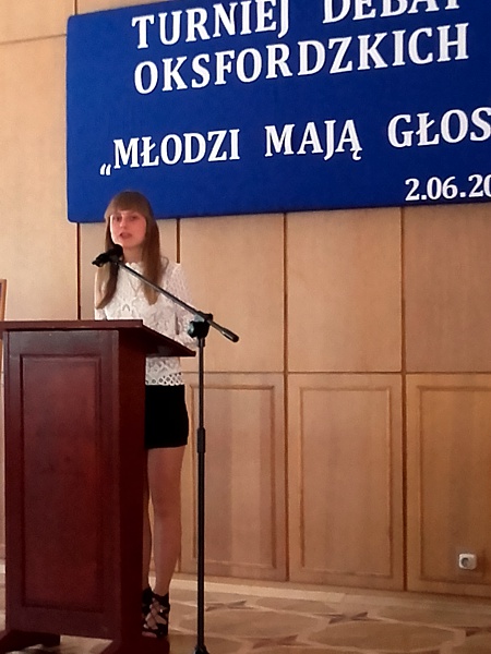 2 czerwca odbył się w HDK Turniej Debat Oksfordzkich. Wydarzenie to zorganizowane było przez nieformalną grupę młodych POBUDZENI a patronat objął Burmistrz Miasta Tomasz Zając. Naszą szkołę reprezentowały przedstawicielki Samorządu Uczniowskiego: Agata Łaba, Aleksandra Kędziera, Justyna Szlonzak oraz Magdalena Chrząstek. Temat debaty brzmiał „Rozwaga czyni ludzi tchórzami”. Perfekcyjne przygotowanie oraz wielkie emocje jakie budziły wypowiedzi dziewcząt przesądziły o wygranej. Nasza drużyna otrzymała tytuł Najlepszej Drużyny Turnieju Debat Oksfordzkich w kategorii gimnazjum. Mikrofon Najlepszego Mówcy Turnieju w tej kategorii otrzymała Aleksandra Kędziera z klasy III A.