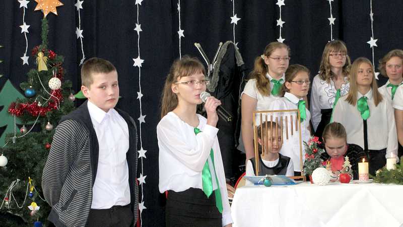 Całość przedstawienia pokazującego i przypominającego przepiękne tradycje Świąt Bożego Narodzenia przeplatana była kolędami i pastorałkami we współczesnej interpretacji. Publiczność mogła też po raz kolejny przeżyć historię Marii i Józefa szukających miejsca do schronienia na noc, którzy po bezowocnych poszukiwaniach zdecydowali się przenocować w stajni. I to do nich i małego Jezuska przybyli tak honorowi goście jak trzej mędrcy i złożyli dzieciątku pokłon. „Jasełka” wraz z uczniami przygotowały pani Małgorzata Koniec i siostra Bożena Brandenburg, które również wykonały dekorację . Współpracowała z nimi także pani Alicja Strójwąs – Mojsym. Oprawę muzyczną zapewnił chór szkolny pod kierunkiem pani Anety Franke. Po przedstawieniu Pani Dyrektor podziękowała wszystkim „aktorom” i nauczycielom , którzy przyczynili się do wzbogacenia szkolnej Wigilii, a następnie złożyła wszystkim obecnym świąteczne życzenia i zaprosiła Pracowników szkoły na spotkanie opłatkowe. Jasełka pozwoliły poczuć rodzinną atmosferę zbliżających się Świąt Bożego Narodzenia i rozpocząć wspólne świętowanie narodzin Zbawiciela.