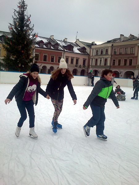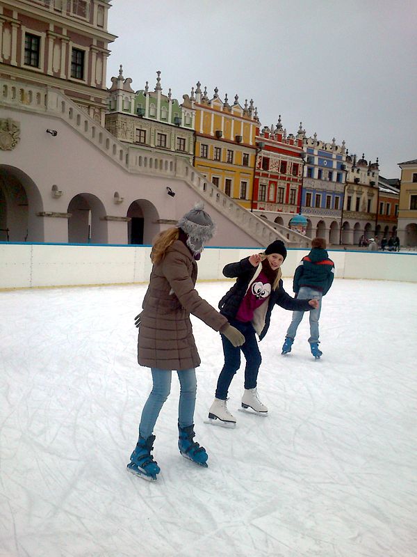 Klasa VI a wraz z nauczycielami wychowania fizycznego - p. Joanną Różańską i p. Tomaszem Szlonzakiem - wybrała się na wycieczkę do Zamościa. Na początku kroki swe skierowała na Krytą Pływalnię, gdzie, jak zwykle, czekało na spragnionych wody mnóstwo atrakcji. To one sprawiły, że uczniowie całkowicie zapomnieli o szkolnych obowiązkach i poczuli smak morskiej przygody. Kolejnym punktem programu wycieczki były zabawy na lodowisku. W pięknej scenerii zamojskiego rynku tylko nieliczni zaliczyli upadek. Wszyscy za to pozowali do zdjęć, robiąc przy tym piruety, obroty, świadczące o drzemiących w młodych łyżwiarzach talentach i pokładach niespożytej energii.