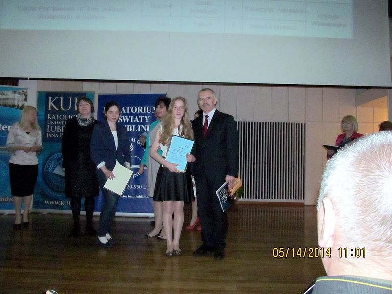 Magdalena Dąbrowska ucz. kl. VI Zespołu Szkół Miejskich nr 3 w Hrubieszowie, 14 maja br. pojechała do Lublina na podsumowanie konkursów przedmiotowych organizowanych przez Lubelskiego Kuratora Oświaty. W tym roku odbyło się ono w auli Katolickiego Uniwersytetu Lubelskiego. Magda została laureatką konkursu polonistycznego. Tym większy to dla niej sukces, bo jako jedyna z powiatu hrubieszowskiego uczestniczyła w zmaganiach wojewódzkich tego konkursu.