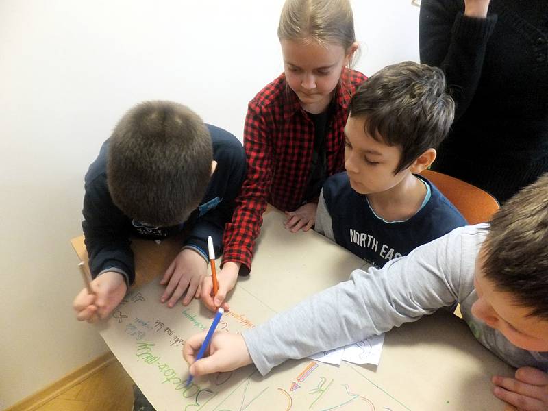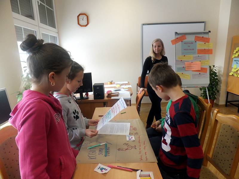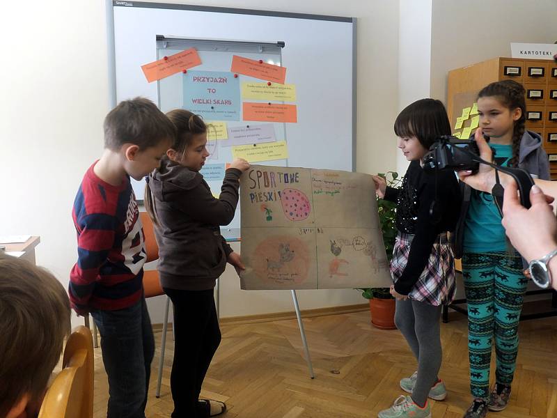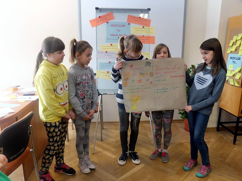 Uczniowie na kartkach zapisali słowa, które kojarzą im się z przyjaźnią. Po analizie skojarzeń wszystkie zapiski trafiły na tablicę, na której widniały już piękne aforyzmy nawiązujące do motywu przewodniego. Potem przyszedł czas na zabawę. Dzieci miały znaleźć wszystkich, którzy skrywali się za maskami tych samych zwierząt. Gdy dokonano sformułowania grup, uczestnicy zajęć otrzymali kartony. Mieli na nich zapisać nazwę swojego zespołu, jego członków, narysować coś, co by reklamowało grupę. W ostatnim kwadracie dzieci miały umieścić fragment komiksu. Kolejne zadanie nawiązywało do bajki o charakterze moralizatorskim. Okazało się, że zmusiło ono całą klasę do refleksji i odpowiedzi na pytania dotyczące wartości przyjaźni w życiu wszelkich istot. Zajęcia były bardzo owocne. Na pewno pouczenia z nich płynące na długo pozostaną w świadomości dzieci.