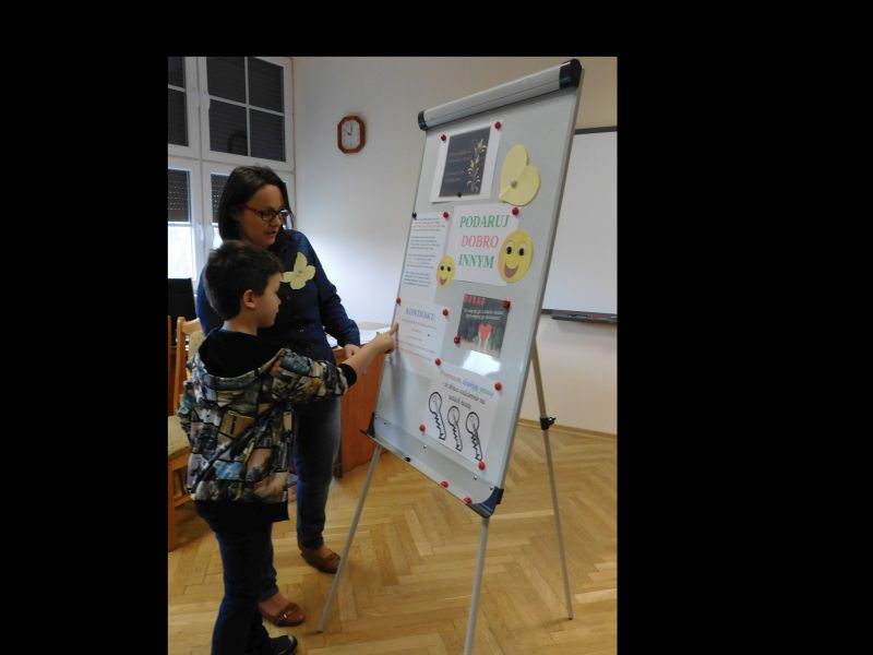 Zajęcia przeplatane były zabawami ruchowymi przy muzyce, ze śpiewem. Spotkanie było bardzo udane. Pierwszoklasiści nauczyli się, że dobroć to najlepsza rzecz, którą może czynić człowiek. Polega na szanowaniu i kochaniu wszystkich istot żywych, wyznacza właściwe postępowanie.