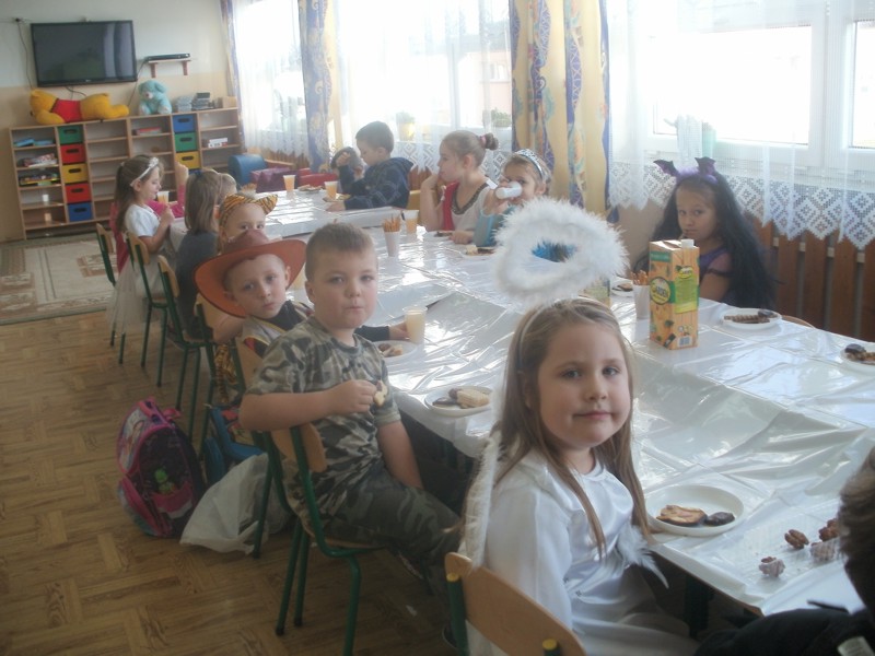 Każde dziecko chciało się dowiedzieć co je czeka w przyszłości. Poznały wróżby, które są królem tego dnia. Po zabawie przyszedł czas na słodki poczęstunek przygotowany przez rodziców. Ten magiczny dzień był kolejną okazją do integracji zespołu, lepszego poznania siebie, a przede wszystkim dostarczył wiele radości i śmiechu. Wychowawca Alicja Ryszkowska