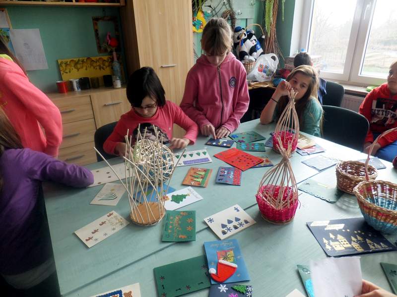 Po krótkich warsztatach teatralnych dzieci udały się do pracowni plastycznej. To w niej pod okiem instruktorów, m.in. p. Andrzeja Maruta, p. Ewy Watras wykonuje się prace, które mogą liczyć na podziw i uznanie. W kolejnej sali czekała na nas pani Barbara Smal, która potrafi po mistrzowsku i w sposób artystyczny odręcznie zapisać słowa. Jej pismo to dowód na to, ze kaligrafia nie jest rzeczą prostą. Tuż obok jej pokoju była pracownia , w której p. Marek Sioma wraz z chętnymi przygotowywał piękne kartki i dekoracje świąteczne.