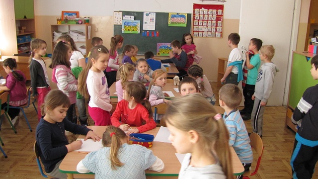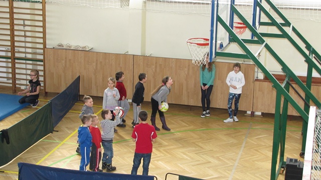 Każde mogło wybrać coś dla siebie. Jedne rzucały piłką do kosza, inne pokonywały tory przeszkód, jeszcze inne bawiły się kołem hula – hop. Na ich twarzach malowały się uśmiech i radość. Widać było, że są zadowolone. Potem zwiedzały szkołę. Odwiedziły sale klas I, II i oddział przedszkolny. Zobaczyły miejsca, w których uczą się ich starsze koleżanki i koledzy. Widziały jak można korzystać z tablicy interaktywnej, były na lekcji muzyki w kl. II, śpiewały z klasą piosenki. Dzień atrakcji zakończyła inscenizacja o tematyce ekologicznej „Wiosna w lesie”, którą przygotowali uczniowie kl. III a pod kierunkiem pani Alicji Dziedzic. Wartka, bardzo żywa część artystyczna bardzo podobała się przedszkolakom. Reagowały na różne rytmy muzyki klaskaniem, tupaniem i wspólnym śpiewem. Były szczęśliwe i zauroczone pobytem w szkole. Na koniec przedszkolaki otrzymały drobne upominki w postaci kolorowanek, słodyczy i drobnych wiosennych kwiatów wykonanych przez trzecioklasistów.