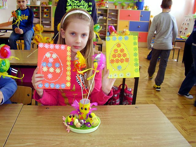 Byliśmy mile zaskoczeni i bardzo szczęśliwi. Nie próżnując, przygotowaliśmy dla Wiosny barwną sukienkę i samochód z nadzieją, że przyjmie te prezenty i niebawem do nas zawita. Wielkanocne palmy, stroiki, kartki i pisanki dopełniły paletę wiosennych kolorów. Wspólna praca i zabawa nie poszła na marne. Wiosna doceniła te starania i nareszcie zagląda do naszych okien. Witamy Wiosnę!