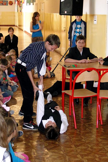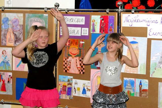 We wtorek przedstawienie przygotowała klasa V a. Motywem przewodnim przedstawienia był wehikuł czasu, który przenosił nas w czasie w różne zakątki krajów europejskich. W środę odbył się Konkurs Wiedzy o Unii Europejskiej.
