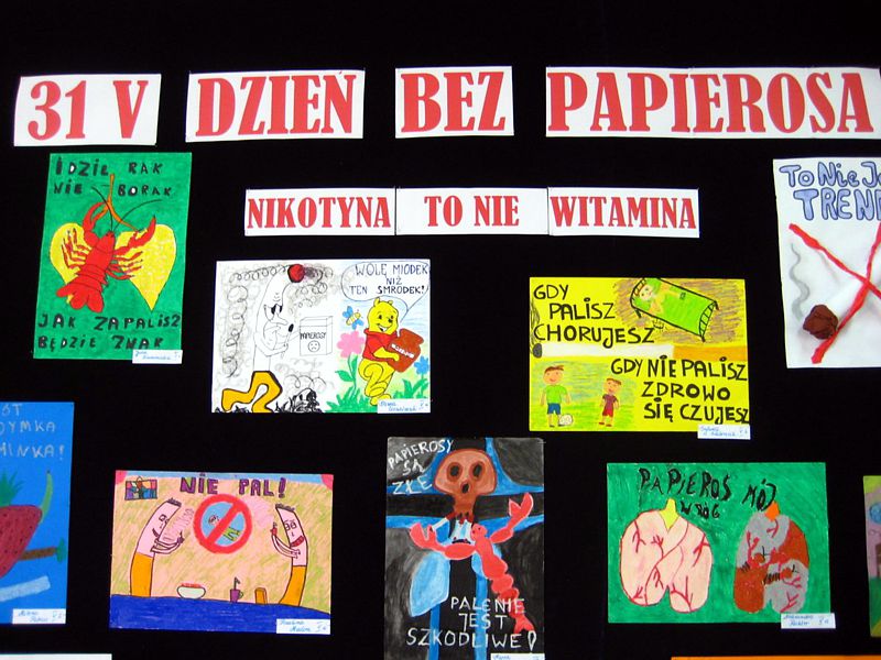 31 maja to „Dzień Bez Papierosa”. Z tej okazji 15.05.2013 r. w naszej szkole odbył się konkurs wiedzy na temat szkodliwości palenia papierosów pod hasłem „Nikotyna to nie witamina”. Konkurs zorganizowano dla uczniów klas IV-VI w ramach programu profilaktyki palenia tytoniu „Znajdź właściwe rozwiązanie”. Wszyscy uczestnicy otrzymali dyplomy a najlepsi nagrody. Oto wyniki konkursu: