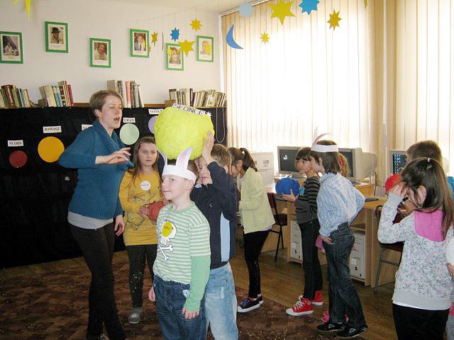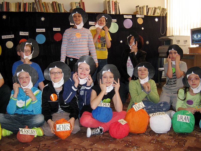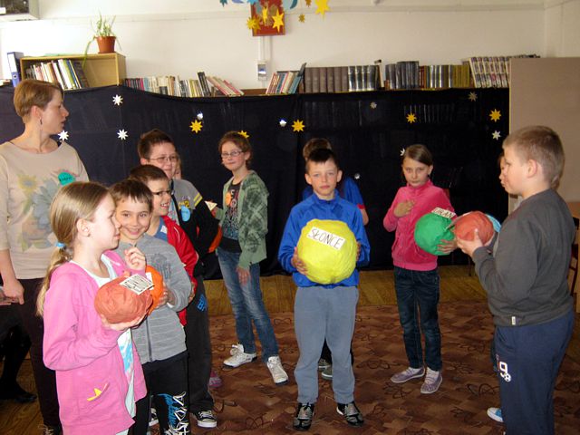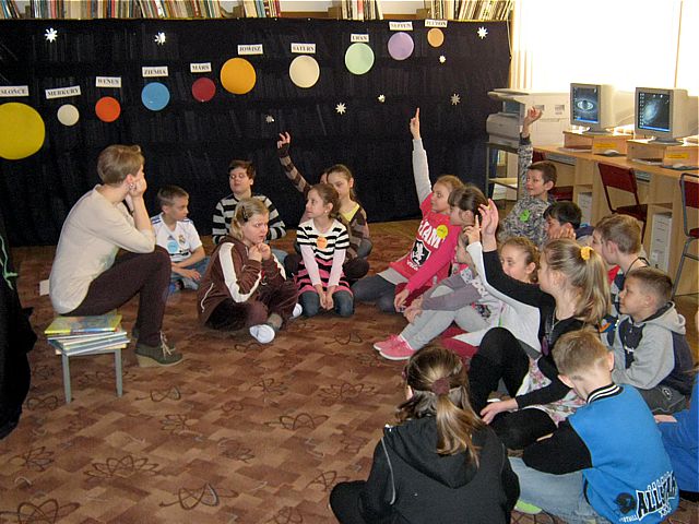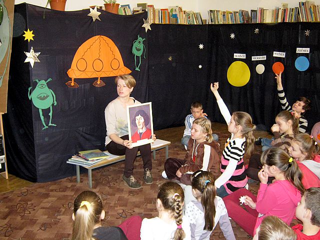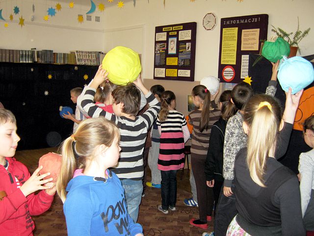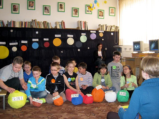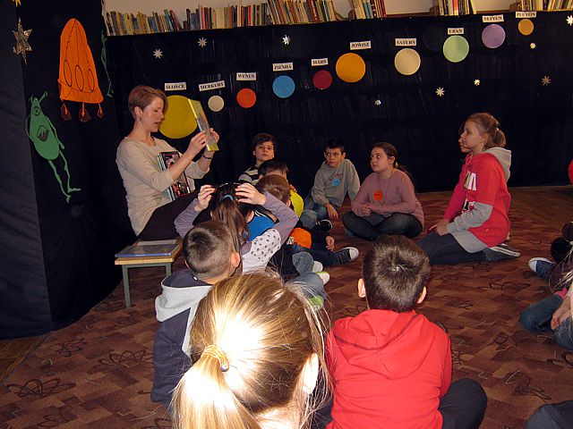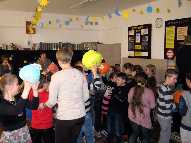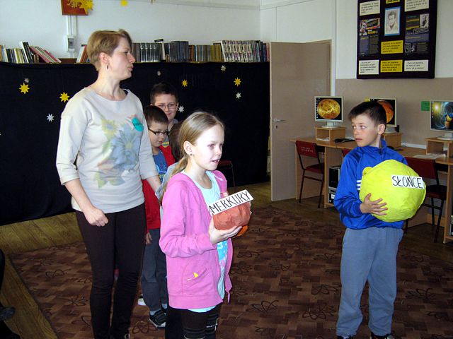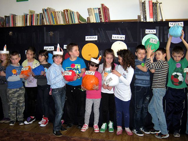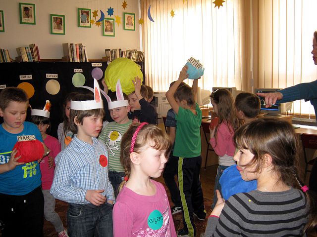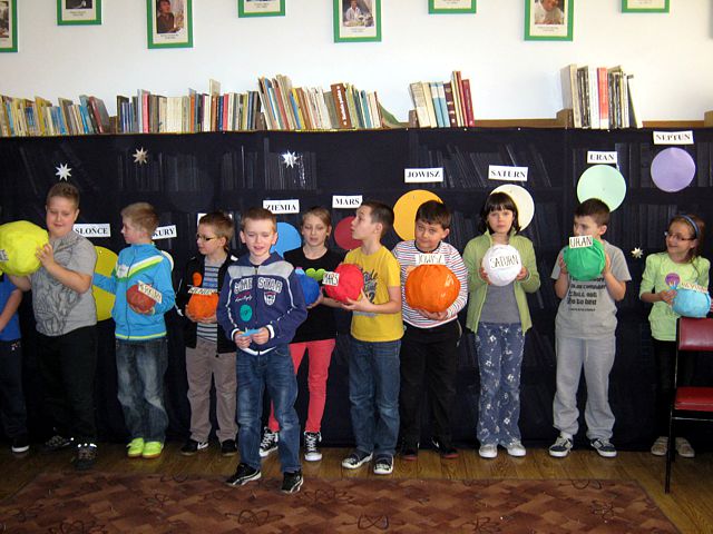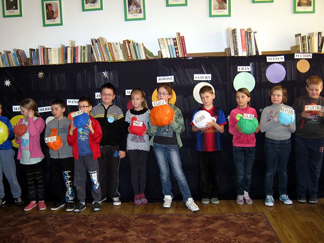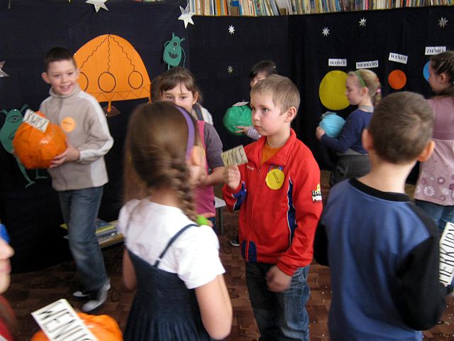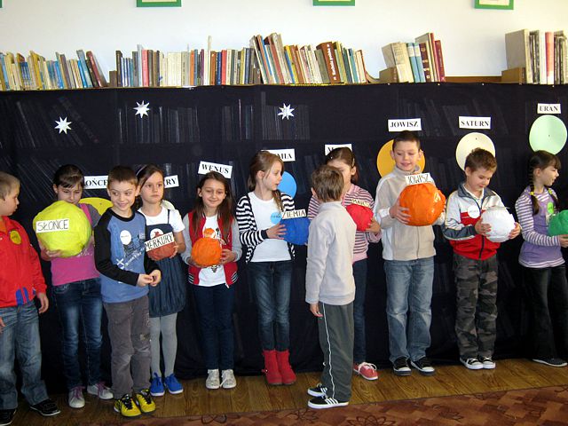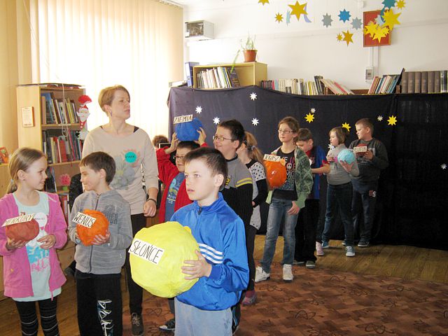 „Merkury w blasku słońca się chowa, Wenus rano i wieczorem świecić gotowa…”. Kosmiczną przygodę przeżywali uczniowie klas II i III. Zajęcia odbyły się w czytelni, w specjalnej scenerii – sznur gwiazd pod sufitem, zakryte regały granatowym materiałem, z Układem Słonecznym, statkami powietrznymi, przybyszami z kosmosu. Uczniowie na czas spotkania zapomnieli o swoich imionach, każdy z nich przyjął nazwę gwiazdy, planety, księżyca.