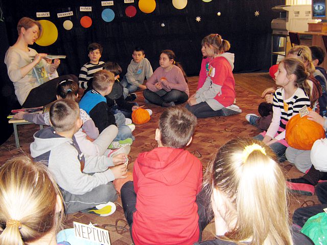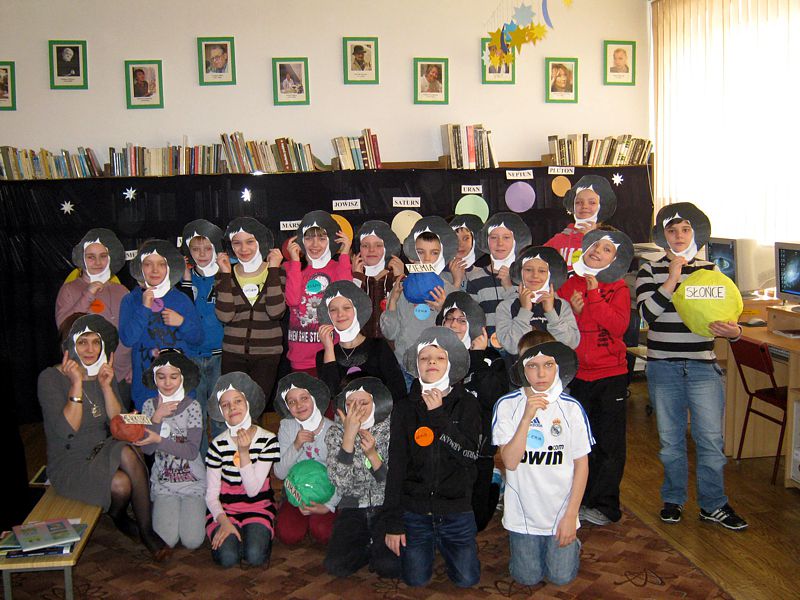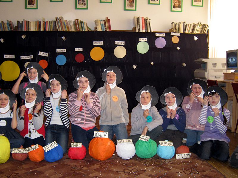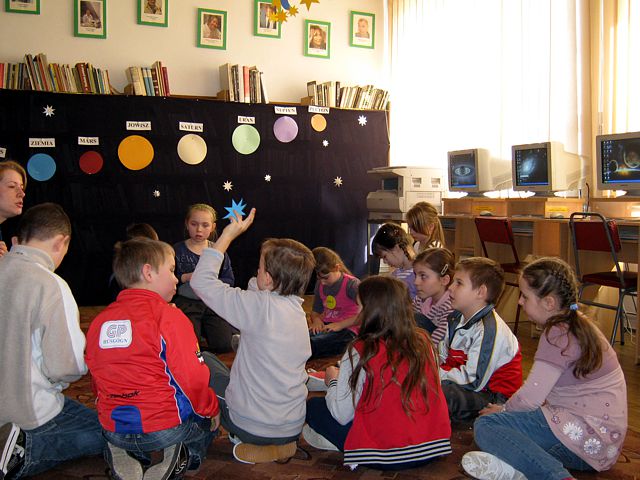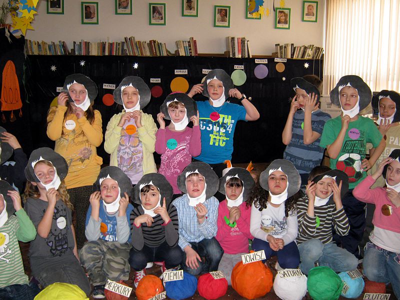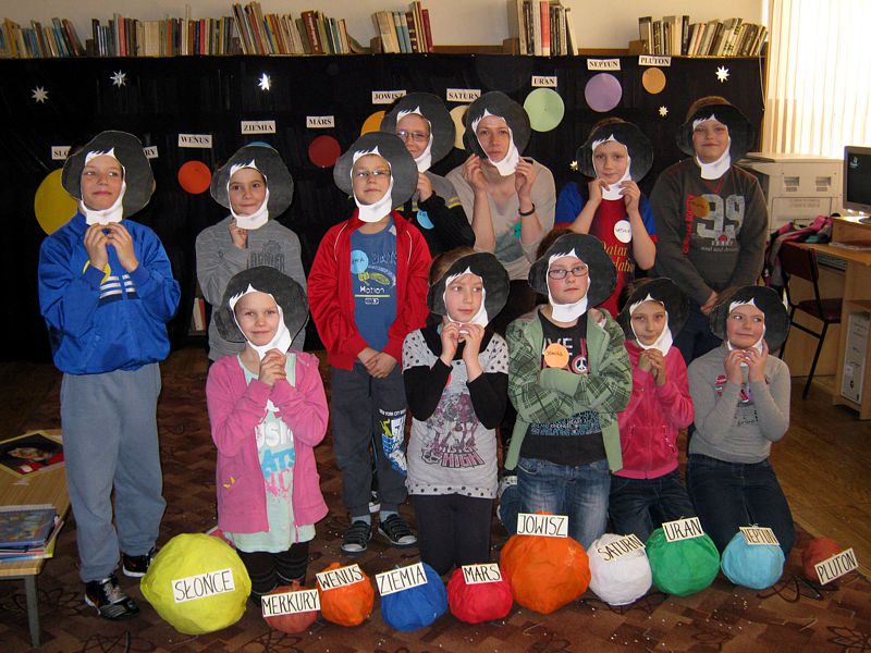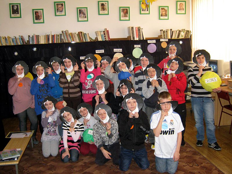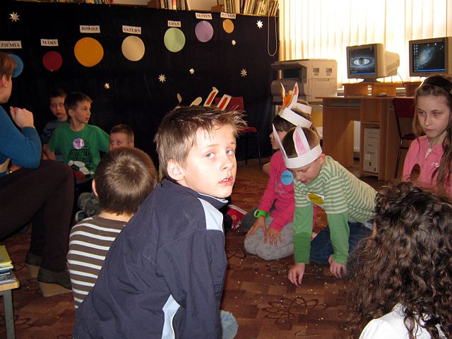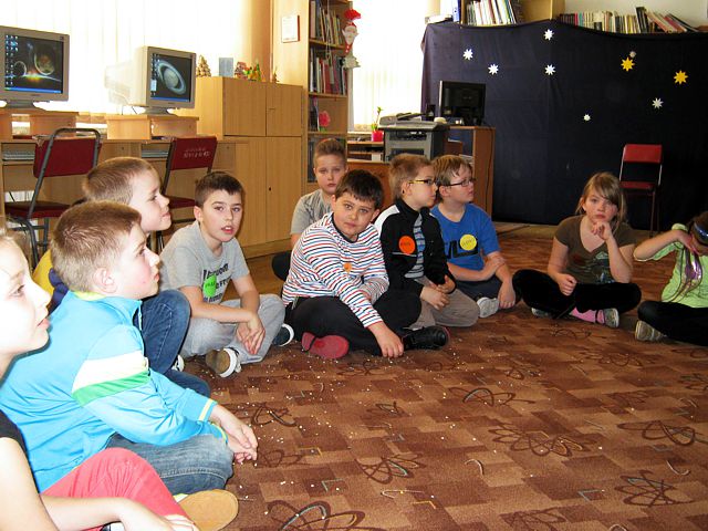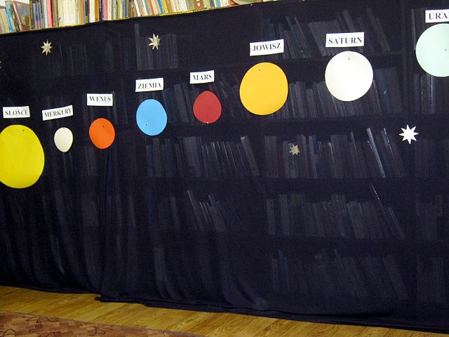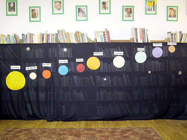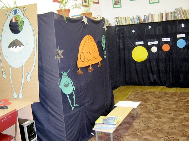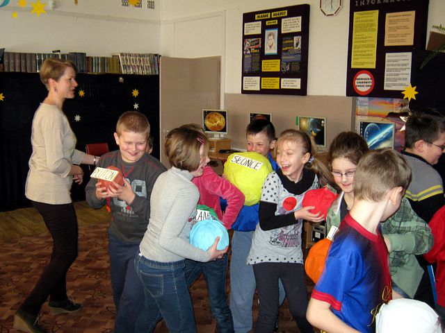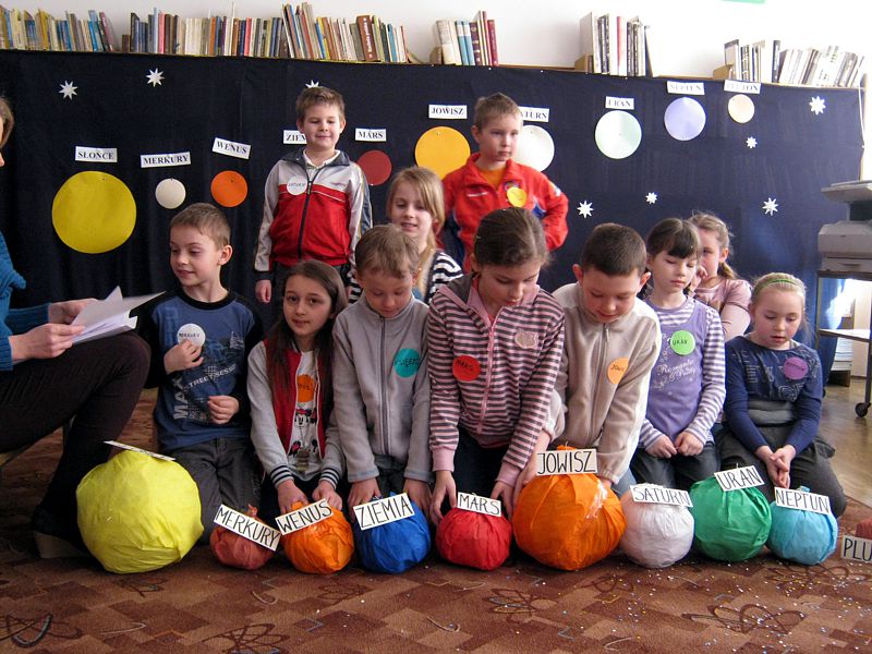 „Merkury w blasku słońca się chowa, Wenus rano i wieczorem świecić gotowa…”. Kosmiczną przygodę przeżywali uczniowie klas II i III. Zajęcia odbyły się w czytelni, w specjalnej scenerii – sznur gwiazd pod sufitem, zakryte regały granatowym materiałem, z Układem Słonecznym, statkami powietrznymi, przybyszami z kosmosu. Uczniowie na czas spotkania zapomnieli o swoich imionach, każdy z nich przyjął nazwę gwiazdy, planety, księżyca.