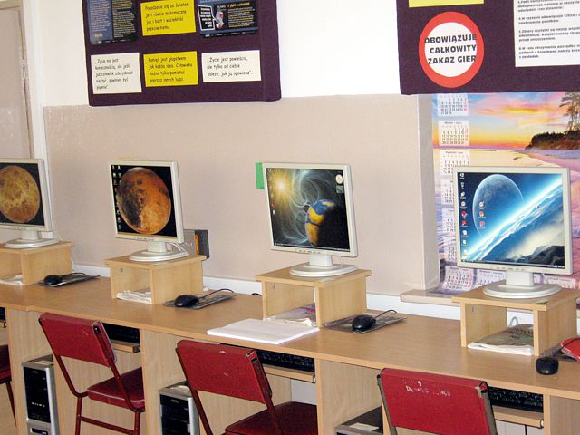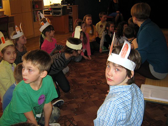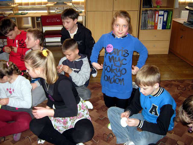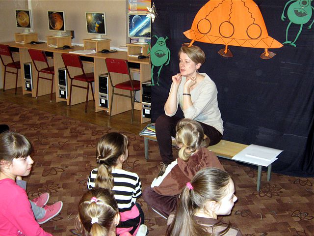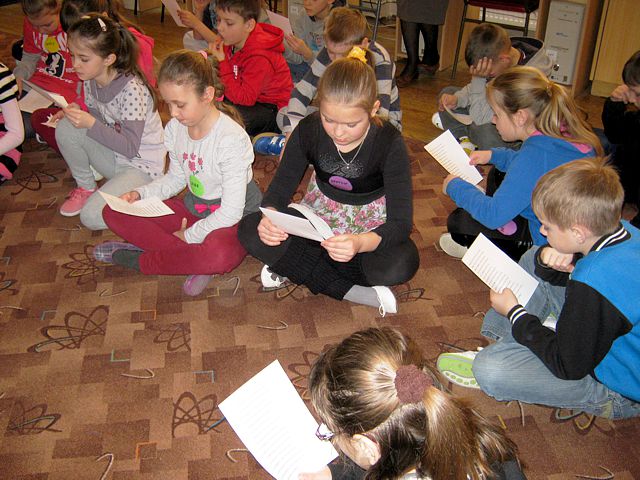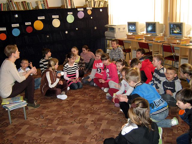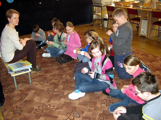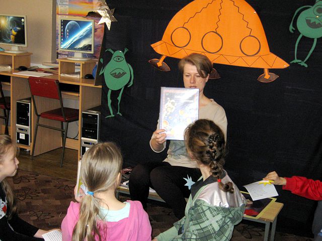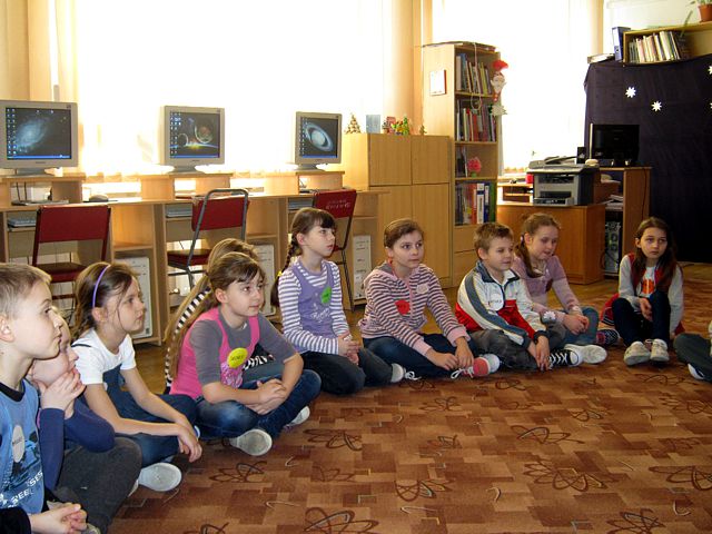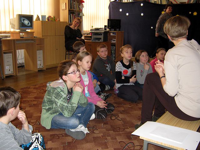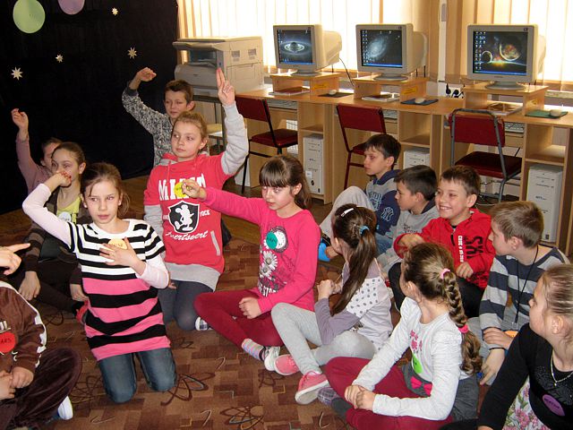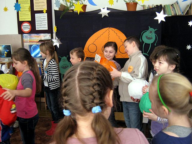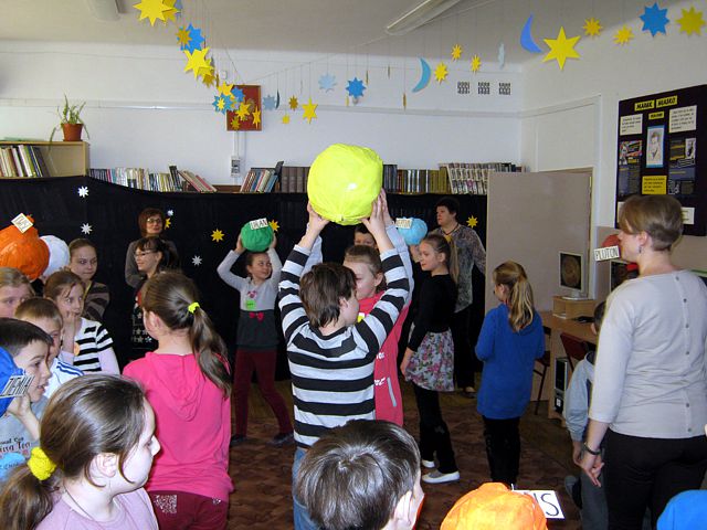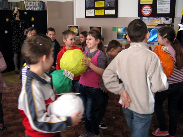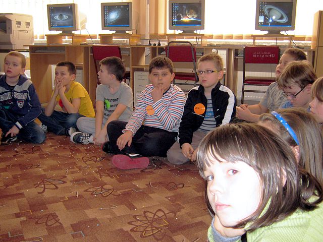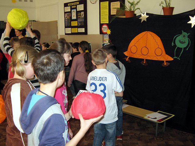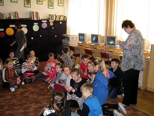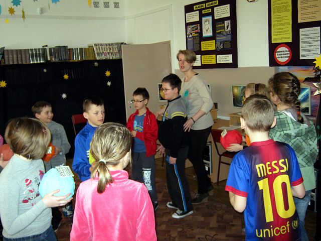 „Merkury w blasku słońca się chowa, Wenus rano i wieczorem świecić gotowa…”. Kosmiczną przygodę przeżywali uczniowie klas II i III. Zajęcia odbyły się w czytelni, w specjalnej scenerii – sznur gwiazd pod sufitem, zakryte regały granatowym materiałem, z Układem Słonecznym, statkami powietrznymi, przybyszami z kosmosu. Uczniowie na czas spotkania zapomnieli o swoich imionach, każdy z nich przyjął nazwę gwiazdy, planety, księżyca.