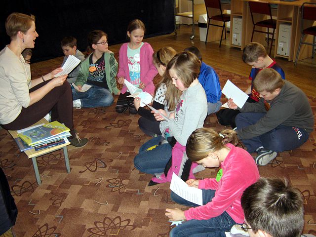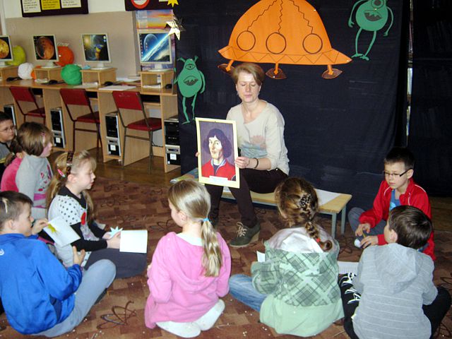 W ten sposób wszyscy mieli możliwość wykazania się wiedzą o „sobie”. Z pomocą prowadzącego dzieci podróżowały przez tematy: nasza planeta Ziemia, Układ Słoneczny, co jeszcze jest na niebie, wyprawy w kosmos, badanie kosmosu, był taki jeden Mikołaj i wiele innych, które wynikły w trakcie zajęć. Zajęcia przeplatane były wierszykiem, zagadką, deszczem meteorytów, zabawą „Porządek i Chaos w Układzie Słonecznym”, pomyślanymi życzeniami przy spadających gwiazdach, reklamą książek związanych z tematem spotkania. Na koniec wspólna fotografia, na której wszyscy zostali Kopernikami.