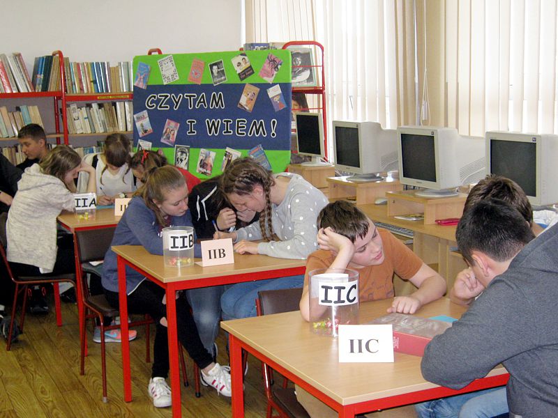28 kwietnia klasy drugie naszego gimnazjum wzięły udział w turnieju czytelniczym "Czytam i wiem!”. Trzyosobowe drużyny rywalizowały ze sobą w różnorodnych konkurencjach. Uczniowie musieli wykazać się bardzo dobrą znajomością literatury, szczególnie lektur szkolnych. Był to czas, który pozwolił na sprawdzenie wiadomości i umiejętności z zakresu czytania, sprawnego korzystania ze słowników i umiejętności ruchowych (kalambury).