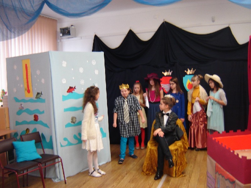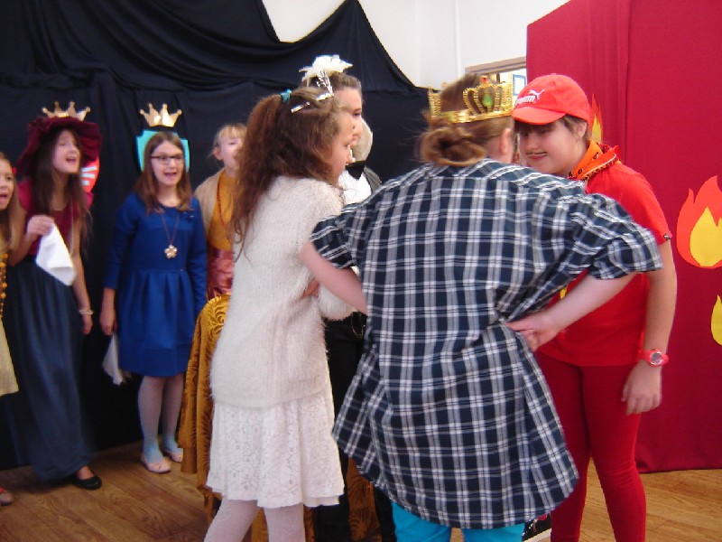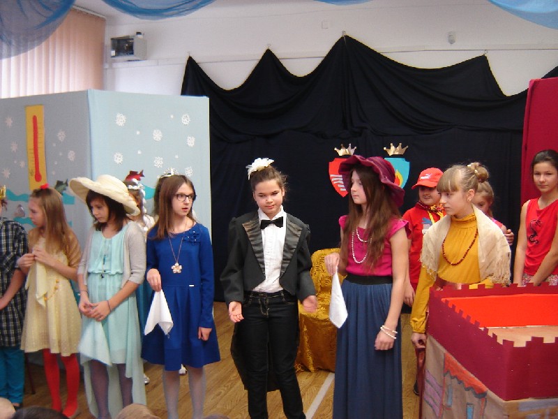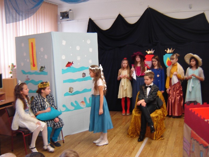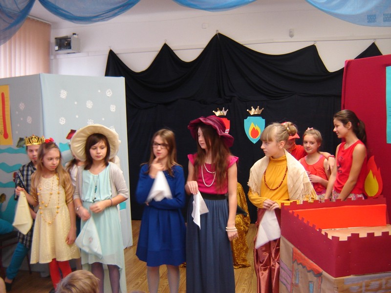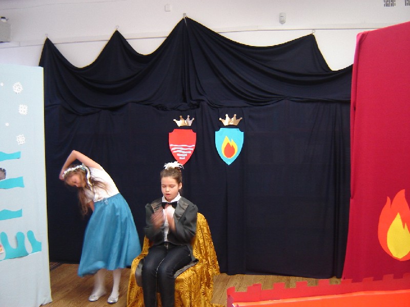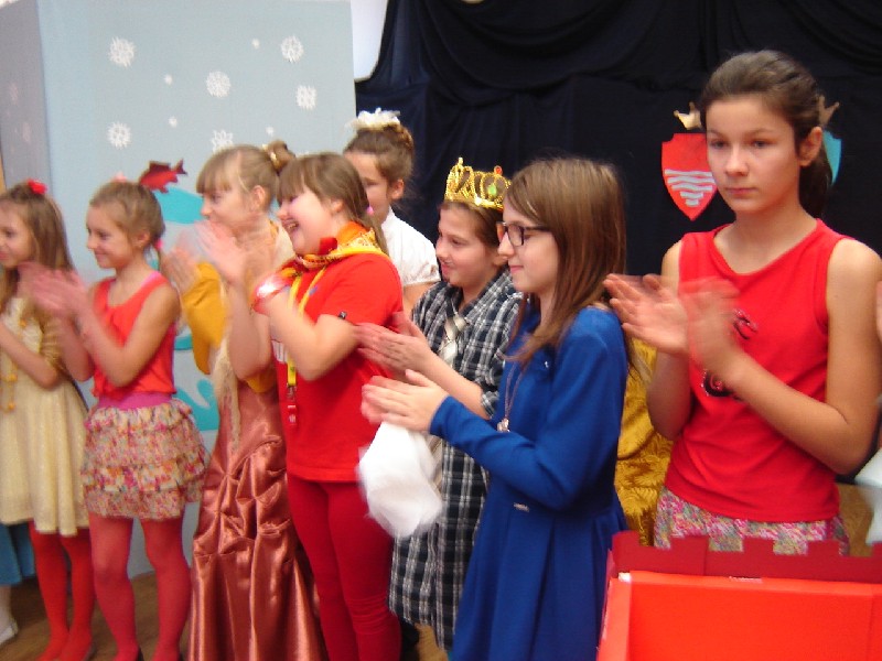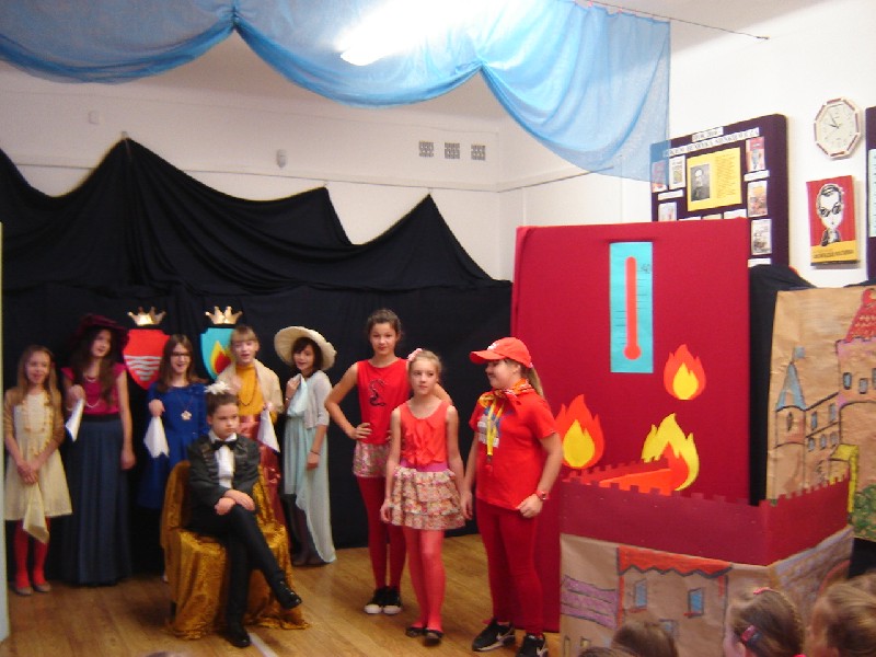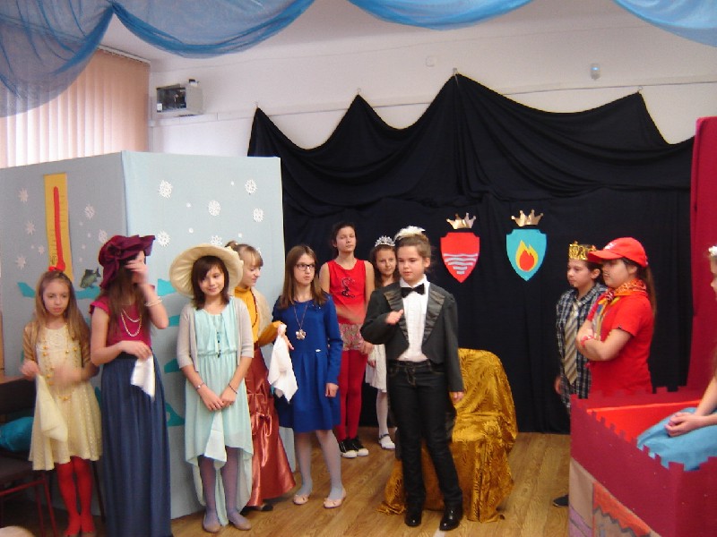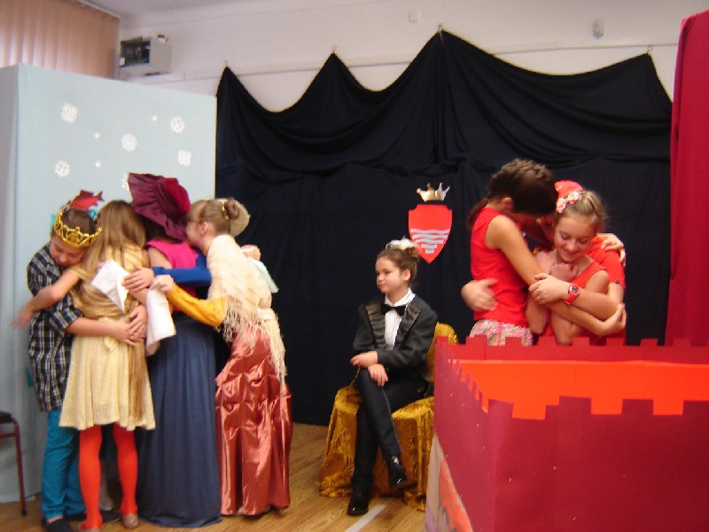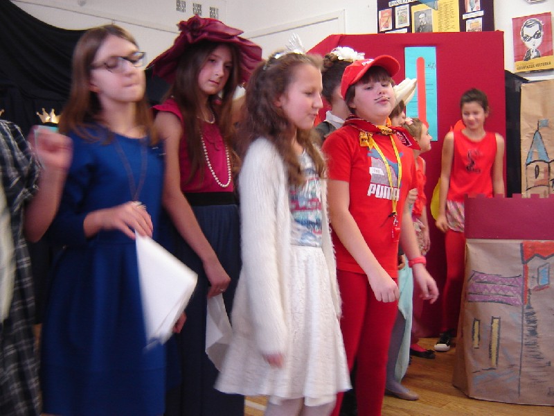 W dalekiej krainie pomiędzy dwoma królestwami trwa wojna…To początek historii, która rozegrała się na „deskach” zaimprowizowanego teatru. Przedstawienie pt. „Dwa Królestwa” obejrzeli uczniowie klas 0-III, wychowawcy, Pani Dyrektor Danuta Krawczuk oraz zaproszeni goście. W poszczególne postacie wcieliły się: