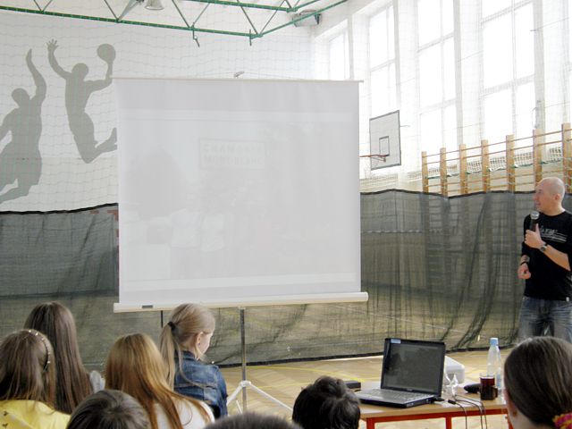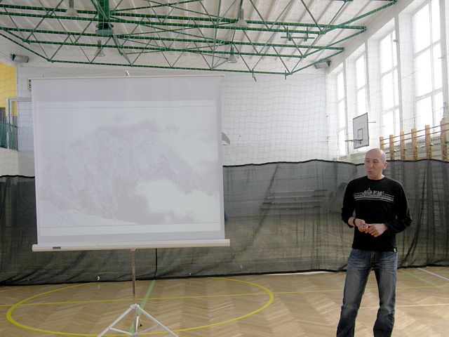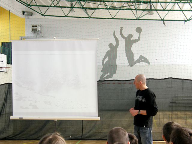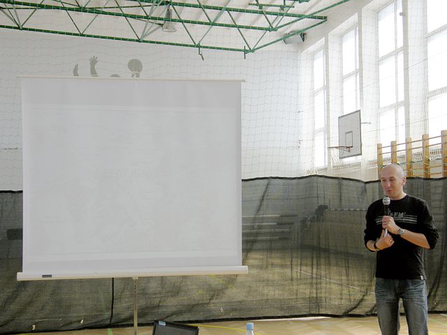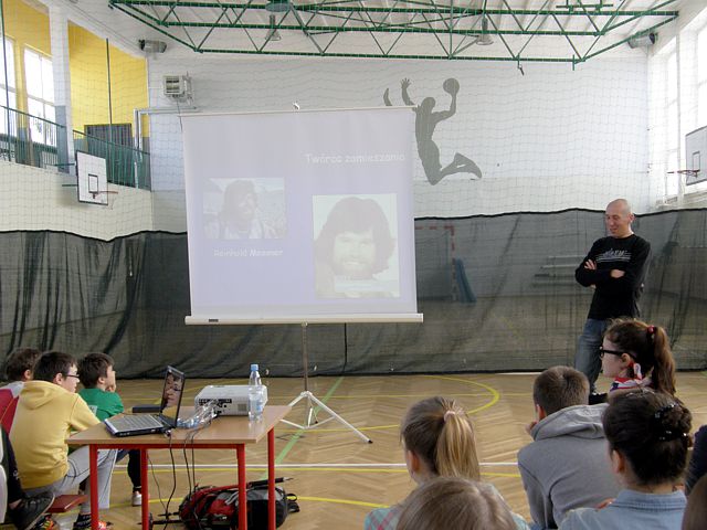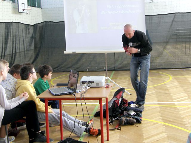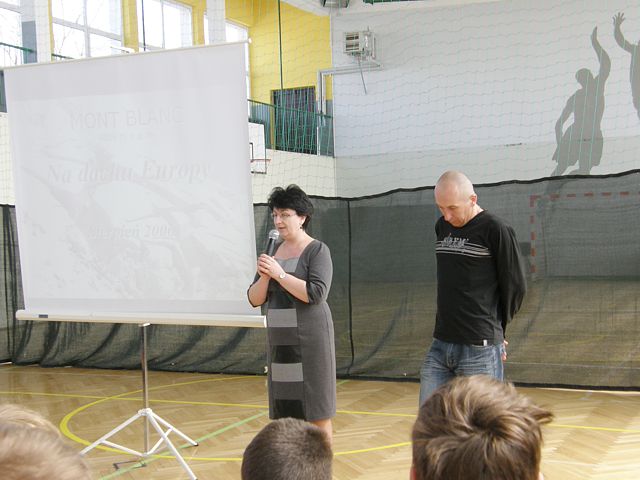 Pan Bartłomiej z pasją zaciekawił wszystkich uczestników spotkania opowieściami o swoich wyprawach a w swojej prezentacji multimedialnej pokazał, że to nie jest takie trudne by wybrać się w wymarzoną podróż i zdobywać szczyty marzeń. Zapoznał Nas z historią polskiego alpinizmu i wprowadził w cudowny lecz niebezpieczny świat Alp. Przewodnik zaprezentował historię i najciekawsze miejsca związane z Alpami. Opisywał swoje przygody z podróżyoraz wejście na najwyższy szczyt Mont Blanc, problemy jakie wiążą się z tak niebezpieczną wyprawą oraz poinformował o możliwościach i kosztach podróżowania. Uczniowie obejrzeli piękne fotografie z wyprawy w Alpy, szlaki górskie , które podróżnik pokonywał ze swoimi kolegami ze studiów, malownicze krajobrazy i próbował zarazić nas swoją pasją podróżowania. Spotkanie okazało się ciekawą formą popularyzacji turystyki i wiedzy o świecie. Cieszyło się sporym zainteresowaniem ze strony młodzieży, która po prelekcji zadawała jeszcze wiele pytań na temat przygotowywania się do wspinaczki na szczyty górskie jak i innych podróży po świecie. Po zakończeniu prelekcji uczniowie wzięli udział w konkursie związanym z tematyką geograficzną. Odpowiadali na krótkie pytania związane z treściami przedstawionymi na spotkaniu za co otrzymali symboliczne nagrody mini globusy, będące symbolem podróży po świecie.