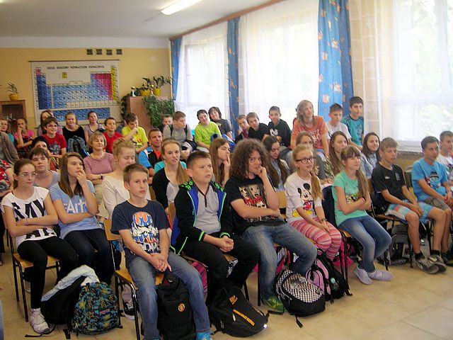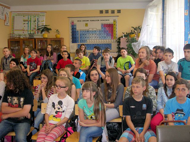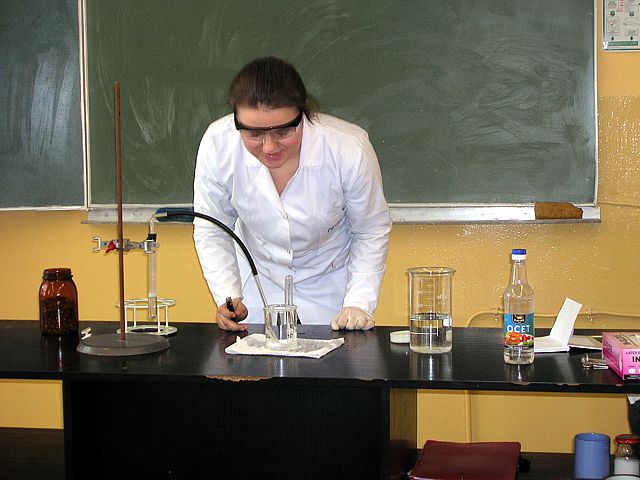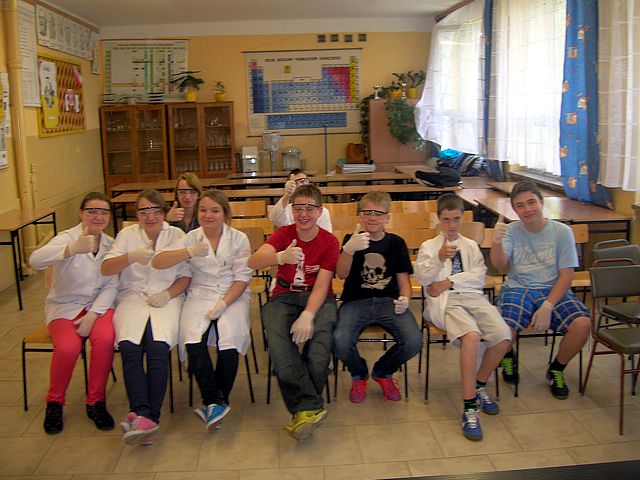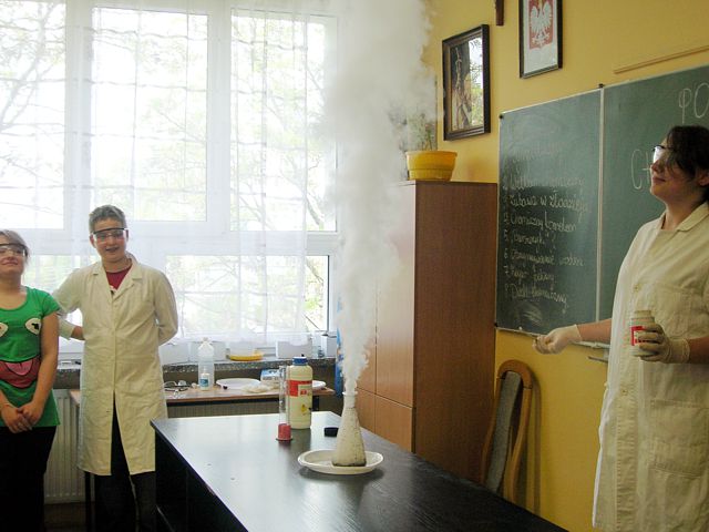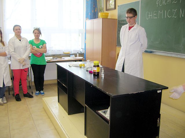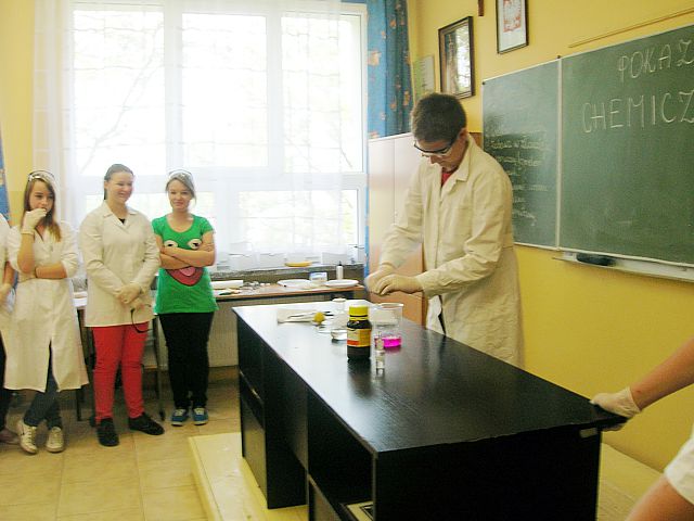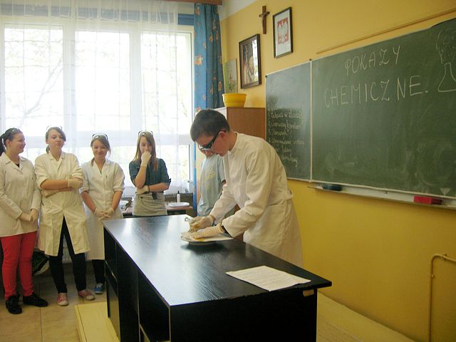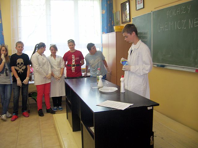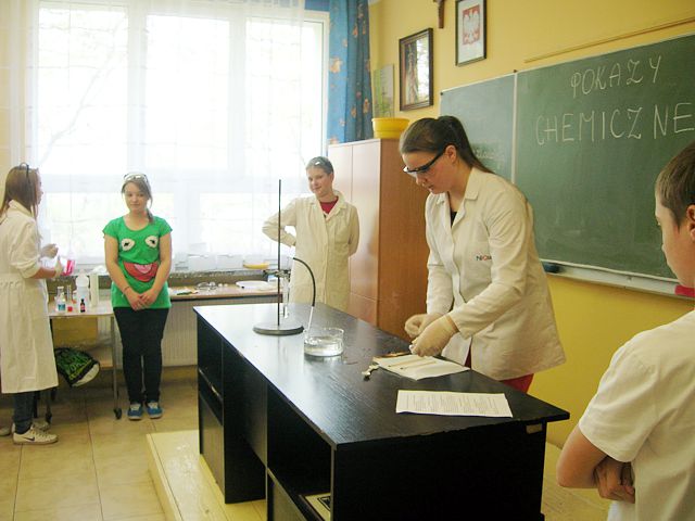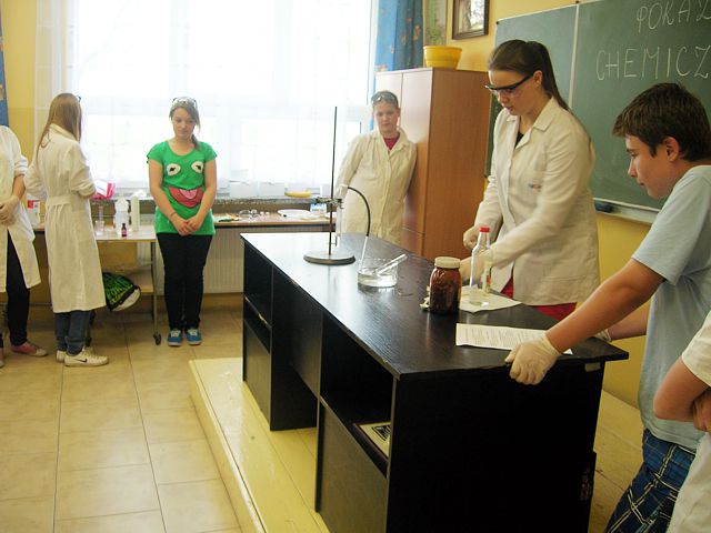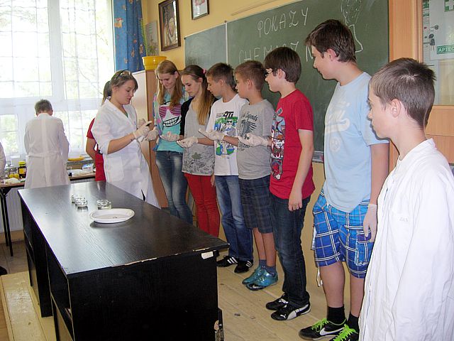 14 maja 2013 r. podczas zajęć koła chemicznego gościliśmy uczniów klas szóstych ze szkoły podstawowej. Spotkanie było okazją do zaprezentowanie umiejętności „młodych chemików” oraz przybliżenia młodszym kolegom tajników chemii. Pokazaliśmy, że nie ma się czego bać, a chemia postrzegana przez uczniów jako przedmiot trudny, jest ciekawa i bardzo efektowna.