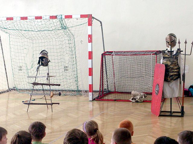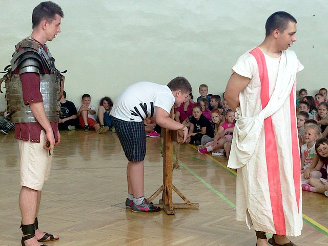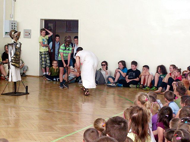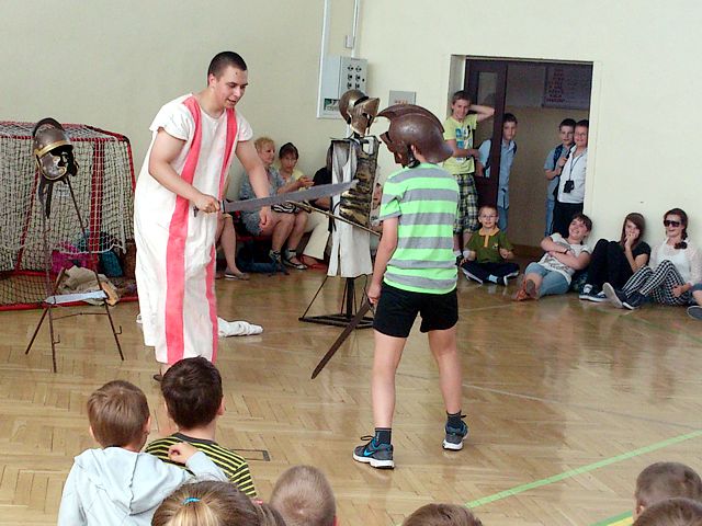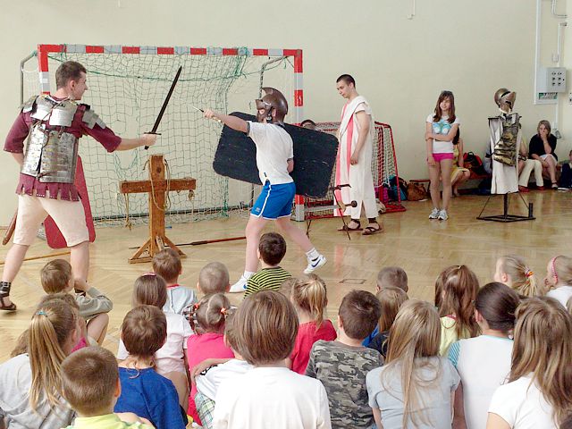 Aktorzy z grupy „Rekonstrukto” opowiedzieli o epoce rzymskiej, jej podbojach i upadku imperium. Podkreślili, jak wielkie znaczenie miała cywilizacja rzymska dla kształtowania się obecnego świata. W humorystyczny sposób zaprezentowali pokazy tortur i walk. Chętni uczniowie mogli sami wziąć udział w takim turnieju. Pokaz, który był żywą lekcją historii cieszył się dużym zainteresowaniem ze strony uczniów. Największą atrakcją stanowiło przymierzanie zbroi i osobiste obejrzenie rekwizytów. Gdyby nieograniczony czas, zapewne zabawom nie byłoby końca.