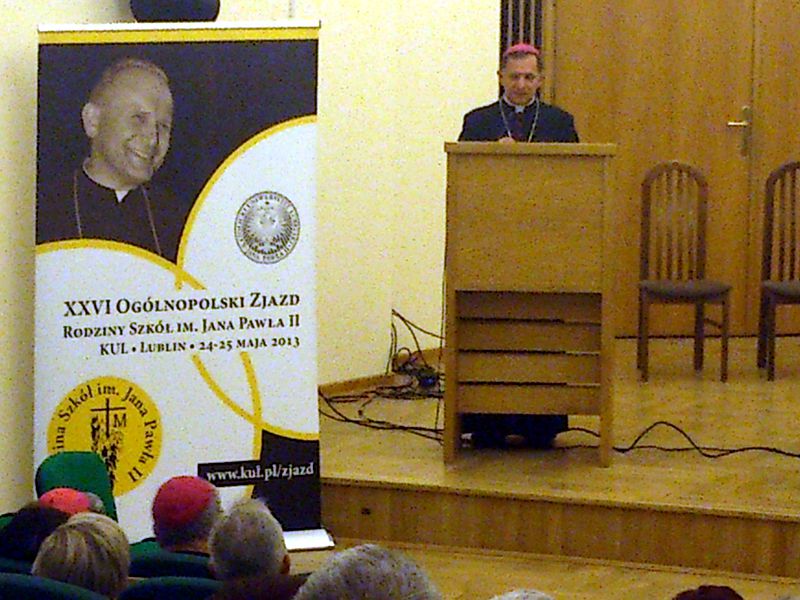 Uczestników zjazdu swoją obecnością zaszczycili: abp Stanisław Budzik metropolita lubelski, abp Mieczysław Mokrzycki metropolita lwowski, bp. Henryk Tomasik (ojciec duchowny Ogólnopolskiej Rodziny Jana Pawła II), Lubelski Kurator Oświaty Krzysztof Babisz, Przewodnicząca Społecznej Rady Rodziny Szkół Jana Pawła II Halina Marciniak oraz jej członkowie. Zaproszeni Goście powitali uczestników zjazdu, dzieląc się swoimi wspomnieniami związanymi z patronem naszych szkół Błogosławionym Ojcem Świętym Janem Pawłem II. W czasie obrad podano informacje dotyczące konkursu na znaczek XIII Ogólnopolskiej Pielgrzymki na Jasną Górę, która odbędzie się 9 października 2013r. Organizatorem konkursu jest szkoła w Zarzeczu. Grzegorz Gorczowski omówił sprawę relikwii błogosławionego Ojca Świętego Jana Pawła II, które będą nawiedzać wszystkie szkoły, a znajdować się będą na stałe w WSD w Radomiu. Zbigniew Masłoń z Torunia przypomniał o konkursie recytatorskim, który odbędzie się w nowym roku szkolnym 2013/2014. Zbigniew Gumiński zachęcał do wzięcia udziału w Pielgrzymce na Jasną Górę oraz do czuwania przy cudownym obrazie Matki Boskiej Częstochowskiej, wieczorem przed dniem pielgrzymki. Zachęcał do wzięcia udziału w konkursie na modlitwę za wstawiennictwem Bł. Jana Pawła II, która znajdzie się na pamiątkowym obrazku z okazji pielgrzymki. Będzie to modlitwa naszych szkół przed relikwiami naszego Patrona. Jolanta Nawrocka z Warszawy podsumowała zbiórkę na fundusz stypendialny dla zdolnej młodzieży Fundacji Dzieło Nowego Tysiąclecia.