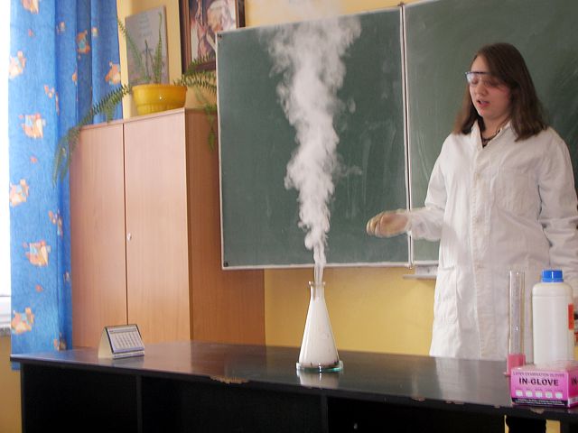 14 maja 2013 r. podczas zajęć koła chemicznego gościliśmy uczniów klas szóstych ze szkoły podstawowej. Spotkanie było okazją do zaprezentowanie umiejętności „młodych chemików” oraz przybliżenia młodszym kolegom tajników chemii. Pokazaliśmy, że nie ma się czego bać, a chemia postrzegana przez uczniów jako przedmiot trudny, jest ciekawa i bardzo efektowna.