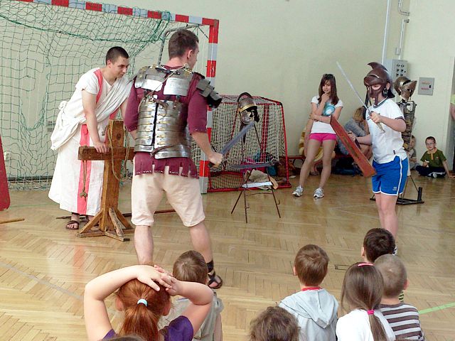 9 maja br. starsi i młodsi uczniowie naszej szkoły mogli obejrzeć pokaz historyczny w wykonaniu Grupy Artystycznej „Rekonstrukto” z Lublina nt. „Rzymskie Imperium i tradycje antyku”. Dla Młodych była to żywa lekcja historii. Mogli zobaczyć jak wyglądało uzbrojenie legionisty w I w. n.e