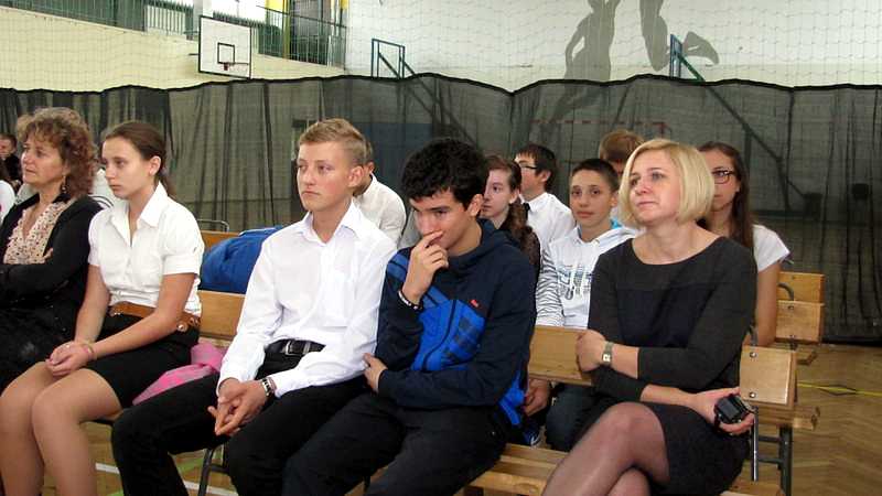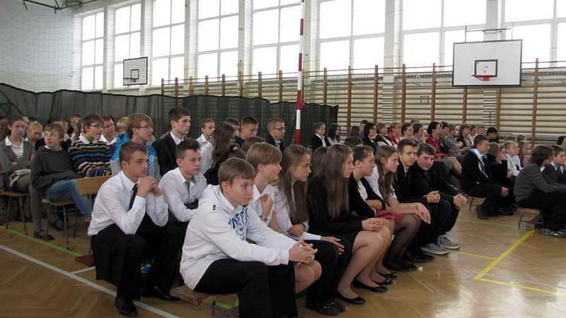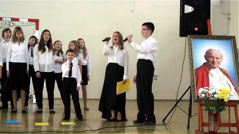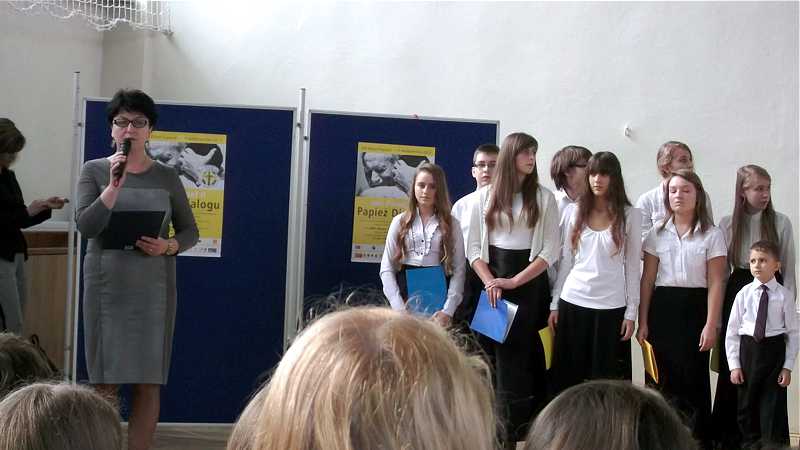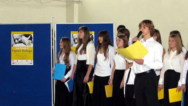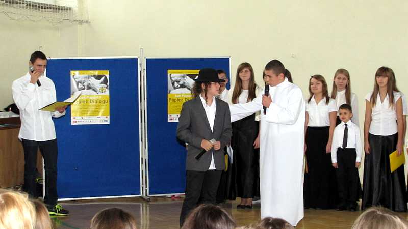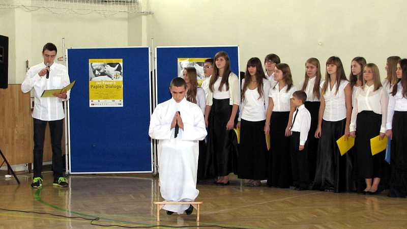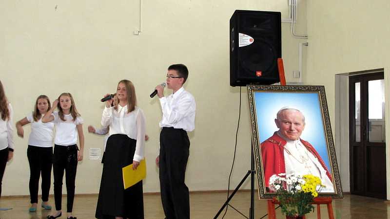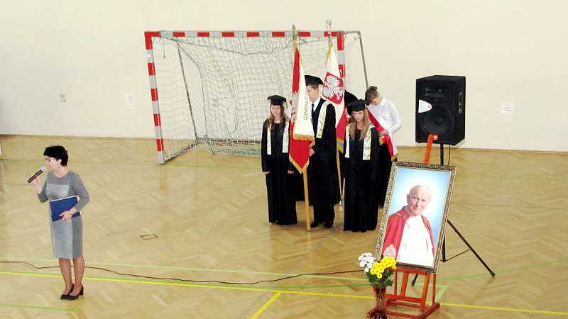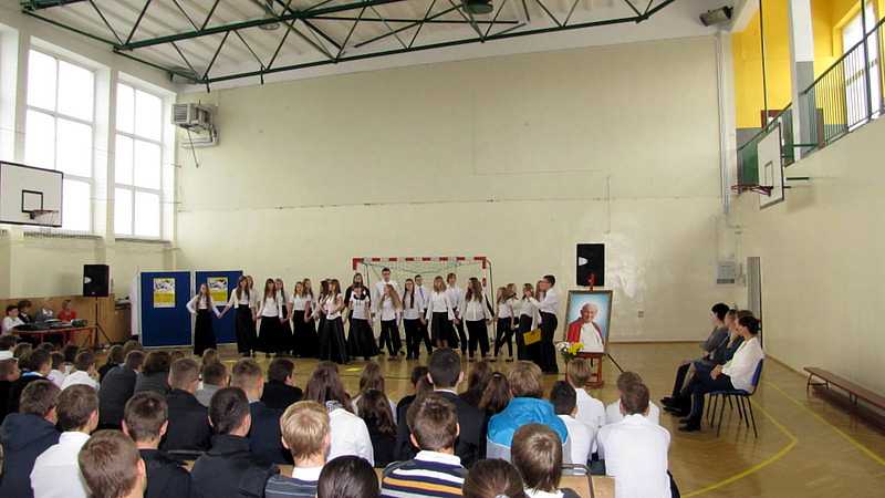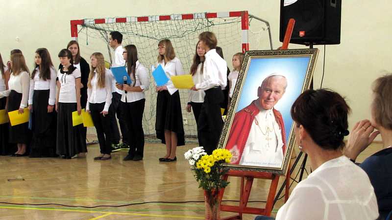 Po powrocie do szkoły, na godzinie wychowawczej przybliżono sylwetkę papieża. O godzinie 10.30 na sali gimnastycznej pani dyrektor Danuta Krawczuk przywitała wszystkich uczniów, nauczycieli i gości , którzy przyjęli nasze zaproszenie: Przewodniczącą Rady Rodziców panią Beatę Pakos i Naczelnika Wydziału Oświaty, Kultury i Sportu przy Urzędzie Miasta pana Szymona Patkowskiego. W swoim przemówieniu przypomniała postać bł. Bożego Jana Pawła II jako mistrza dialogu, który rozumiał młodych, lubił ich towarzystwo i pokazał, jak mamy rozmawiać, jak prowadzić dialog. Zwróciła szczególną uwagę na słowa Wielkiego Papieża kierowane do młodzieży: „Wy jesteście przyszłością świata! Wy jesteście nadzieją Kościoła! Wy jesteście moją nadzieją”.