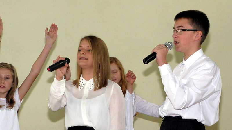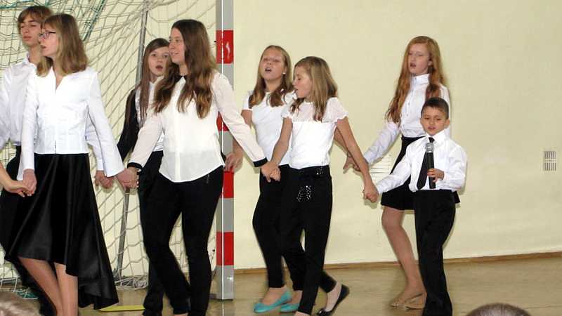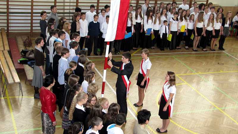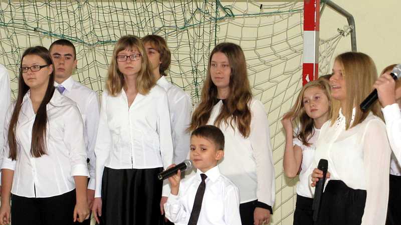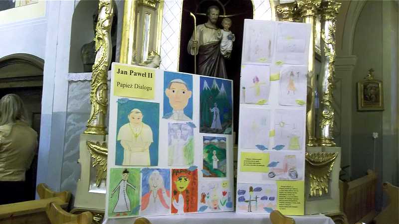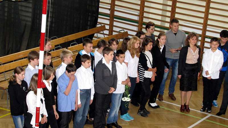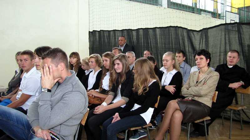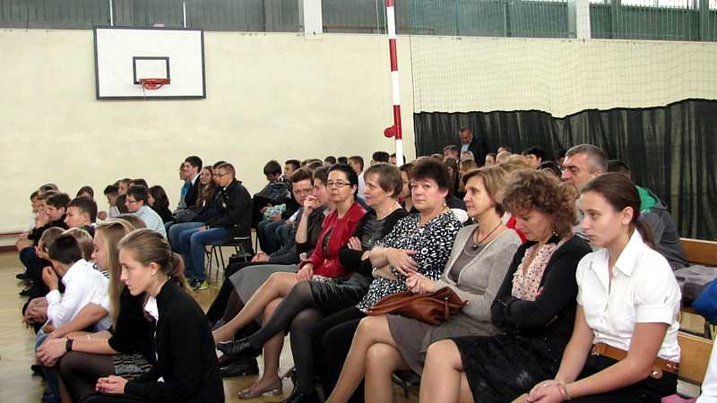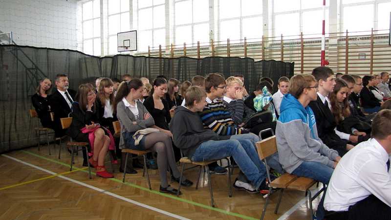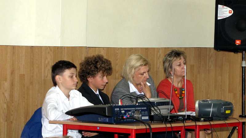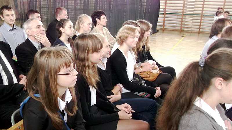 Po powrocie do szkoły, na godzinie wychowawczej przybliżono sylwetkę papieża. O godzinie 10.30 na sali gimnastycznej pani dyrektor Danuta Krawczuk przywitała wszystkich uczniów, nauczycieli i gości , którzy przyjęli nasze zaproszenie: Przewodniczącą Rady Rodziców panią Beatę Pakos i Naczelnika Wydziału Oświaty, Kultury i Sportu przy Urzędzie Miasta pana Szymona Patkowskiego. W swoim przemówieniu przypomniała postać bł. Bożego Jana Pawła II jako mistrza dialogu, który rozumiał młodych, lubił ich towarzystwo i pokazał, jak mamy rozmawiać, jak prowadzić dialog. Zwróciła szczególną uwagę na słowa Wielkiego Papieża kierowane do młodzieży: „Wy jesteście przyszłością świata! Wy jesteście nadzieją Kościoła! Wy jesteście moją nadzieją”.