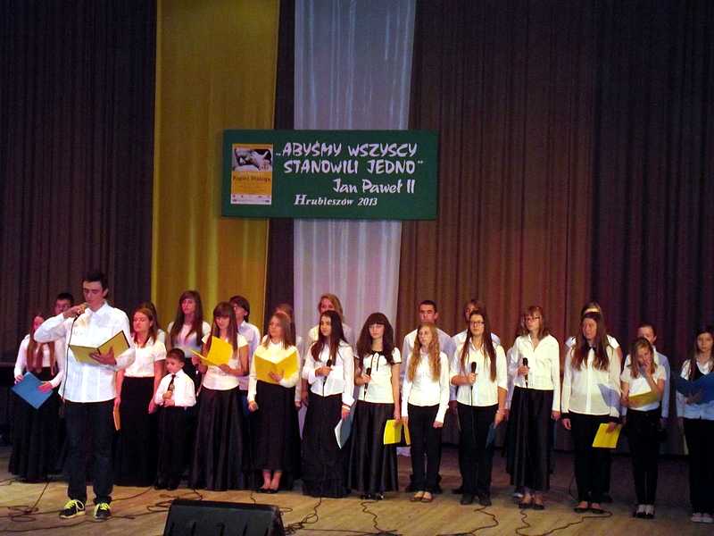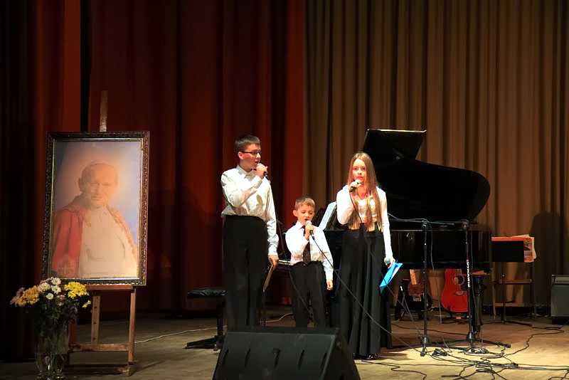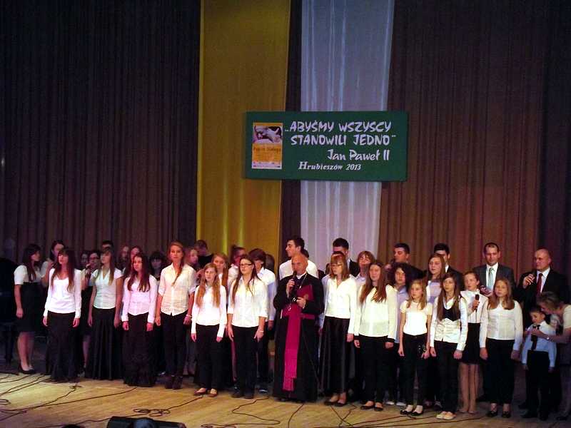 20 października br. w Hrubieszowskim Domu Kultury odbył się uroczysty koncert w hołdzie błogosławionemu Janowi Pawłowi II. Salę wypełnili mieszkańcy Hrubieszowa, nauczyciele, uczniowie. Swoją obecnością zaszczycili: Ks. Dziekan Wiesław Oleszek, Proboszcz Parafii św. Mikołaja, Zastępca Burmistrza Paweł Perelmuter, dyrektor Zespołu Szkół Miejskich nr 3 Danuta Krawczuk.