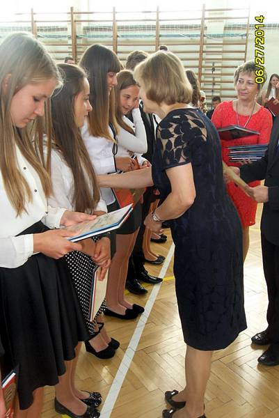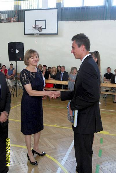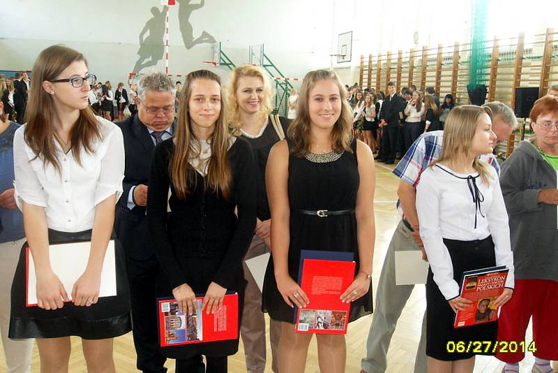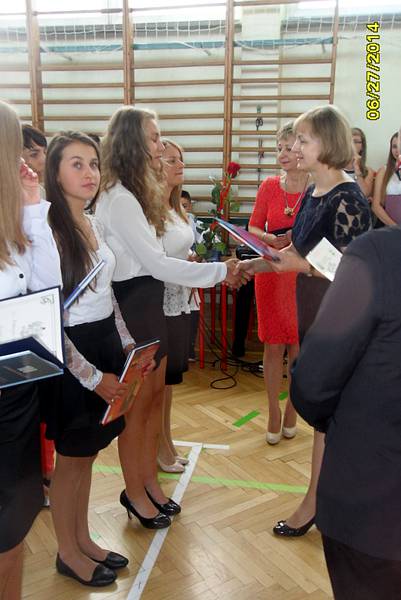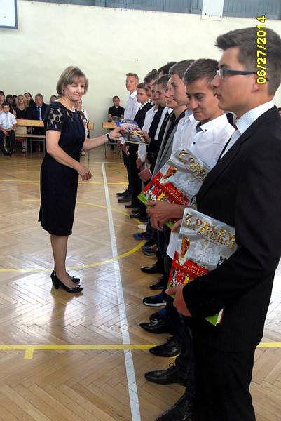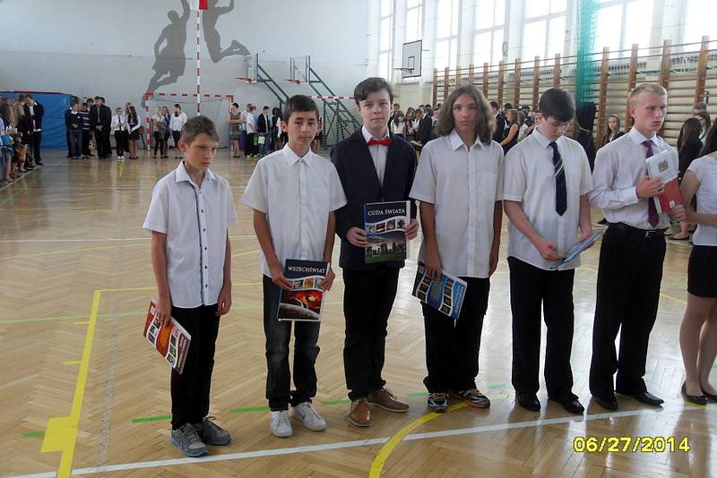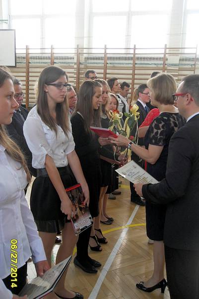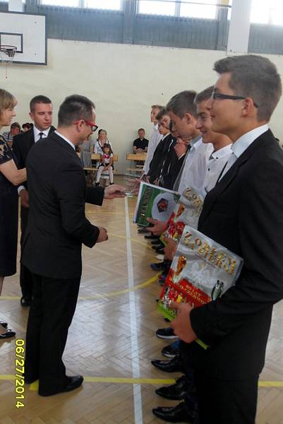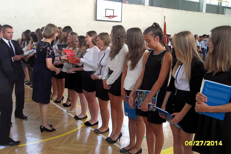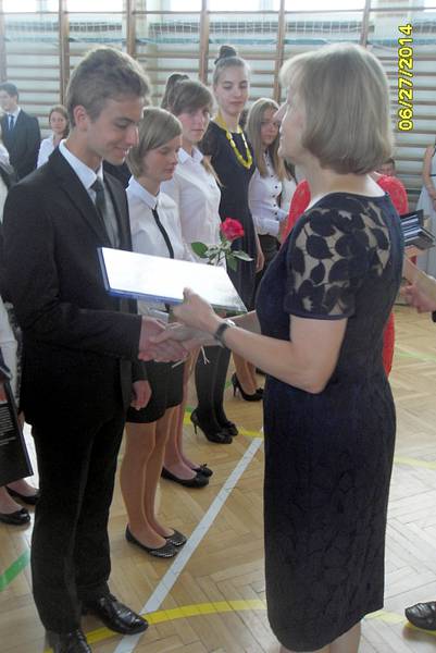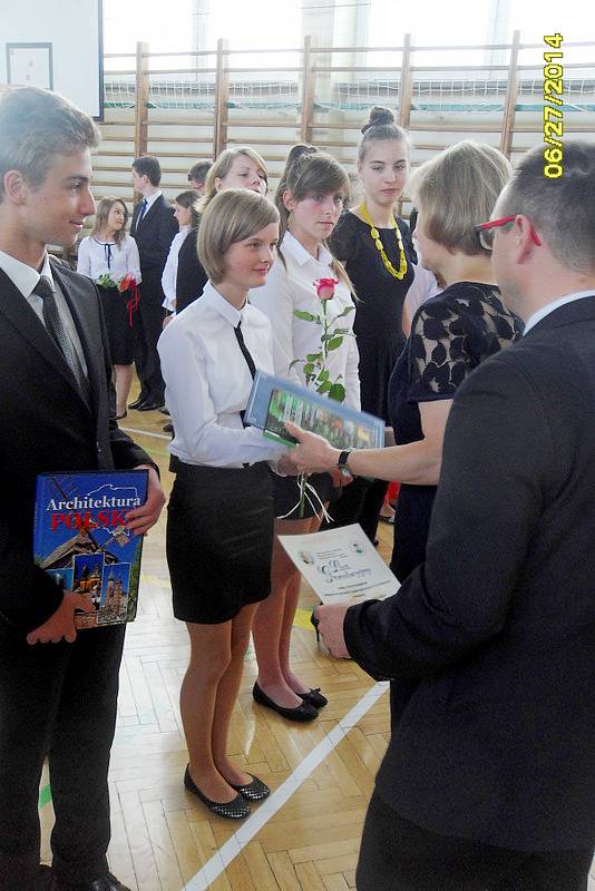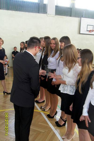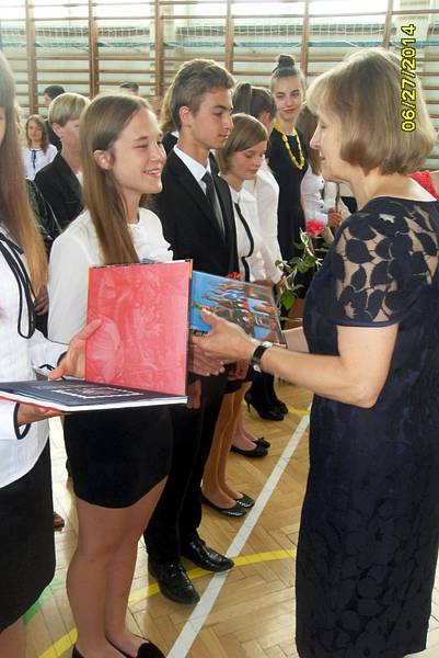 Na zakończenie uroczystości uczniowie otrzymali nagrody książkowe i dyplomy za wyniki w nauce, osiągnięcia w sporcie, w konkursach przedmiotowych i artystycznych, za działalność społeczną, charytatywną oraz zaangażowanie w agendach uczniowskich. Nagrody ufundowane zostały przez Radę Rodziców, za które p. dyrektor złożyła podziękowanie obecnej na uroczystości przewodniczącej Rady Rodziców p. Beacie Pakos.