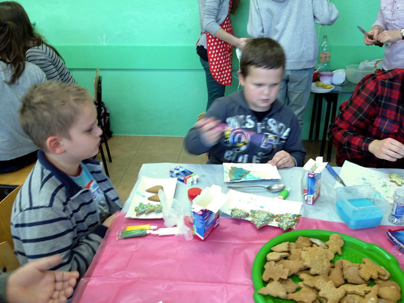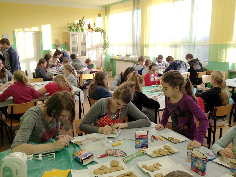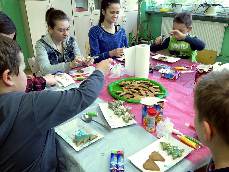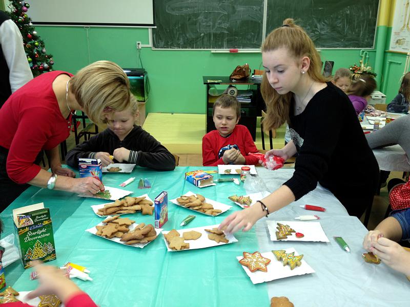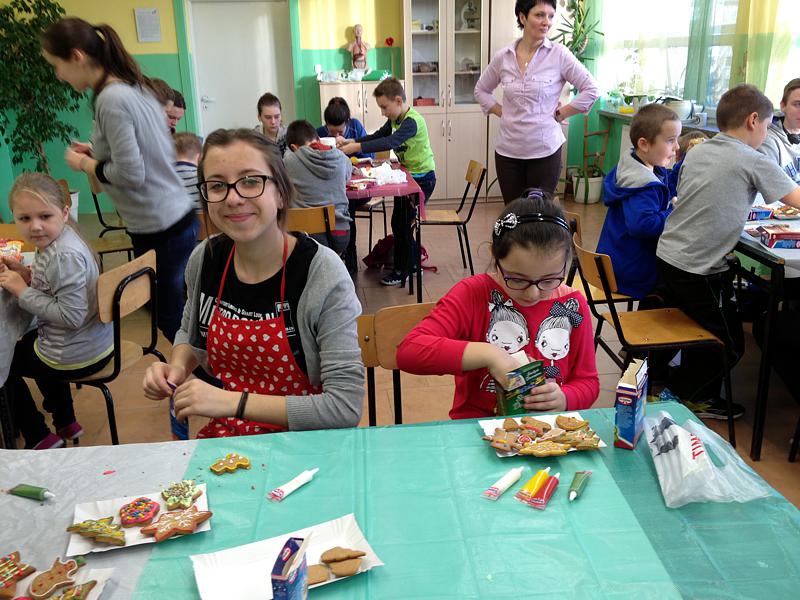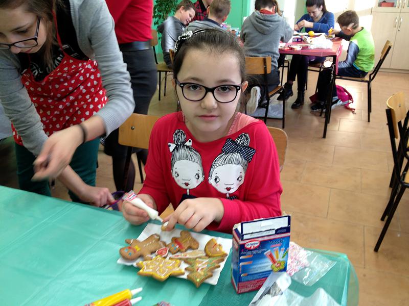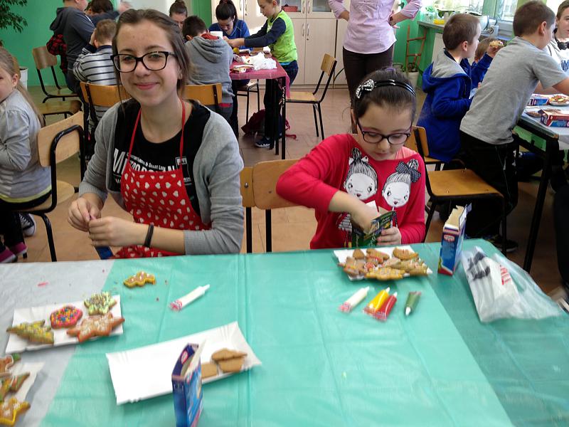 W grudniu w naszej szkole zapachniało pierniczkami. Wszystko za sprawą inicjatywy Szkolnego Klubu Europejskiego. Uczniowie kasy II b i III c gimnazjum przygotowali dla swoich młodszych koleżanek i kolegów ze szkoły podstawowej słodką niespodziankę – zdobienie pierniczków. Jest to jedno z najbardziej ulubionych przez dzieci zajęć poprzedzających Boże Narodzenie, stąd pomysł został przyjęty z dużym zadowoleniem.