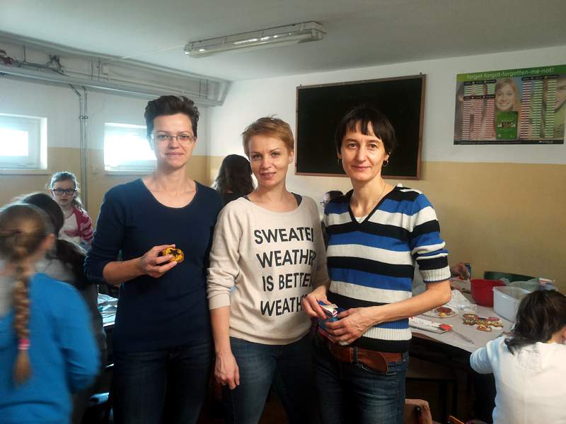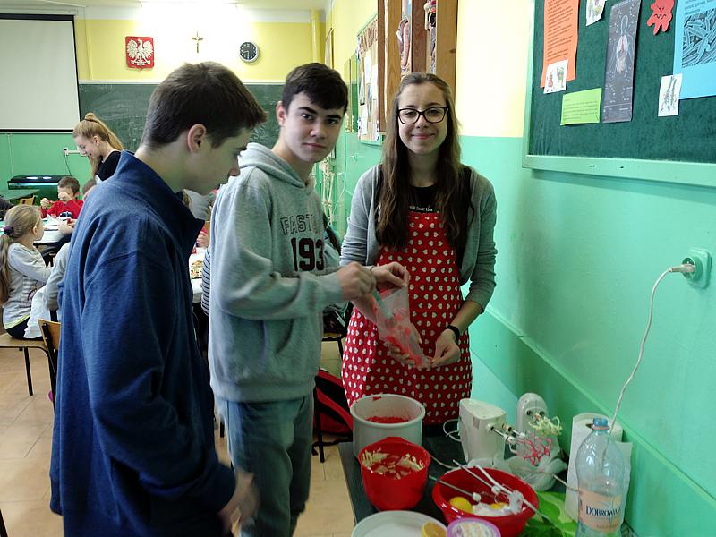 Gimnazjaliści samodzielnie upiekli ciasteczka, po czym zaprosili uczniów z kl. II b i IV b wraz z wychowawczyniami. Swoimi radami wspierała młodych cukierników zaproszona p. Agnieszka Strzelecka – właścicielka cukierni „Kraina ciast i tortów”. Zdobienie pierniczków przyniosło wiele radości nie tylko młodszym, ale i starszym uczniom naszej szkoły.