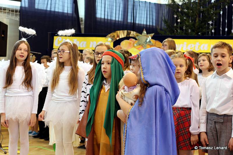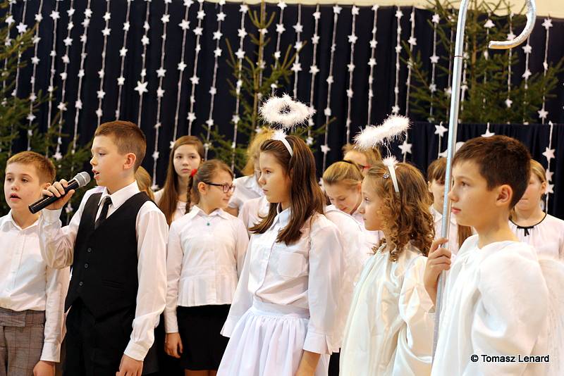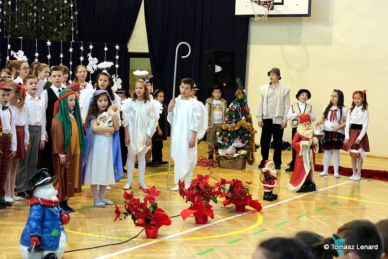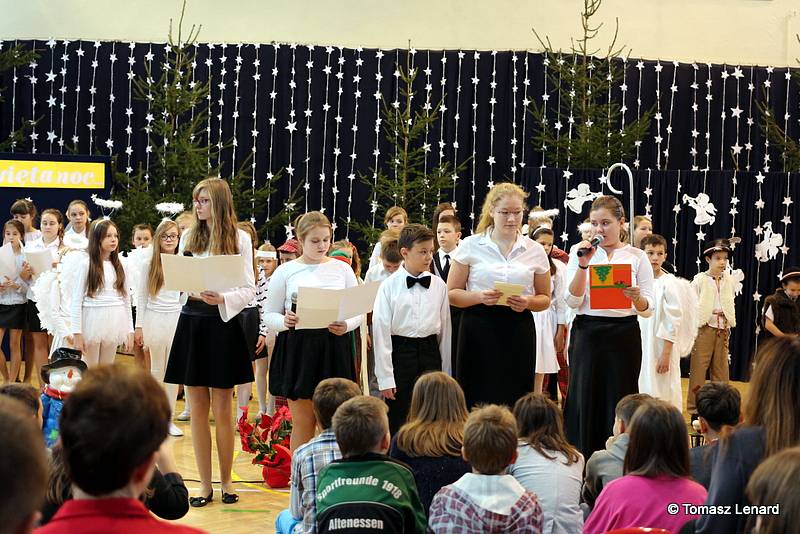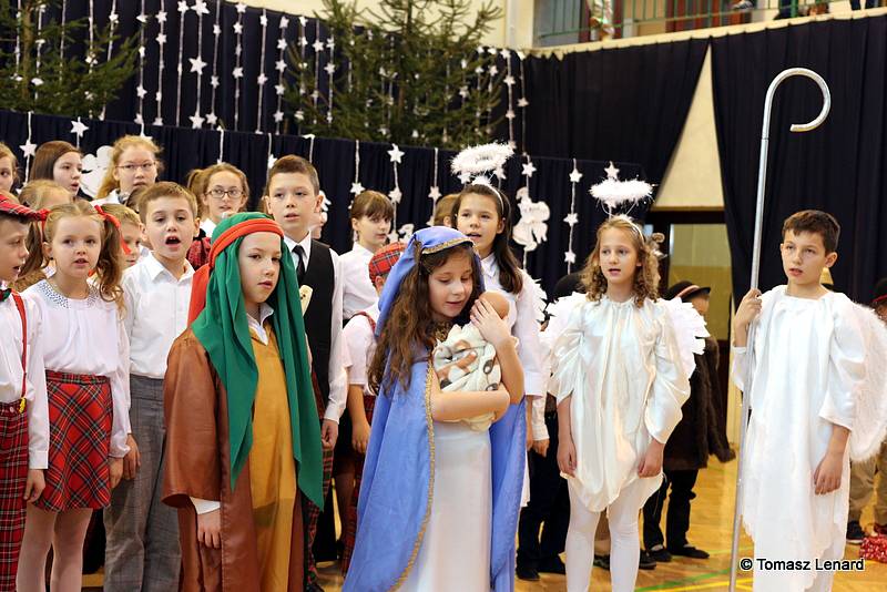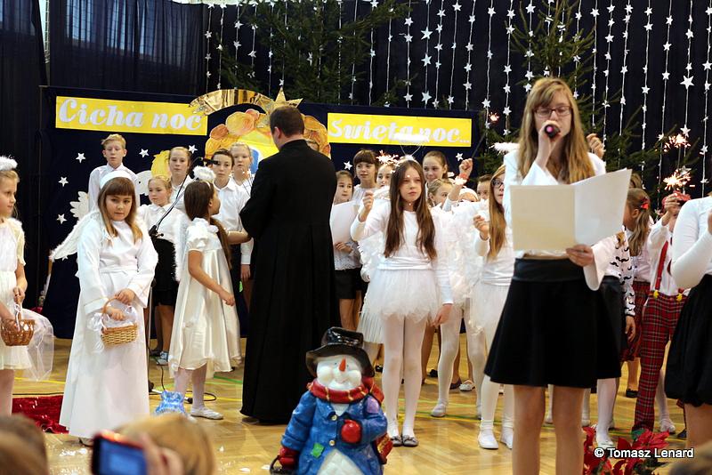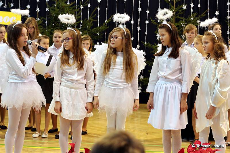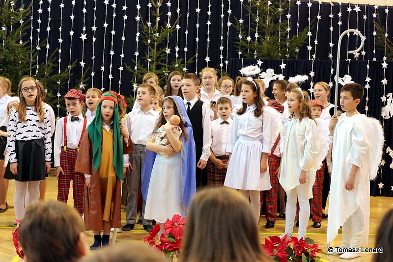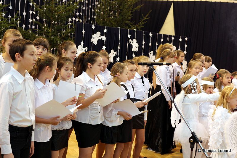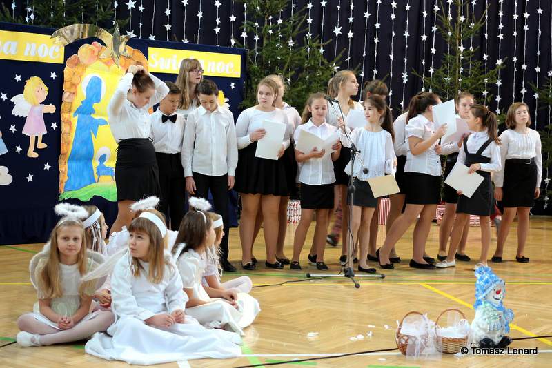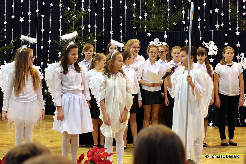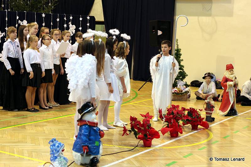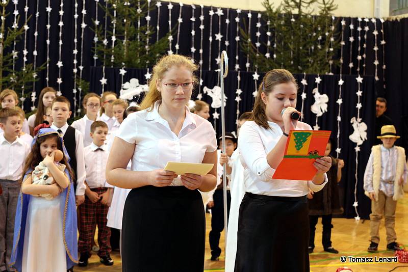 Był także okazją do spotkań z drugim człowiekiem w życzliwości, dobroci, serdeczności, której tak często nam brakuje w naszej codzienności. Klasy II a z wychowawczynią panią Agnieszką Handziuk i IV a z wychowawczynią panią Justyną Marcych przy współpracy księdza Pawła Kubiszyna oraz chóru szkolnego, którego opiekunem jest pani Aneta Franke przygotowały świąteczne przedstawienie.