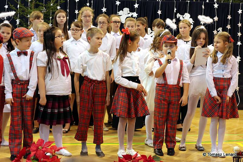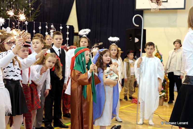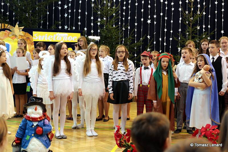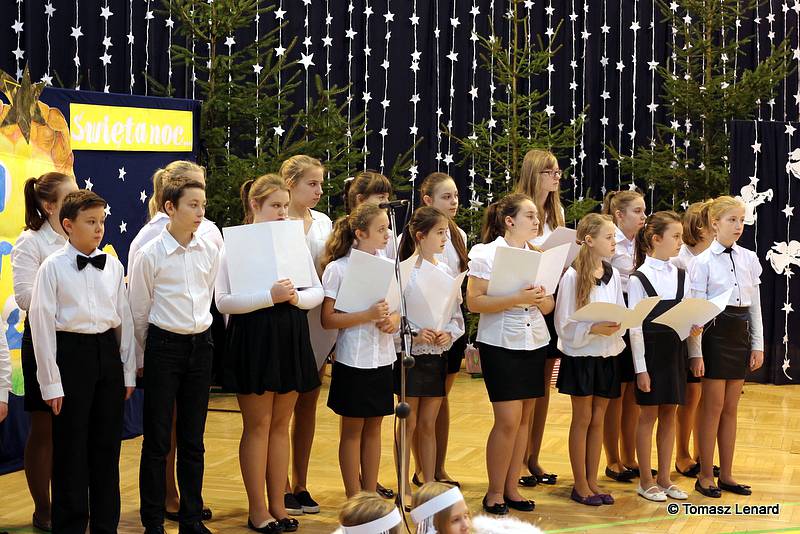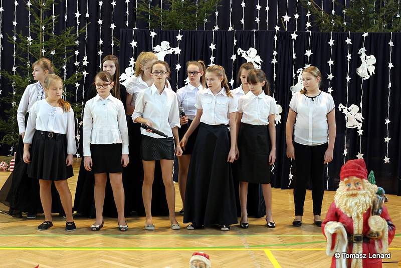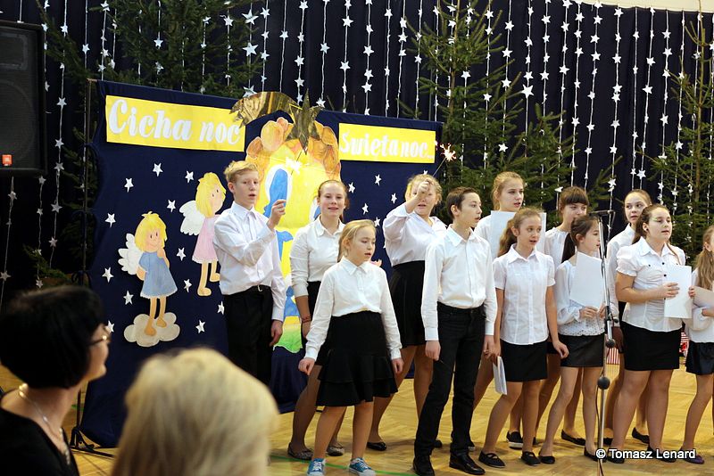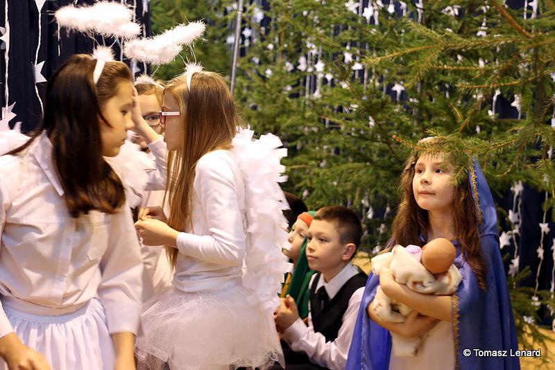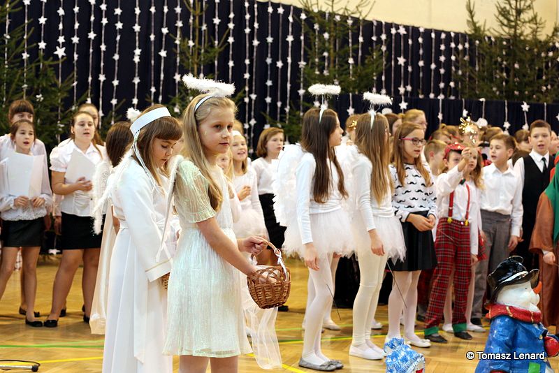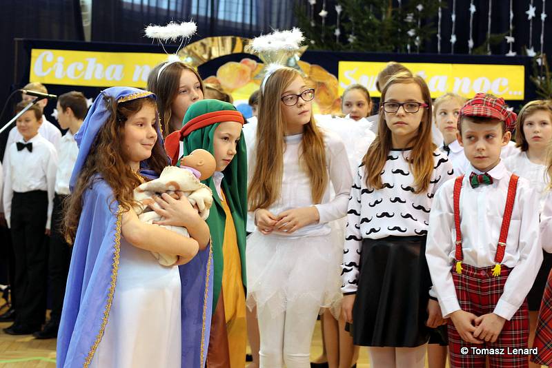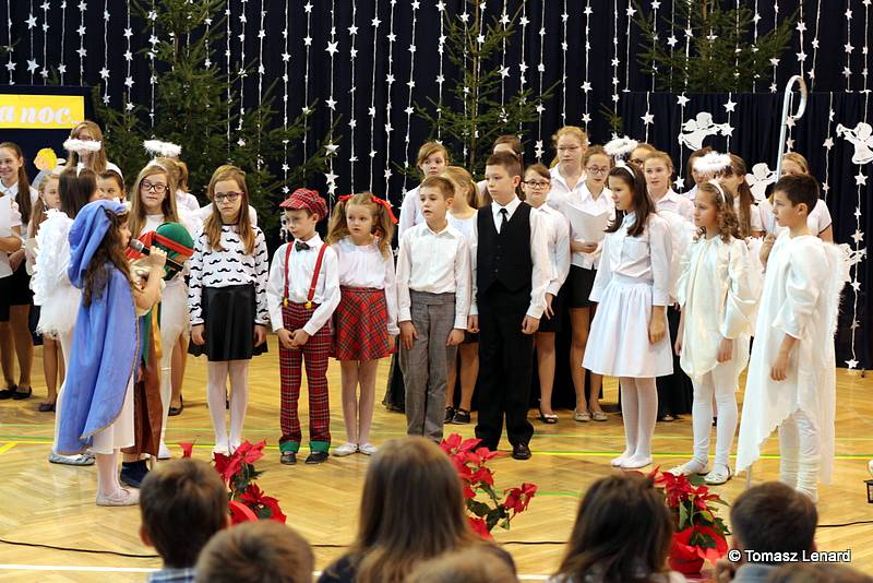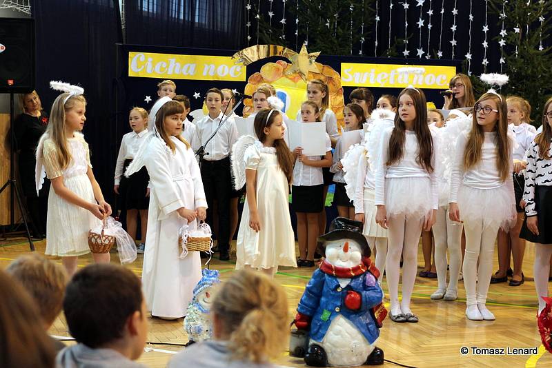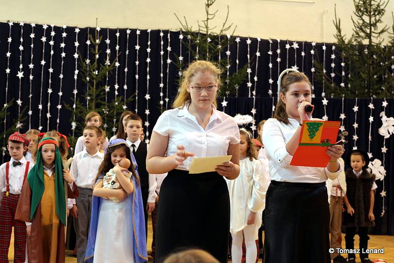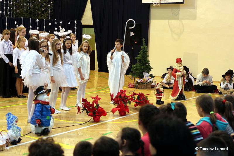 Był także okazją do spotkań z drugim człowiekiem w życzliwości, dobroci, serdeczności, której tak często nam brakuje w naszej codzienności. Klasy II a z wychowawczynią panią Agnieszką Handziuk i IV a z wychowawczynią panią Justyną Marcych przy współpracy księdza Pawła Kubiszyna oraz chóru szkolnego, którego opiekunem jest pani Aneta Franke przygotowały świąteczne przedstawienie.