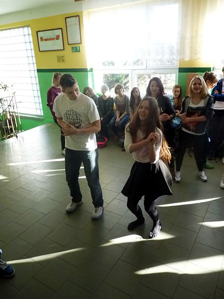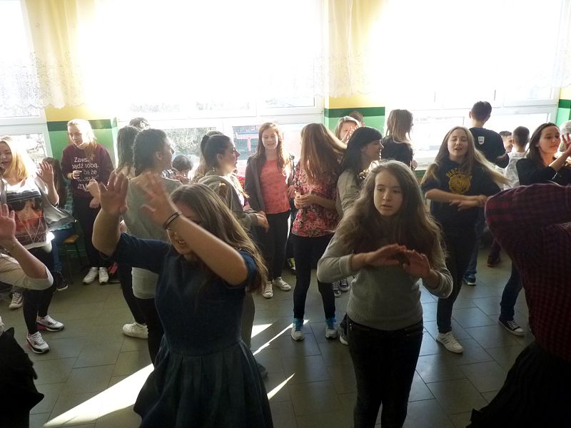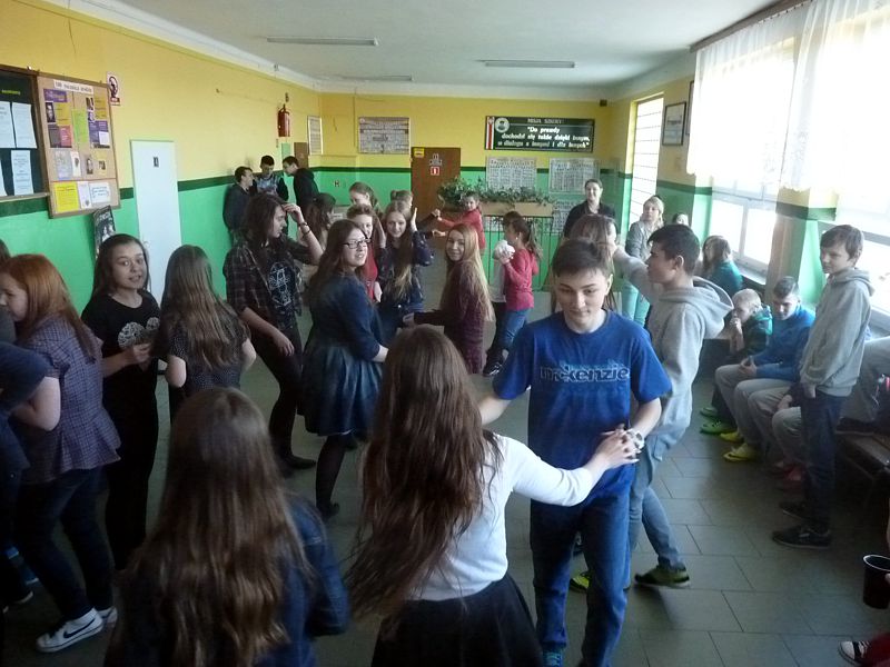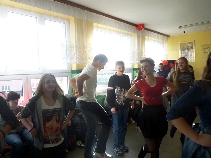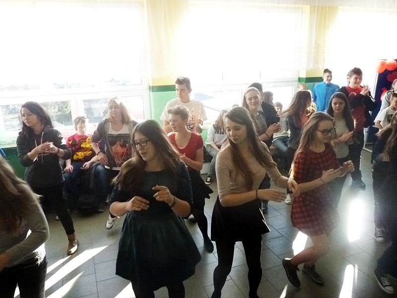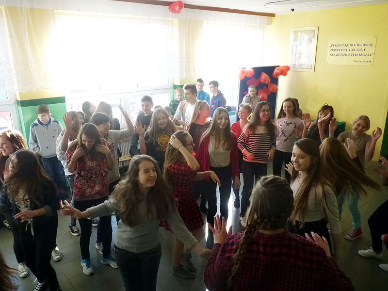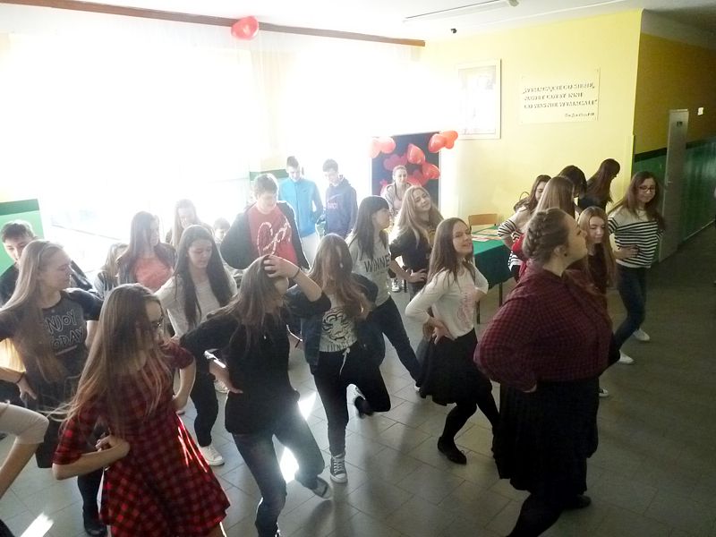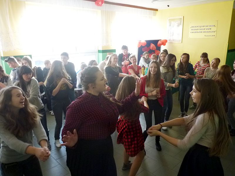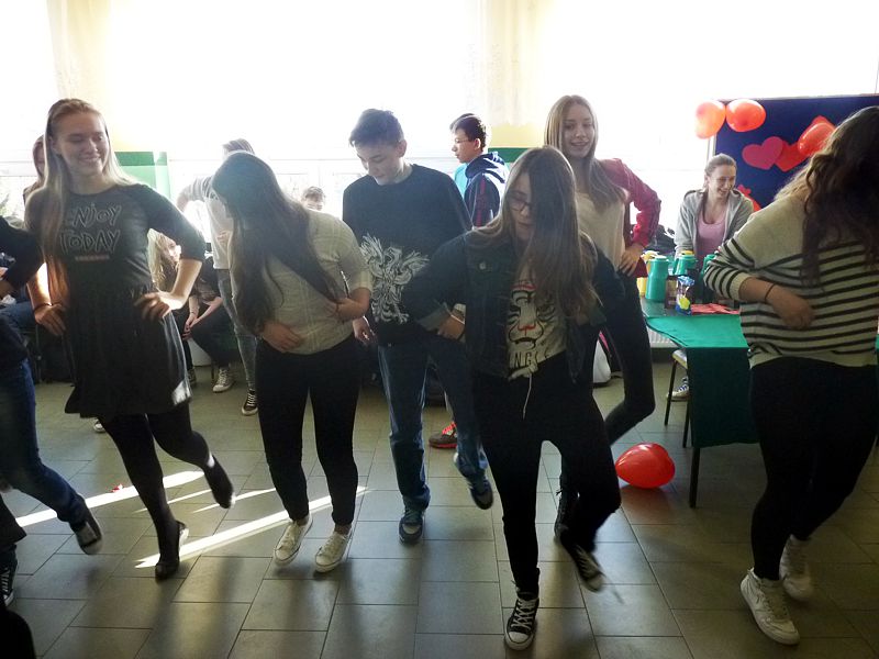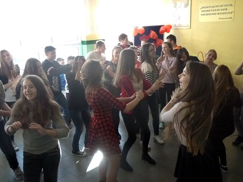 Doskonałym tłem dla tego przedsięwzięcia była piękna walentynkowa dekoracja oraz muzyka, która towarzyszyła uczniom oraz nauczycielom na każdej przerwie. Jednak jak się później okazało, takich przerw jak tego dnia jeszcze nigdy nie było w naszej szkole. Już na pierwszej przerwie Samorząd zaprosił wszystkich uczniów do wspólnego odtańczenia skrzypka i tańca belgijskiego, które w naszym szkole można by już chyba nazwać tradycją. I tak w jednej chwili korytarz szkolny zamienił się w parkiet taneczny. Nie zaprzestaliśmy jednak na tym. Po każdym dzwonku oznaczającym przerwę rozbrzmiewała coraz to nowa piosenka i kolejne osoby dołączały się do świetnej zabawy. 17 luty można zdecydowanie nazwać dniem udanym, a nasze szkolne walentynki, choć trochę spóźnione, na pewno nie pozostaną łatwo zapomniane.