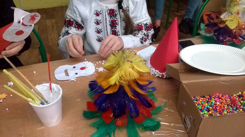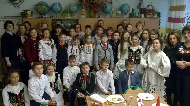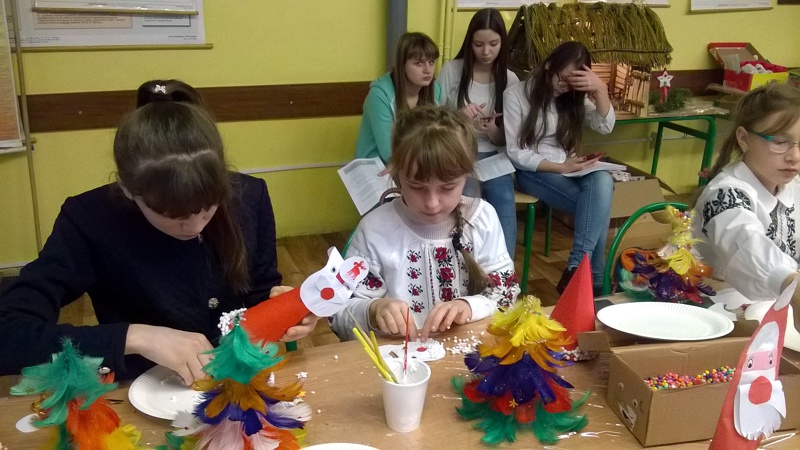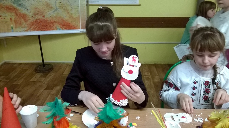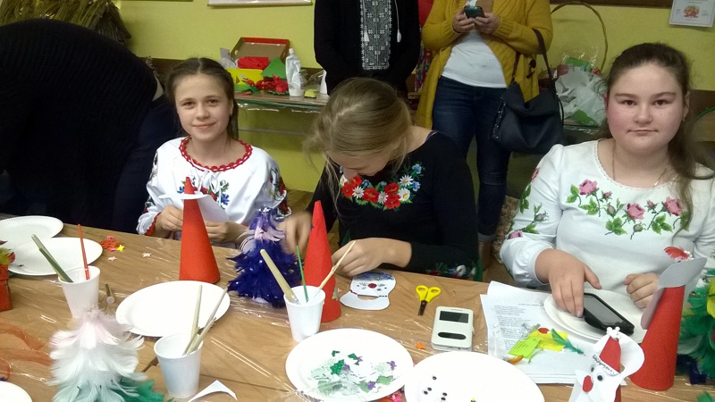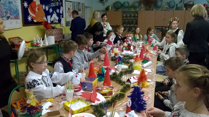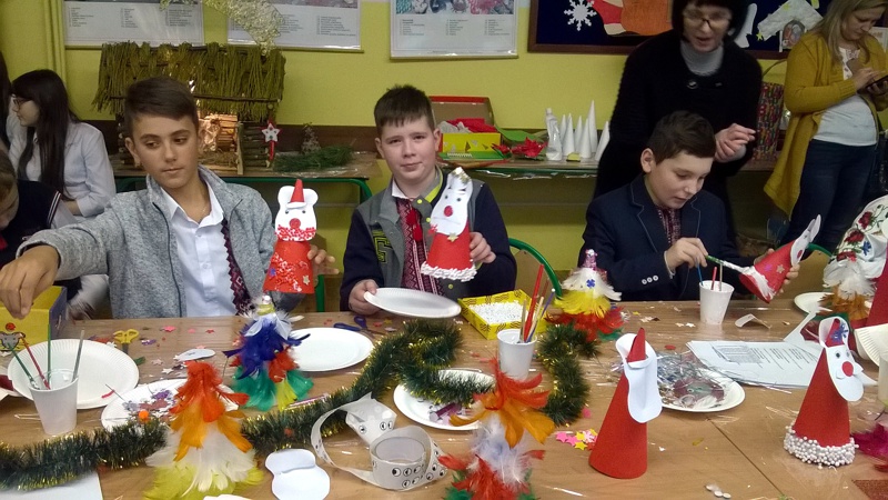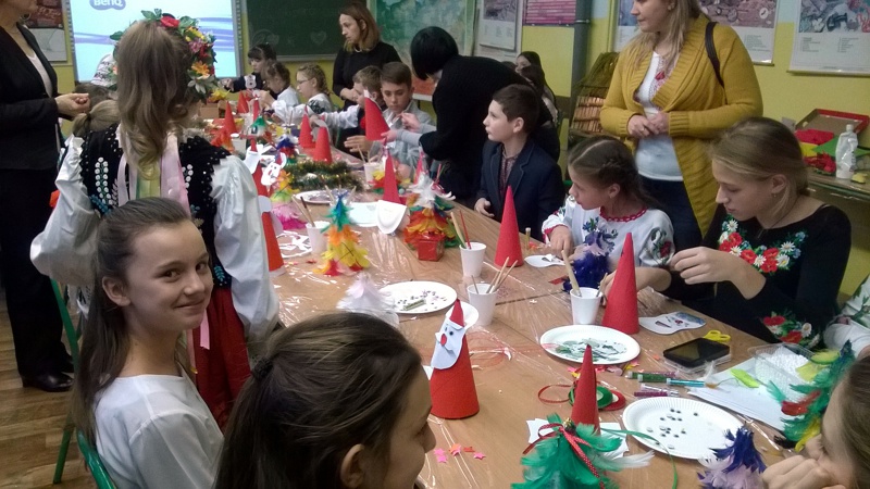 Po powrocie nasi goście wraz z grupą uczniów klasy IV a: Zuzanną Tychmańską, Oleksandrą Schymchuk, Patrycją Zając, Julią Kaniugą, Karolem Grzeszczukiem, Bartoszem Pawelcem, Mikołajem Patkowskim, Bartoszem Brzóską, Filipem Padkowskim, przedstawicielami Samorządu Uczniowskiego Kingą Frąc Martyną Wiśniewską, Dominiką Czupryńską, Julią Kopczyńską, Olgą Śmietanką, Mariją Sachuk, Martą Markiewicz, Aleksandrą Kędzierą, Agatą Łabą i Sylwią Walencik wraz z panią Justyną Marcych i Danielem Lipskim wzięli udział w bożonarodzeniowych warsztatach artystycznych prowadzonych przez panią Agnieszkę Handziuk nauczyciela naszej szkoły. Spotkanie było okazją do poznania polskich i ukraińskich tradycji bożonarodzeniowych, wspólnego śpiewania kolęd oraz wyzwolenia twórczego potencjału dzieci. Uczniowie naszej szkoły w strojach ludowych zwrócili uwagę na piękne, tradycyjne, wyszywane koszule z bufiastymi koszulami, zwane soroczki, w które ubrani byli Goście. Na Ukrainie Rizdwo Chrystowe (Boże Narodzenie) obchodzone jest w dniach 7-9 stycznia. W przeddzień tych świąt obchodzi się Świat-Weczir. W tym dniu, podobnie jak w chrześcijańską Wigilię, czeka się na pierwsza gwiazdkę, a potem zsiada się do stołu, na którym powinno znajdować się dwanaście postnych potraw.