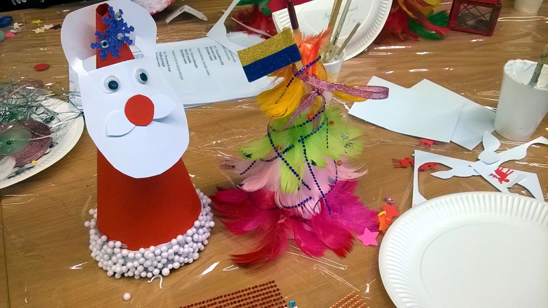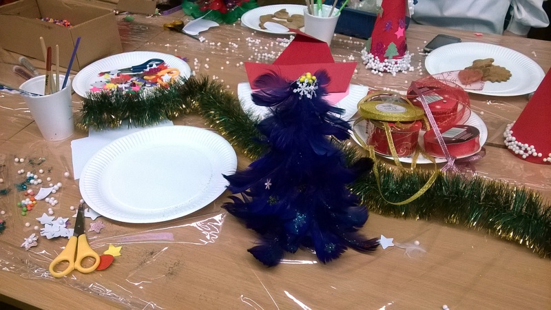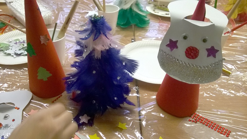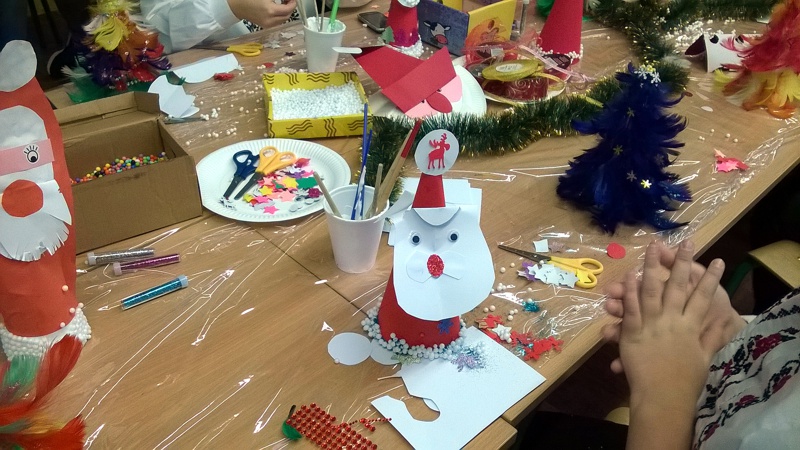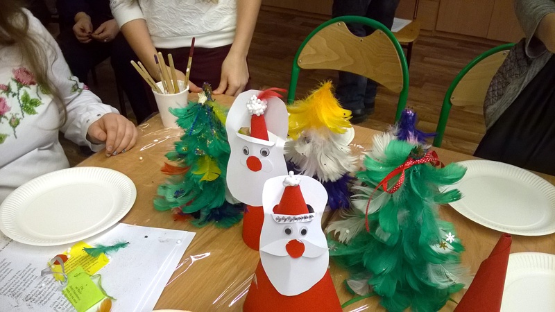 W radosnej atmosferze uczestnicy warsztatów mieli możliwość indywidualnego i swobodnego wypowiadania się, tworzenia i wspólnego kolędowania, Efektami twórczej zabawy były kolorowe choineczki z piórek, Mikołaje oraz lukrowane samodzielnie pachnące cynamonem pierniczki. Świąteczne stroiki, piękna szopka i kolorowa choinka wszystkich wprowadziły w bożonarodzeniowy nastrój.