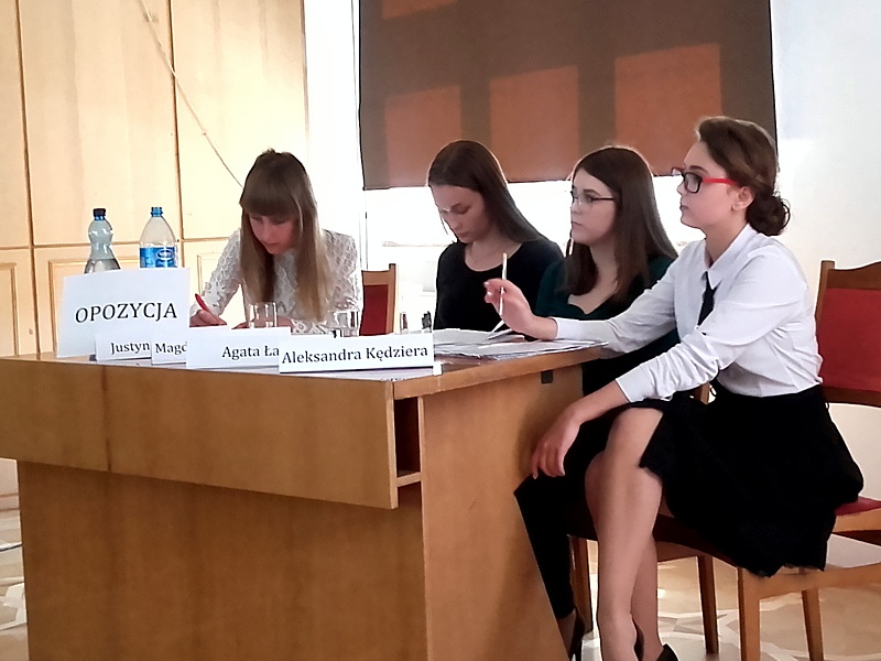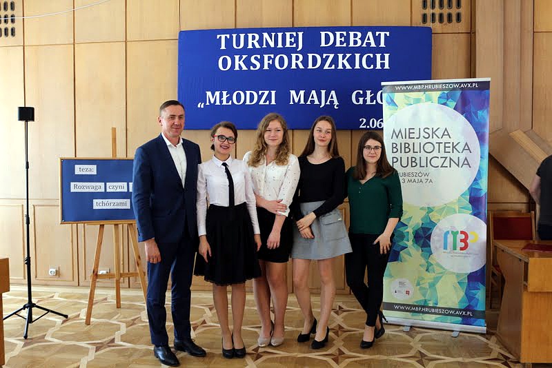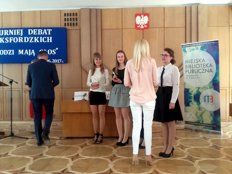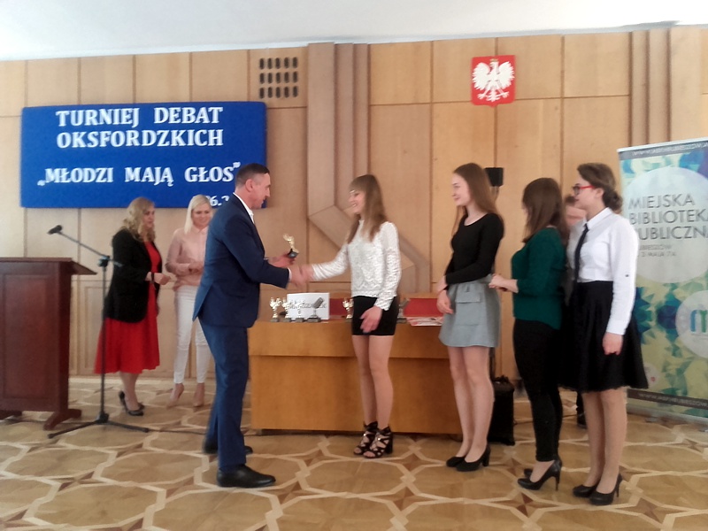 2 czerwca odbył się w HDK Turniej Debat Oksfordzkich. Wydarzenie to zorganizowane było przez nieformalną grupę młodych POBUDZENI a patronat objął Burmistrz Miasta Tomasz Zając. Naszą szkołę reprezentowały przedstawicielki Samorządu Uczniowskiego: Agata Łaba, Aleksandra Kędziera, Justyna Szlonzak oraz Magdalena Chrząstek. Temat debaty brzmiał „Rozwaga czyni ludzi tchórzami”. Perfekcyjne przygotowanie oraz wielkie emocje jakie budziły wypowiedzi dziewcząt przesądziły o wygranej. Nasza drużyna otrzymała tytuł Najlepszej Drużyny Turnieju Debat Oksfordzkich w kategorii gimnazjum. Mikrofon Najlepszego Mówcy Turnieju w tej kategorii otrzymała Aleksandra Kędziera z klasy III A.