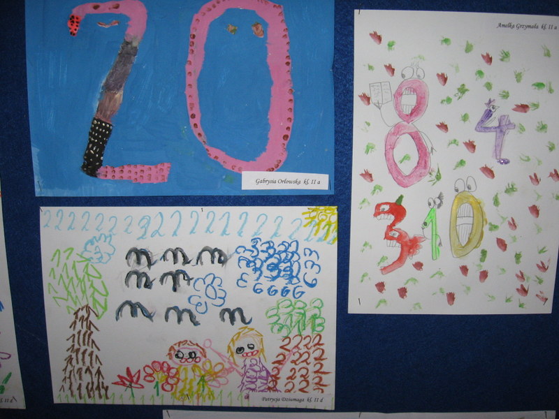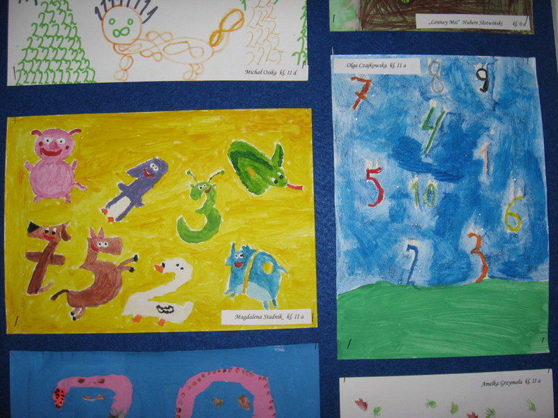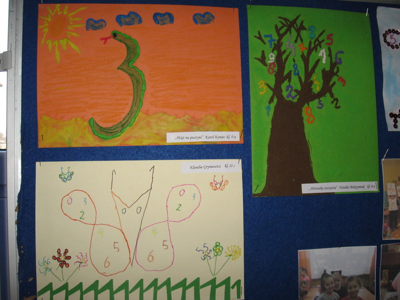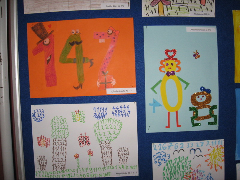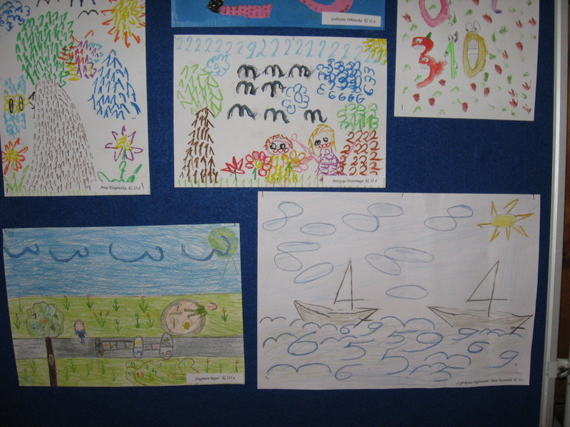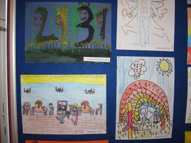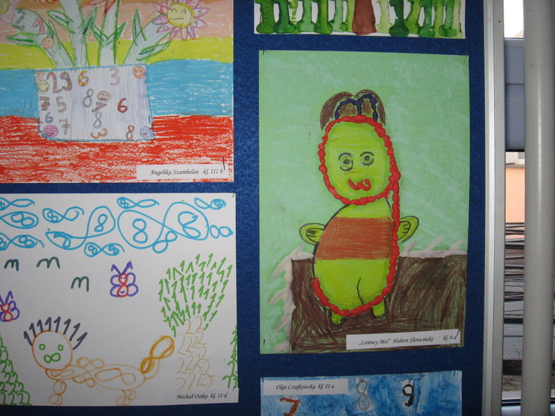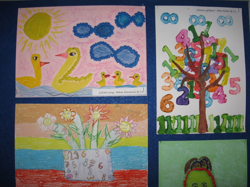 Konkurs plastyczny pt.: „Śmieszne cyferki” w klasach 0-III. Efekty pracy uczniów mogliśmy podziwiać na wystawach prezentowanych na korytarzach szkoły. Wśród uczniów młodszej grupy wiekowej wyróżniono: