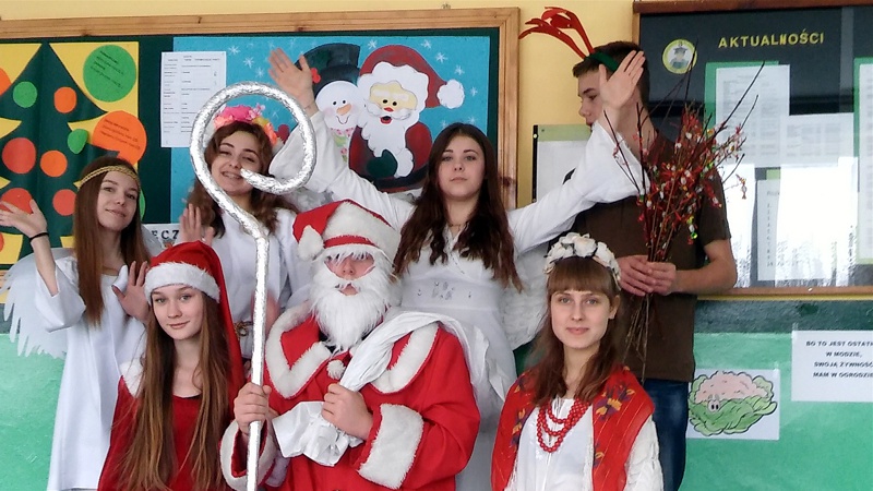 W czwartek 8 grudnia w naszym gimnazjum odbyły się długo wyczekiwane Mikołajki. Na zaproszenie Samorządu Uczniowskiego do szkoły przybył Święty Mikołaj wraz ze swoimi pomocnikami i zawitał do każdej klasy. Obdarował uczniów, nauczycieli i pracowników szkoły słodkimi upominkami, ale niestety przywiózł również...rózgi. W całej szkole panował świąteczny nastrój. Wszystkim dopisywały świetne humory.