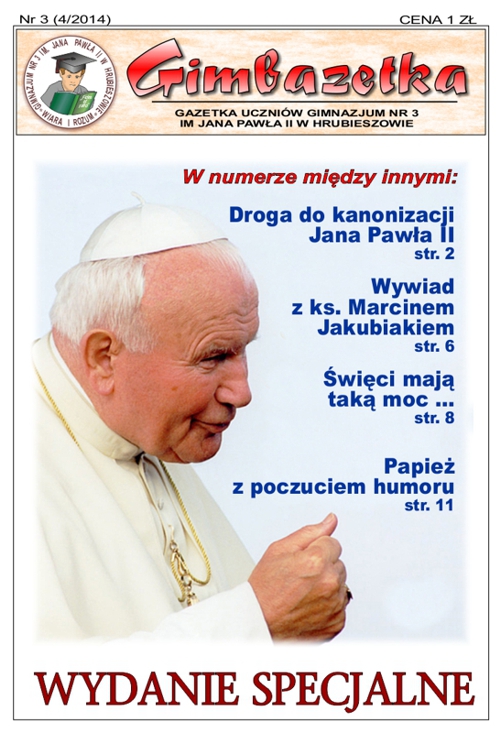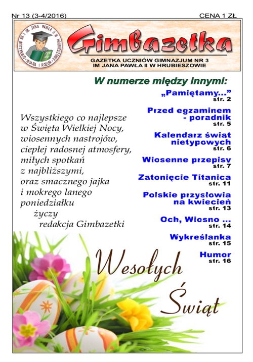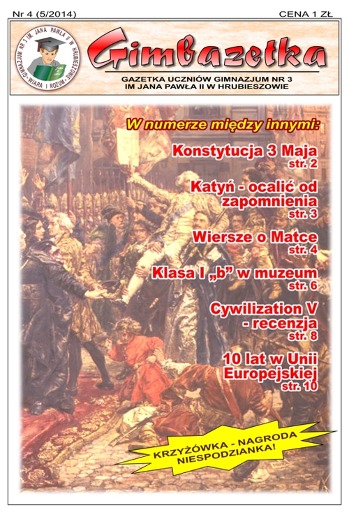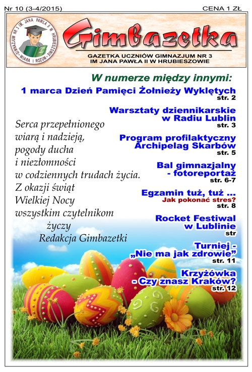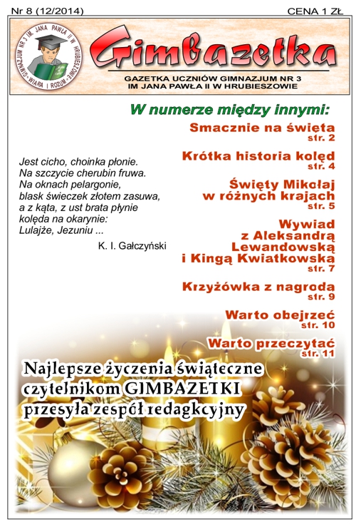 W naszej szkole wydawana jest gazetka szkolna "GIMBAZETKA". Pomysłodawczynią i opiekunem jest nauczyciel bibliotekarz p. Aneta Kawalec. W naszym piśmie staramy się poruszać tematy, które są bliskie uczniom, nauczycielom, rodzicom i lokalnej społeczności. Redaktorami gazetki są uczniowie gimnazjum, którzy zdobywają pierwsze dziennikarskie szlify, doskonalą swój język, uczą się otwartości na świat, zdobywają pewność siebie. Oni często sami sugerują tematy i piszą artykuły.