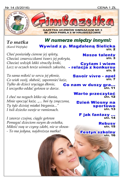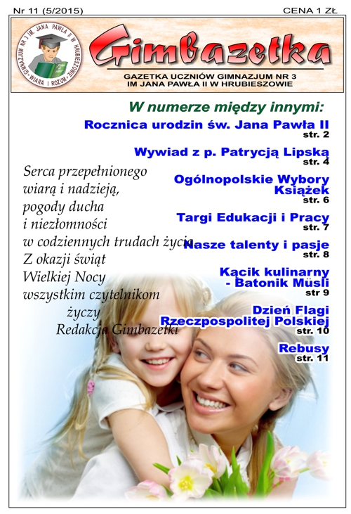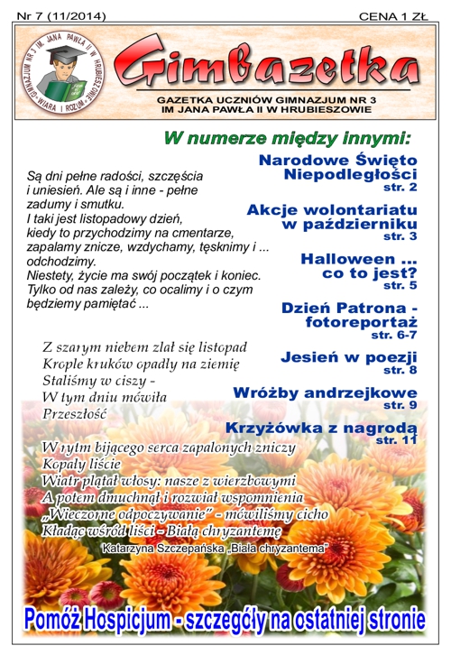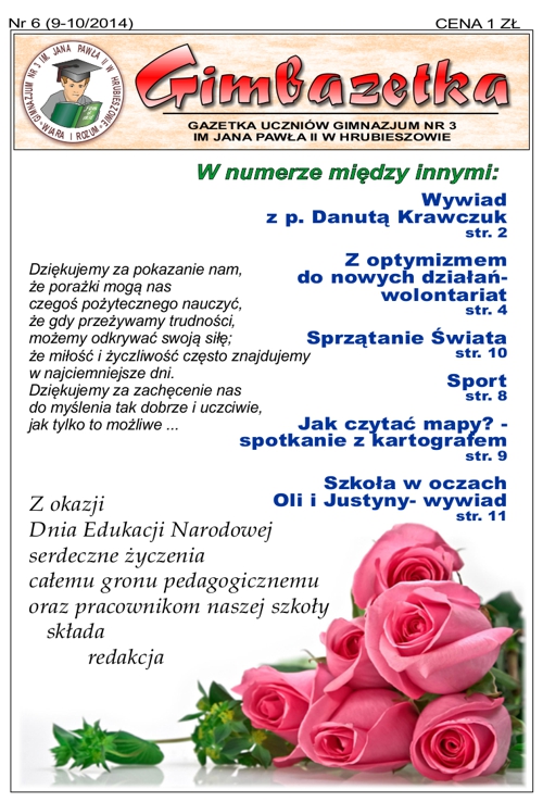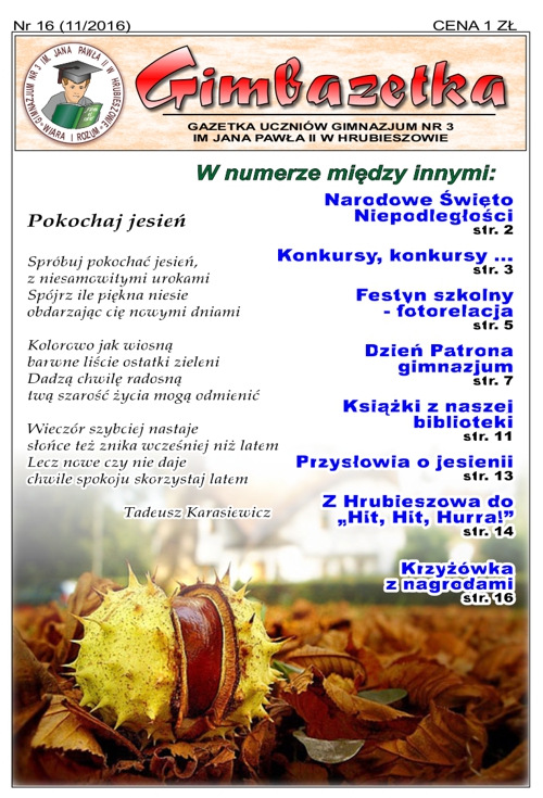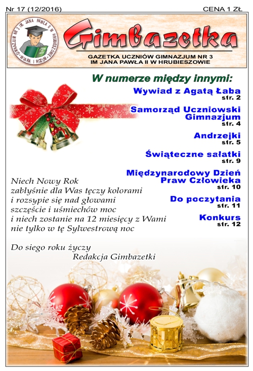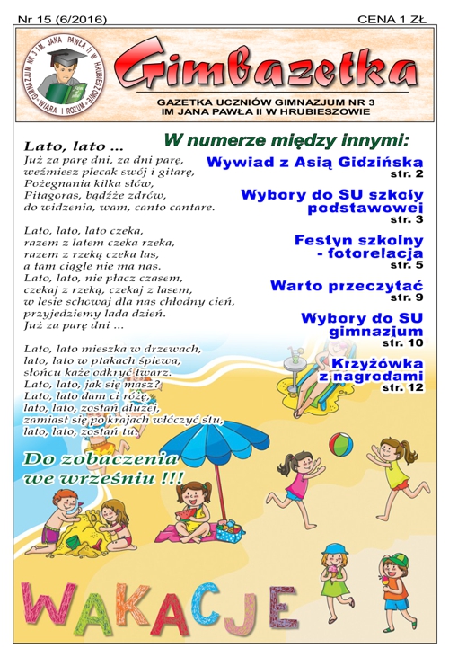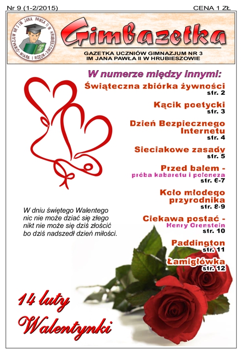Gazetka ukazuje się średnio co miesiąc. Wybór tematu łączy się nie tylko z aktualnymi wydarzeniami z życia szkoły ale też z zainteresowaniami i osiągnięciami uczniów naszej szkoły. W każdym numerze staramy się, aby czytelnik znalazł coś dla siebie. Główne tematy poruszane w gazetce to informacje o najważniejszych wydarzeniach (uroczystościach szkolnych, konkursach, festynach szkolnych, imprezach klasowych i wycieczkach) oraz zainteresowaniach i osiągnięciach uczniów naszej szkoły. Często ukazują się łatwe i smaczne przepisy kulinarne zwłaszcza w okolicach zbliżających się świąt, które są nie tylko polecane ale też sprawdzone przez autorki. Stałą rubryką są m.in. konkursy, łamigłówki lub krzyżówki, które cieszą się dużym zainteresowaniem ze względu na ciekawe nagrody. Gazetka liczy 12 lub 16 stron. Cieszymy się, że GIMBAZETKA ma stałe grono czytelników, nie tylko w naszej szkole, ale także poza nią.