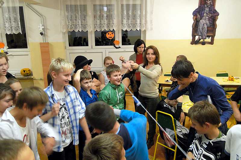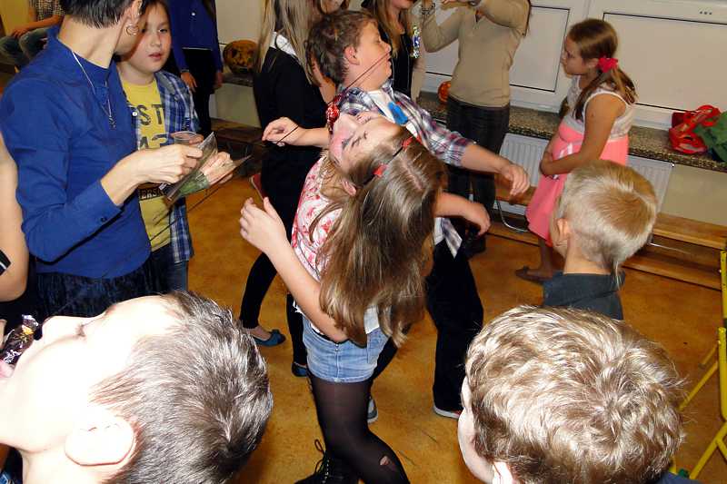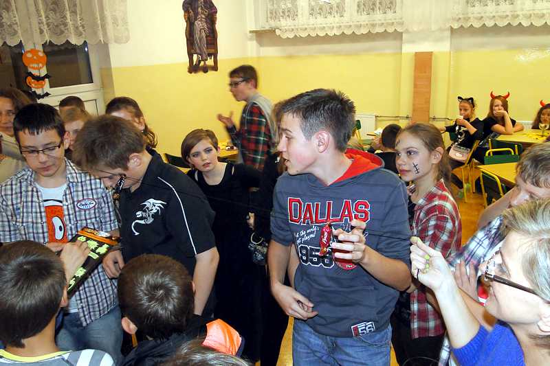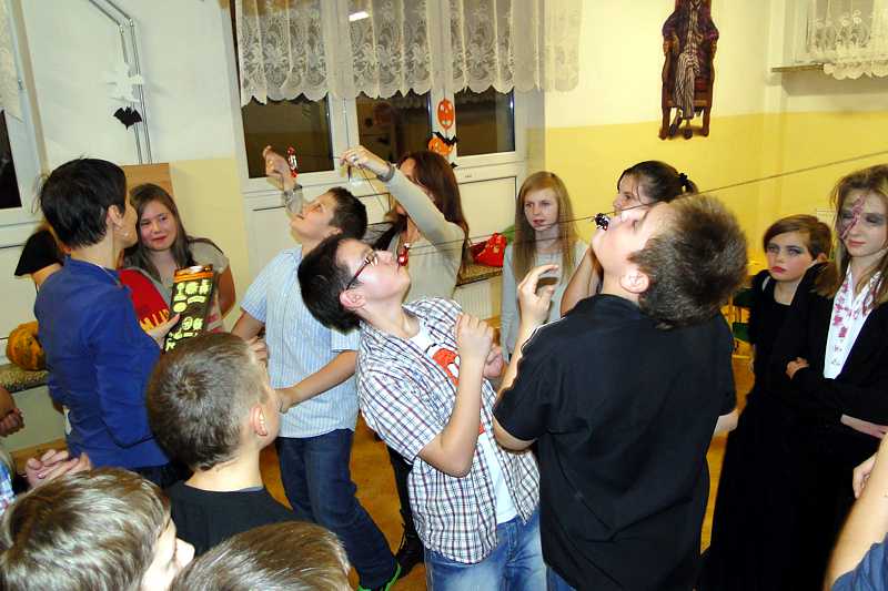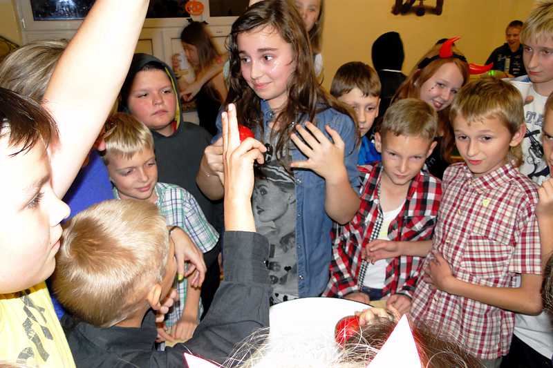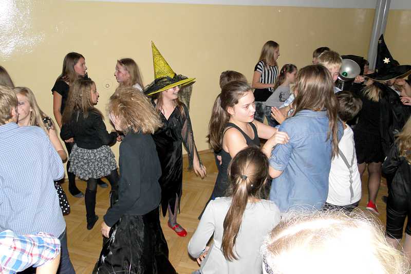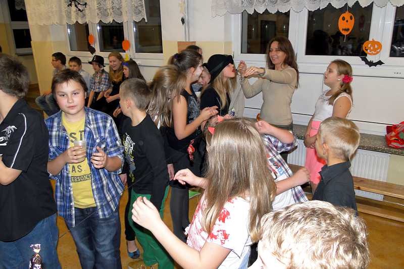 Pląsom i zabawom nie było końca. Dużo emocji wywołały też konkursy, podczas których dzieci musiały wykazać się pomysłowością i zręcznością. Jak zwykle "bobbing for apples" i wyścig na miotłach cieszył się dużym zainteresowaniem.