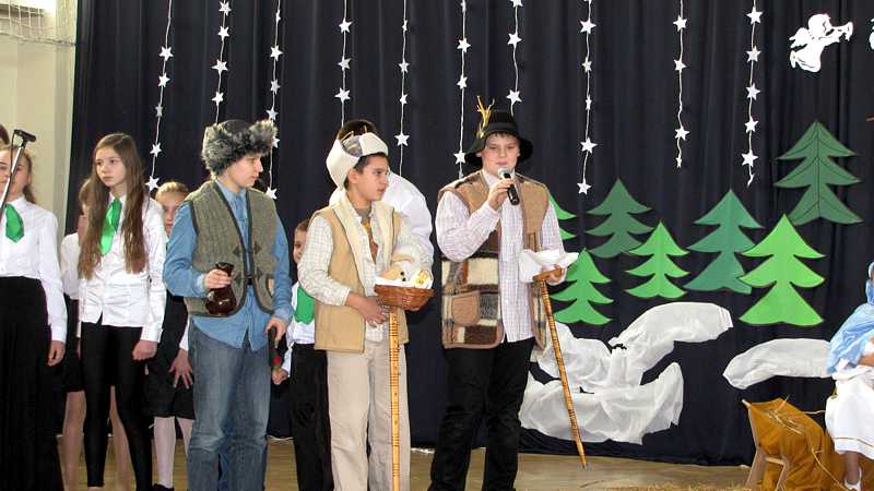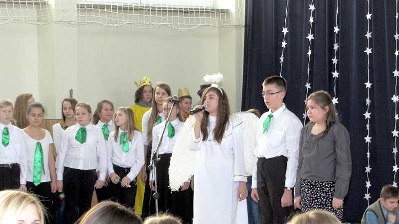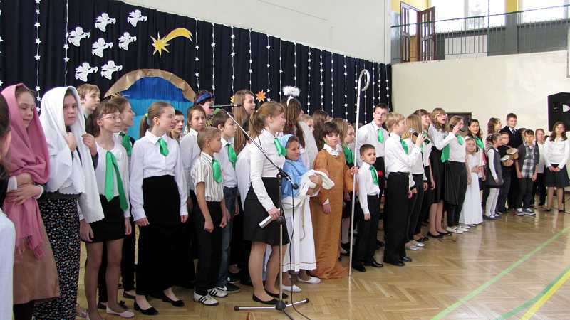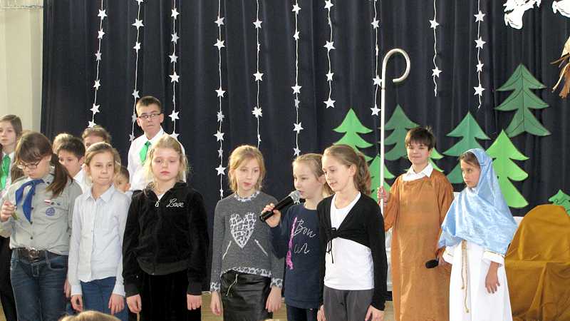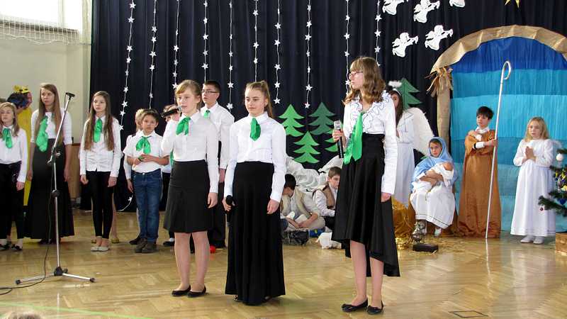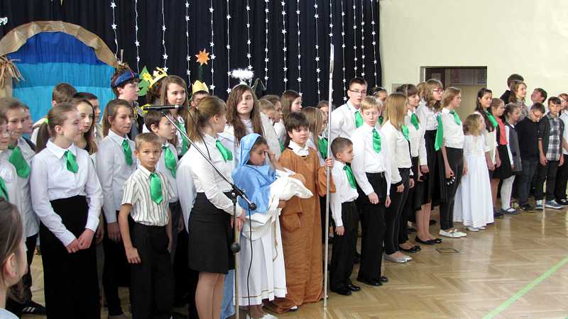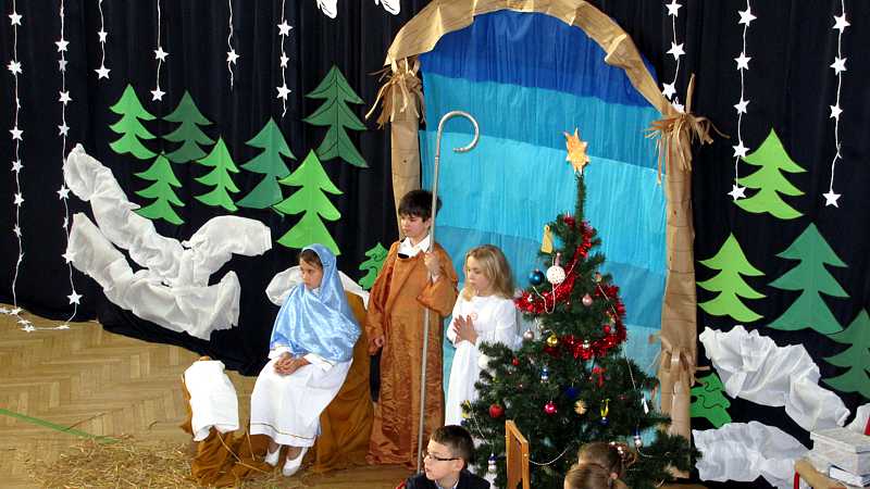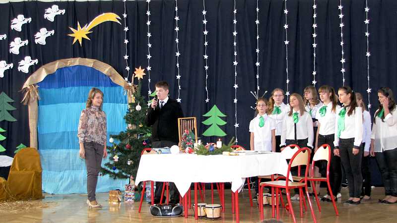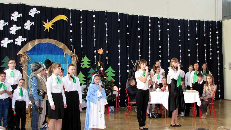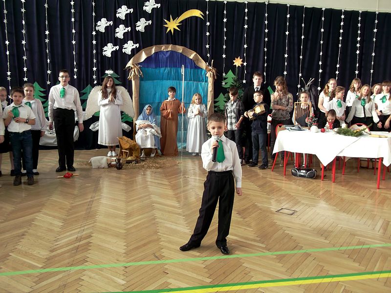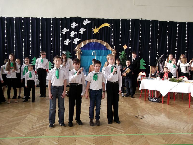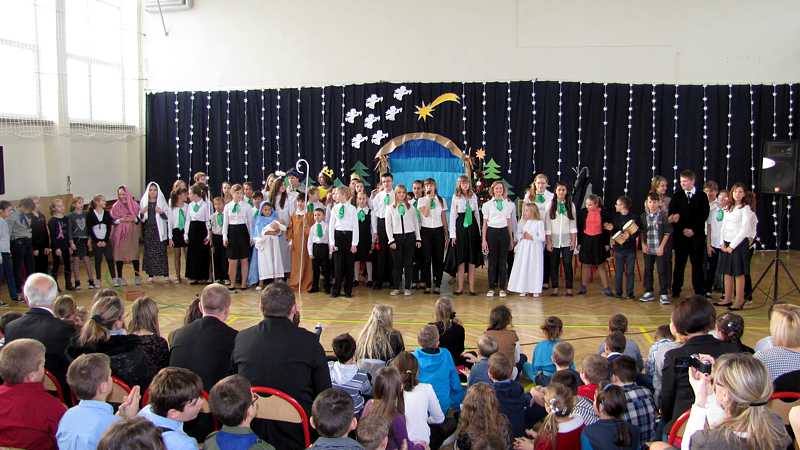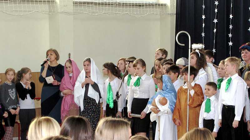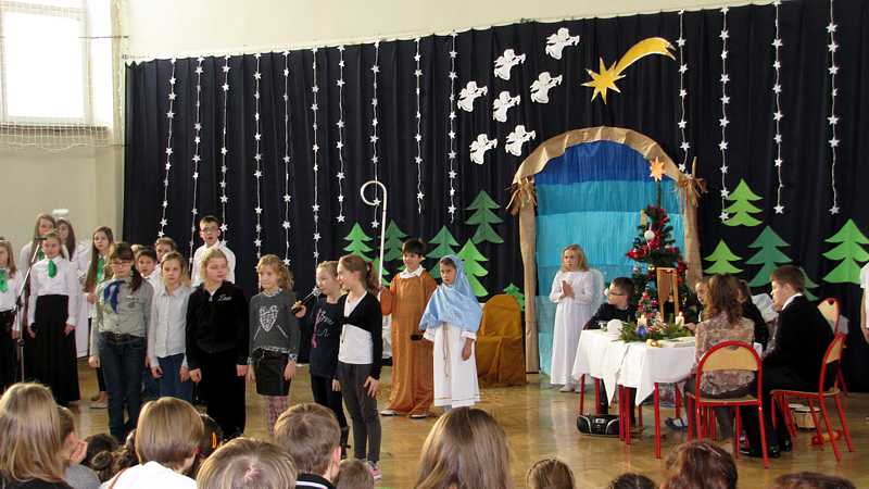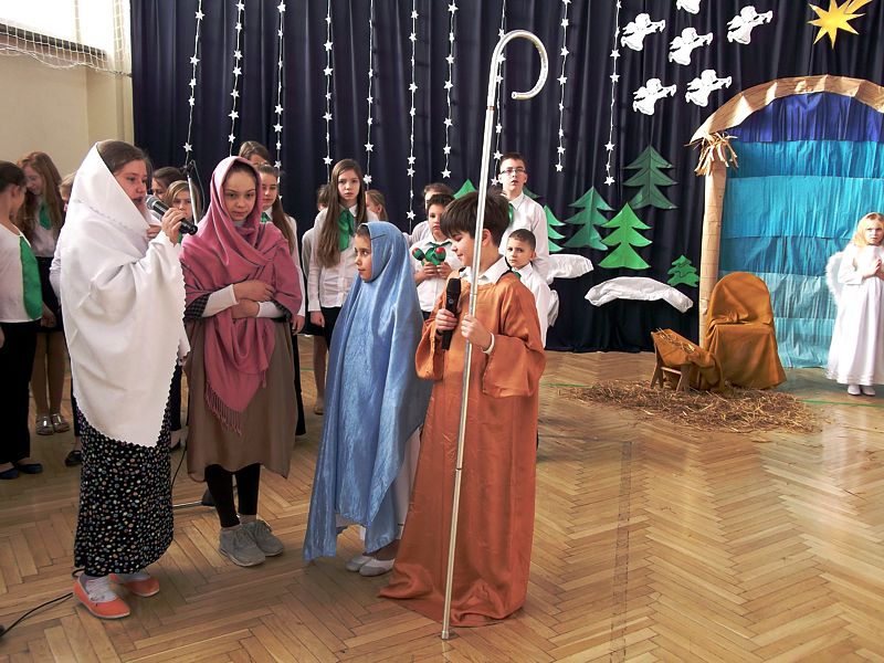 Całość przedstawienia pokazującego i przypominającego przepiękne tradycje Świąt Bożego Narodzenia przeplatana była kolędami i pastorałkami we współczesnej interpretacji. Publiczność mogła też po raz kolejny przeżyć historię Marii i Józefa szukających miejsca do schronienia na noc, którzy po bezowocnych poszukiwaniach zdecydowali się przenocować w stajni. I to do nich i małego Jezuska przybyli tak honorowi goście jak trzej mędrcy i złożyli dzieciątku pokłon. „Jasełka” wraz z uczniami przygotowały pani Małgorzata Koniec i siostra Bożena Brandenburg, które również wykonały dekorację . Współpracowała z nimi także pani Alicja Strójwąs – Mojsym. Oprawę muzyczną zapewnił chór szkolny pod kierunkiem pani Anety Franke. Po przedstawieniu Pani Dyrektor podziękowała wszystkim „aktorom” i nauczycielom , którzy przyczynili się do wzbogacenia szkolnej Wigilii, a następnie złożyła wszystkim obecnym świąteczne życzenia i zaprosiła Pracowników szkoły na spotkanie opłatkowe. Jasełka pozwoliły poczuć rodzinną atmosferę zbliżających się Świąt Bożego Narodzenia i rozpocząć wspólne świętowanie narodzin Zbawiciela.