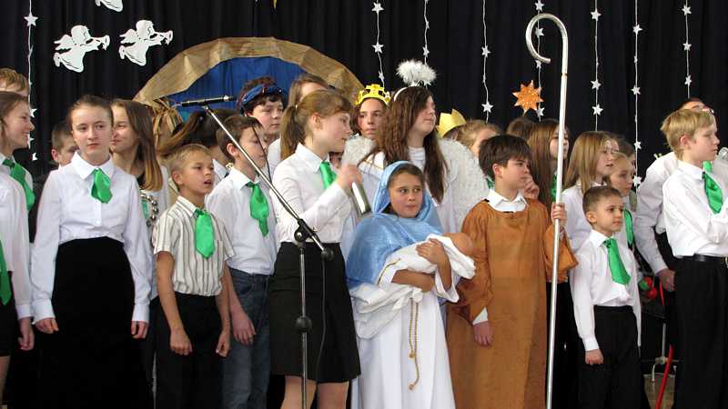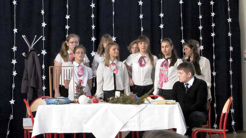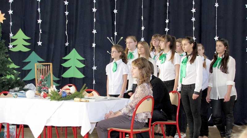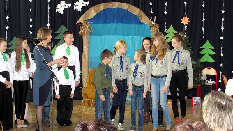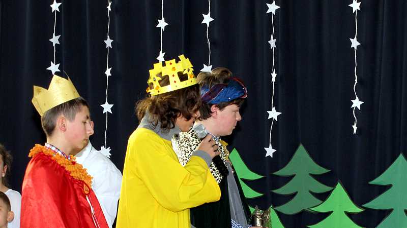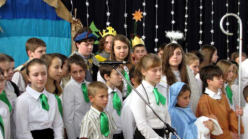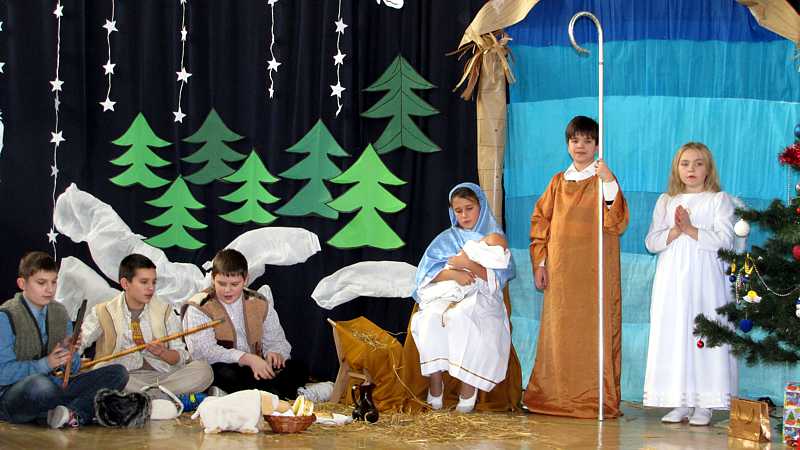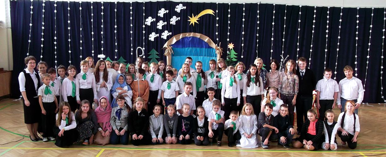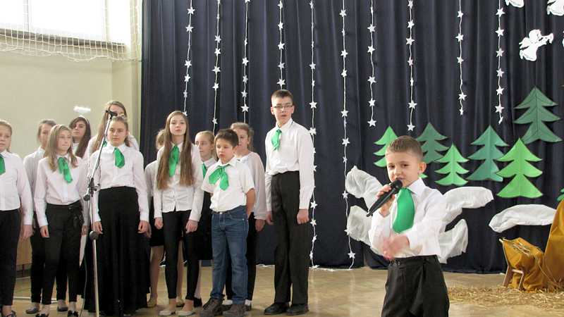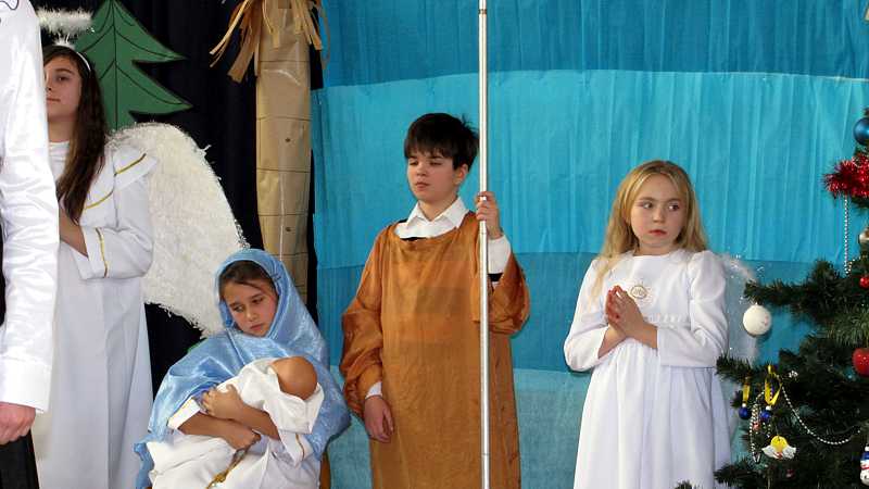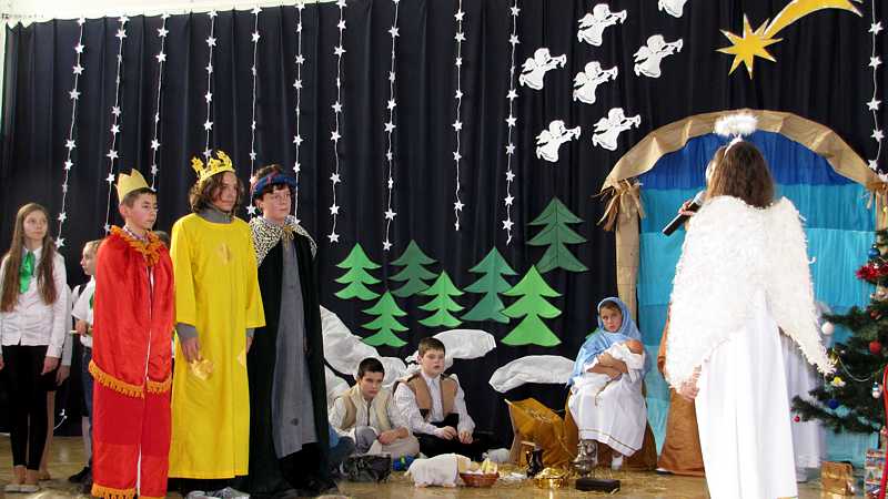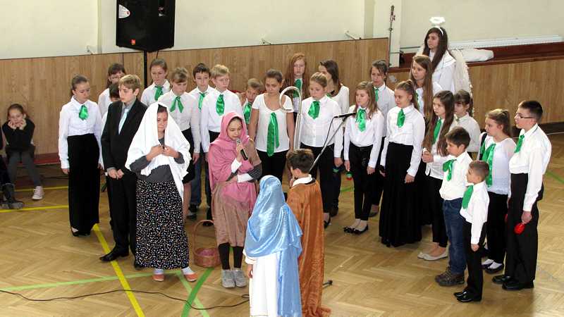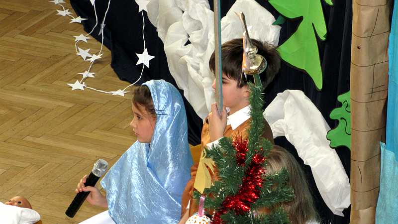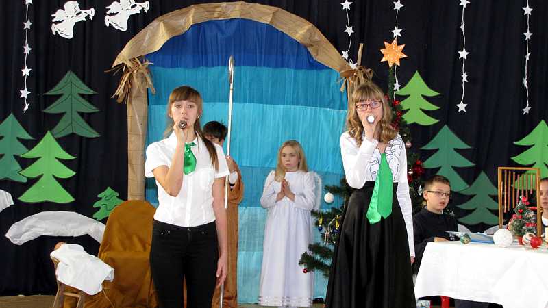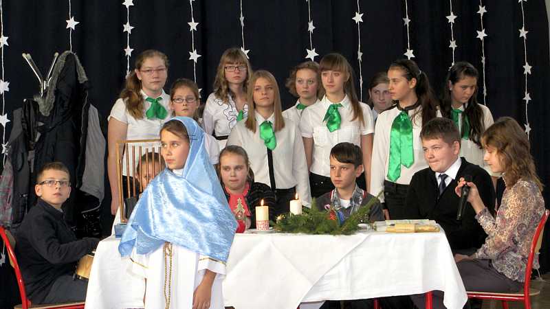 Całość przedstawienia pokazującego i przypominającego przepiękne tradycje Świąt Bożego Narodzenia przeplatana była kolędami i pastorałkami we współczesnej interpretacji. Publiczność mogła też po raz kolejny przeżyć historię Marii i Józefa szukających miejsca do schronienia na noc, którzy po bezowocnych poszukiwaniach zdecydowali się przenocować w stajni. I to do nich i małego Jezuska przybyli tak honorowi goście jak trzej mędrcy i złożyli dzieciątku pokłon. „Jasełka” wraz z uczniami przygotowały pani Małgorzata Koniec i siostra Bożena Brandenburg, które również wykonały dekorację . Współpracowała z nimi także pani Alicja Strójwąs – Mojsym. Oprawę muzyczną zapewnił chór szkolny pod kierunkiem pani Anety Franke. Po przedstawieniu Pani Dyrektor podziękowała wszystkim „aktorom” i nauczycielom , którzy przyczynili się do wzbogacenia szkolnej Wigilii, a następnie złożyła wszystkim obecnym świąteczne życzenia i zaprosiła Pracowników szkoły na spotkanie opłatkowe. Jasełka pozwoliły poczuć rodzinną atmosferę zbliżających się Świąt Bożego Narodzenia i rozpocząć wspólne świętowanie narodzin Zbawiciela.