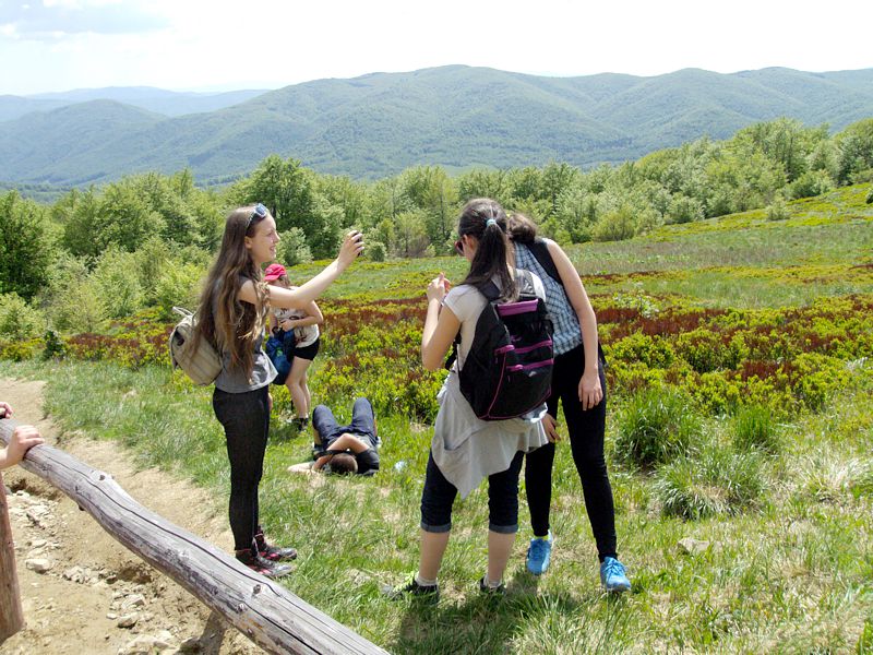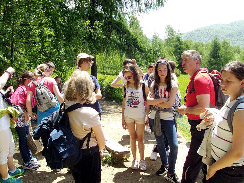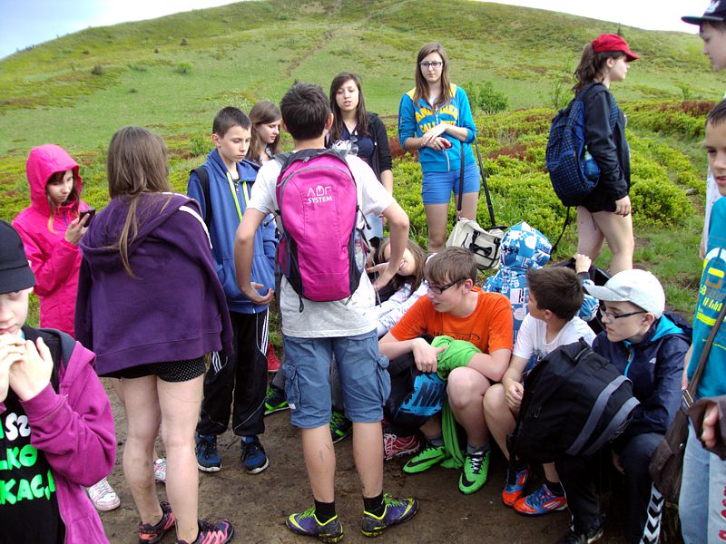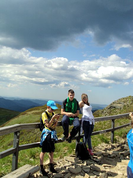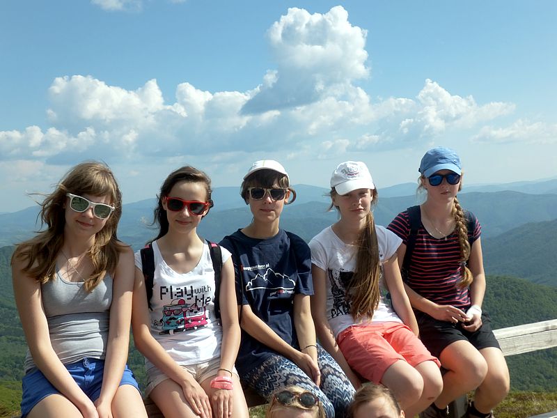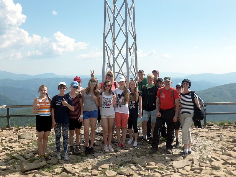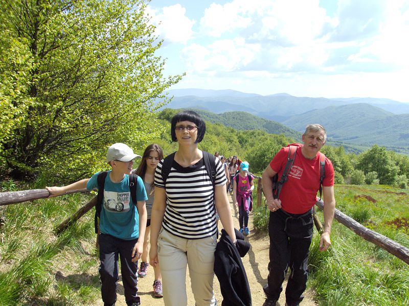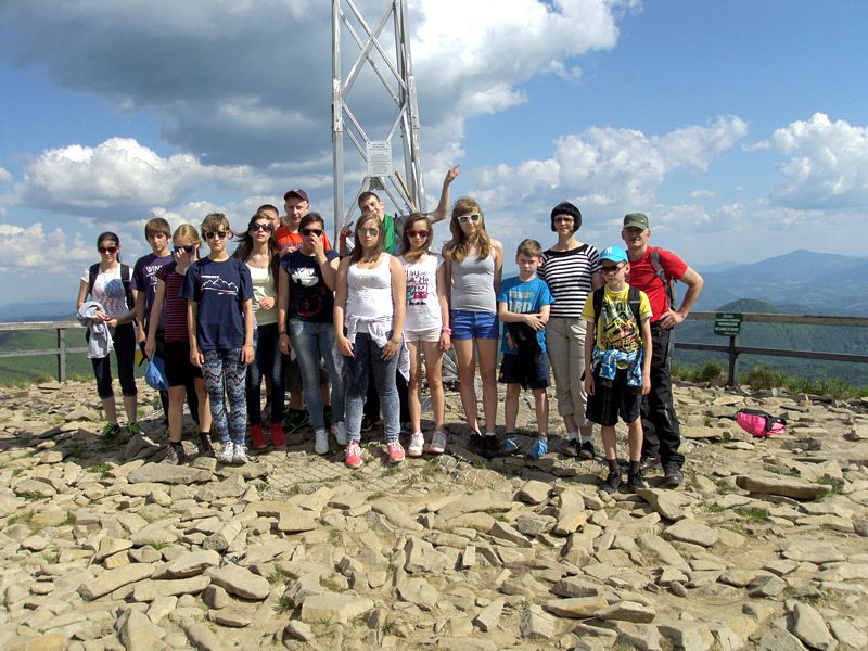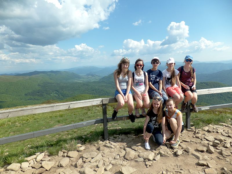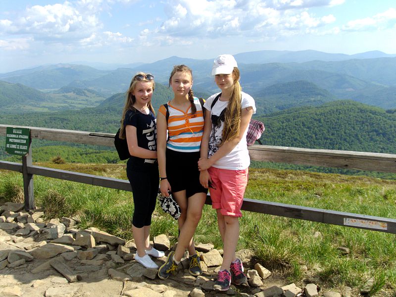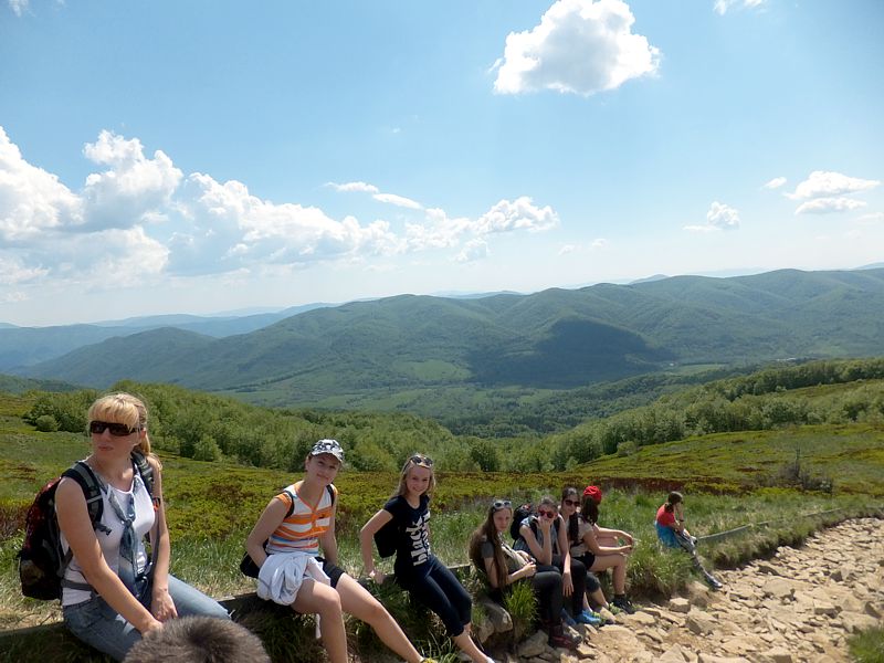 Następny dzień też dostarczył nam niezapomnianych przeżyć. Tuż po śniadaniu pojechaliśmy do Cisnej, by odbyć przejażdżkę kolejką bieszczadzką. Piękne widoki zauroczyły wszystkich. Po wyjściu z kolejki czekał nas przejazd Pętlą Bieszczadzką przez Czarne Lutowiska do Wołosatego. To tu spotkaliśmy się z z górskim przewodnikiem, który zaproponował nam wejście na najwyższy szczyt polskich Bieszczad- Tarnicę ( 1346 m n.p.m.). Po krótkiej rozmowie ruszyliśmy w trasę, która prowadziła przez bieszczadzkie lasy . Po drodze niejednokrotnie zatrzymywaliśmy się , by nabrać sił i posłuchać opowieści o ludziach z gór, o wilkach i niedźwiedziach. Po dwóch godzinach byliśmy już na szczycie, skąd roztacza się cudowny widok na Bieszczady. Upojeni przepięknym krajobrazem, dumni z osiągniętego celu ruszyliśmy w drogę powrotną. Tym razem towarzyszył nam deszcz. Gdy byliśmy już u podnóża gór, blisko Ustrzyk Górnych, ujrzeliśmy piękną tęczę, która nieśmiało wynurzyła się ze wzgórz. Później udaliśmy się do Bukowca, gdzie czekano na nas z obiadokolacją.