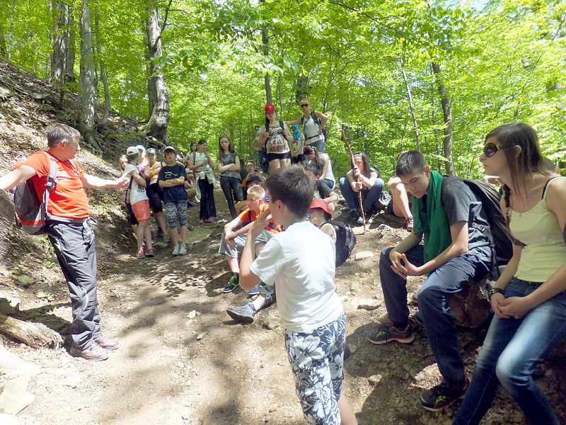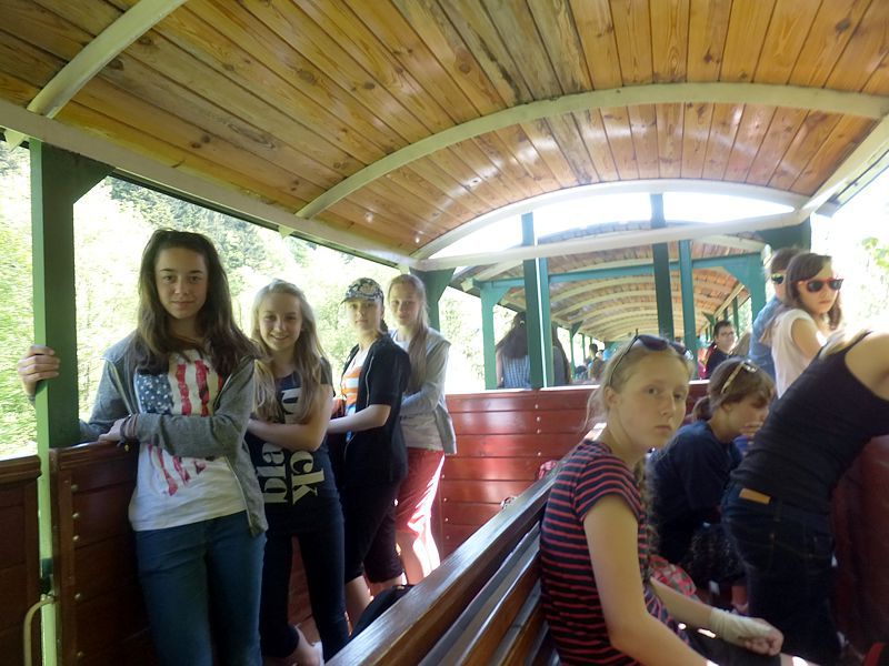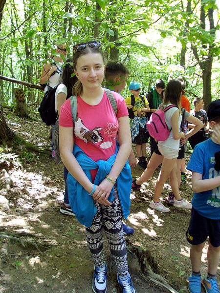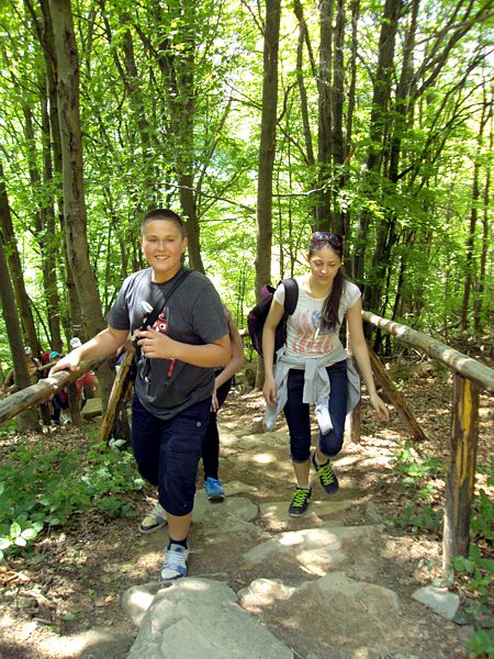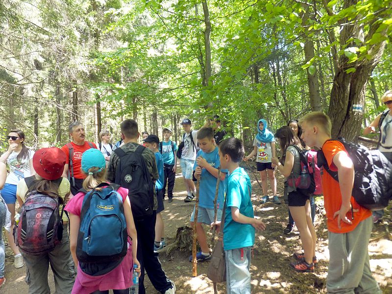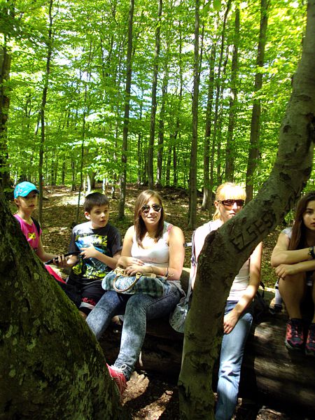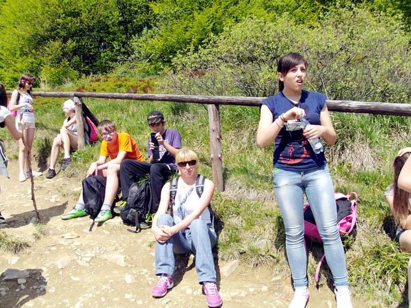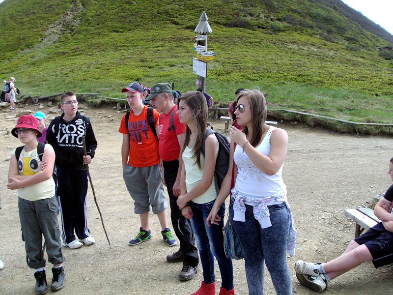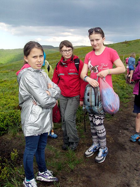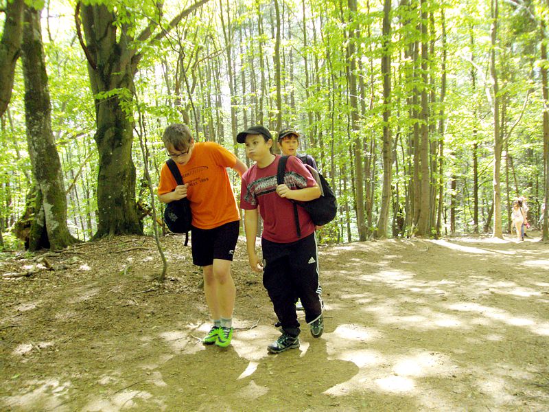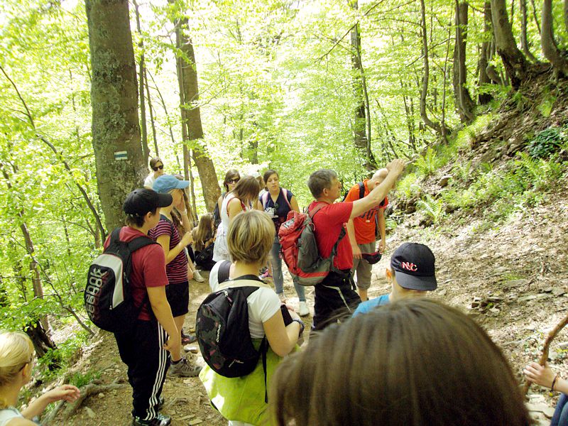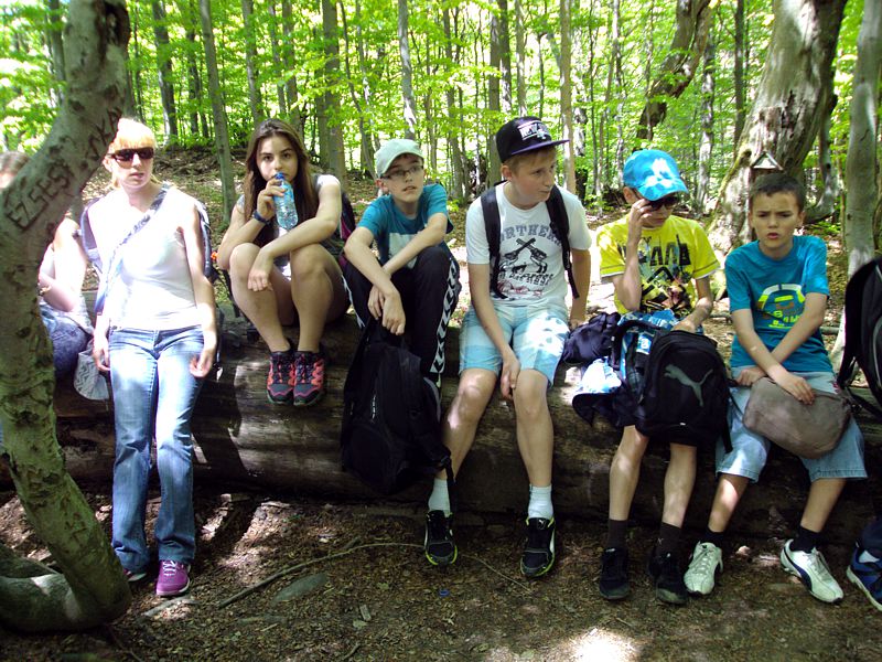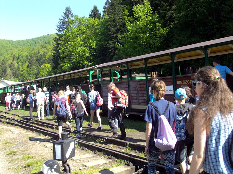 Następny dzień też dostarczył nam niezapomnianych przeżyć. Tuż po śniadaniu pojechaliśmy do Cisnej, by odbyć przejażdżkę kolejką bieszczadzką. Piękne widoki zauroczyły wszystkich. Po wyjściu z kolejki czekał nas przejazd Pętlą Bieszczadzką przez Czarne Lutowiska do Wołosatego. To tu spotkaliśmy się z z górskim przewodnikiem, który zaproponował nam wejście na najwyższy szczyt polskich Bieszczad- Tarnicę ( 1346 m n.p.m.). Po krótkiej rozmowie ruszyliśmy w trasę, która prowadziła przez bieszczadzkie lasy . Po drodze niejednokrotnie zatrzymywaliśmy się , by nabrać sił i posłuchać opowieści o ludziach z gór, o wilkach i niedźwiedziach. Po dwóch godzinach byliśmy już na szczycie, skąd roztacza się cudowny widok na Bieszczady. Upojeni przepięknym krajobrazem, dumni z osiągniętego celu ruszyliśmy w drogę powrotną. Tym razem towarzyszył nam deszcz. Gdy byliśmy już u podnóża gór, blisko Ustrzyk Górnych, ujrzeliśmy piękną tęczę, która nieśmiało wynurzyła się ze wzgórz. Później udaliśmy się do Bukowca, gdzie czekano na nas z obiadokolacją.