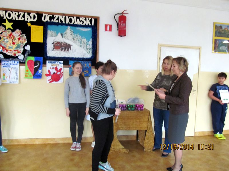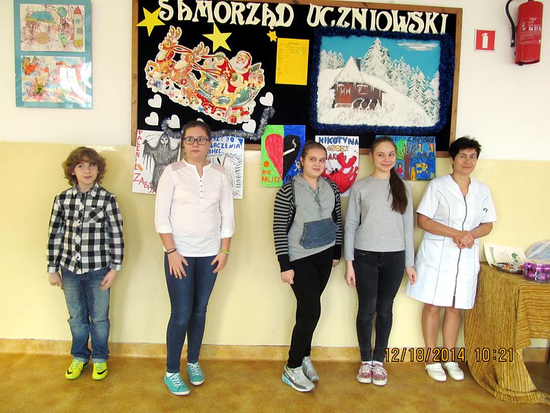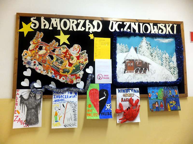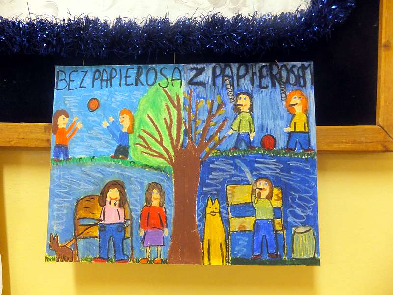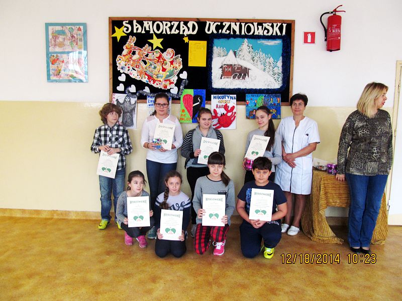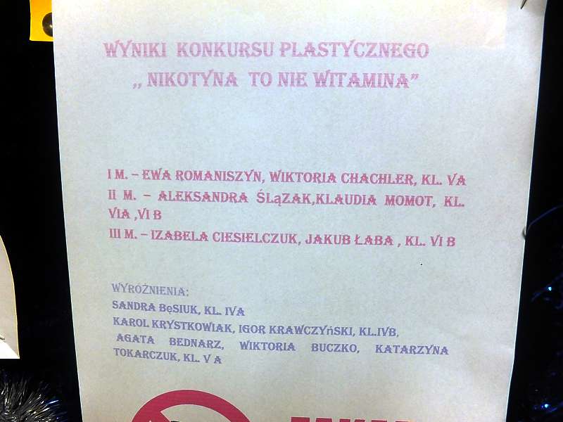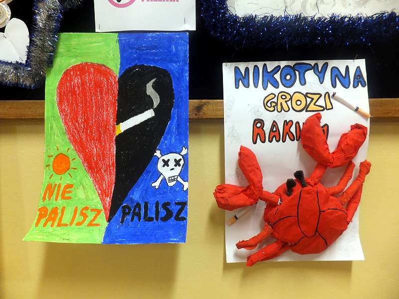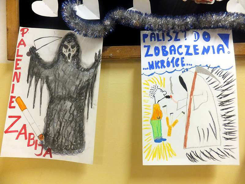 Dnia 10 grudnia został rozstrzygnięty konkurs plastyczny pod hasłem ,, Nikotyna to nie witamina”. Jego celem było uświadomienie dzieciom i młodzieży szkodliwości palenia. W trakcie wykonywania prac okazało się, że uczniowie doskonale zdają sobie sprawę z tego, jakie mogą być skutki nałogu, co ma wpływ na wzrost zachorowań, jakie składniki tytoniowych używek szczególnie niszczą zdrowie. Nic więc dziwnego, że powstałe plakaty były przemyślane, twórcze i zadziwiająco dojrzałe. W konkursie zorganizowanym przez Samorząd Uczniowski wzięło udział 40 uczniów.