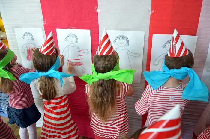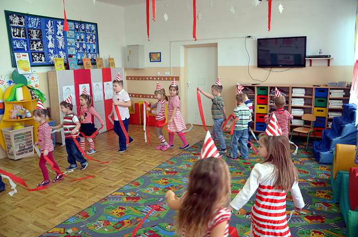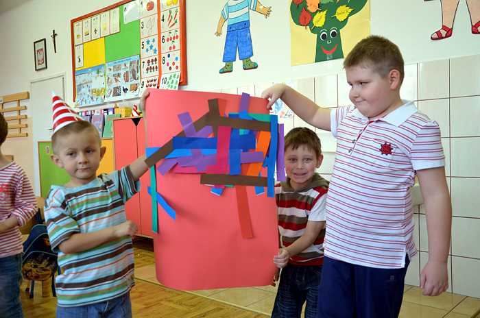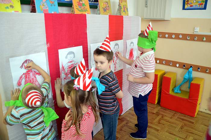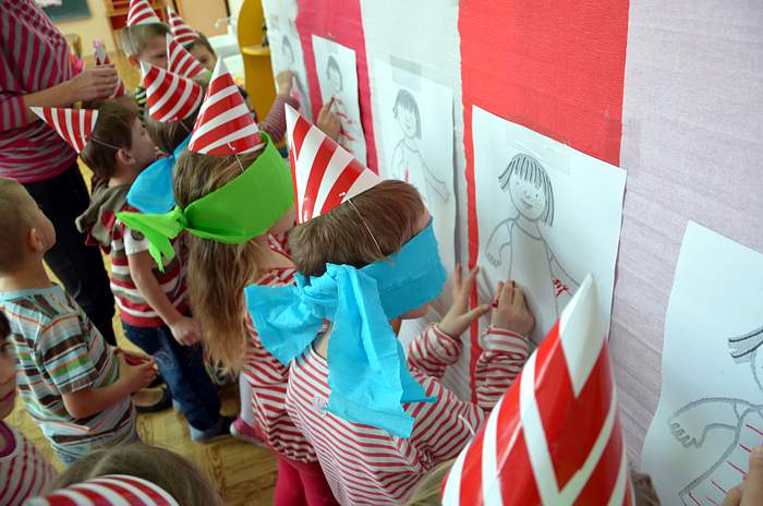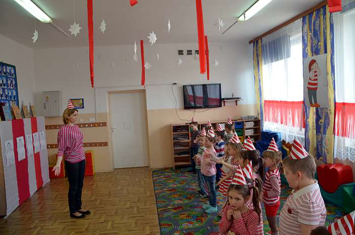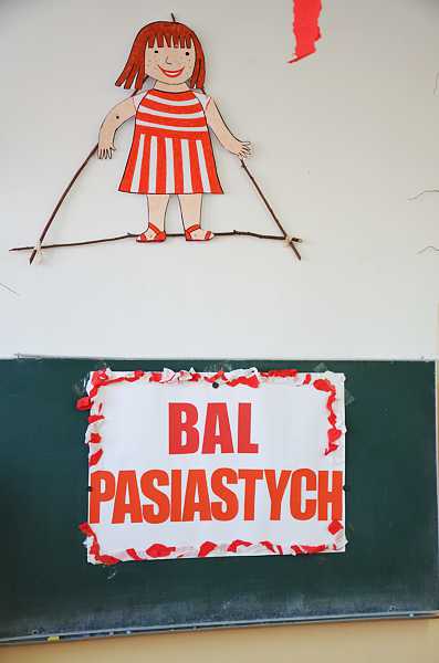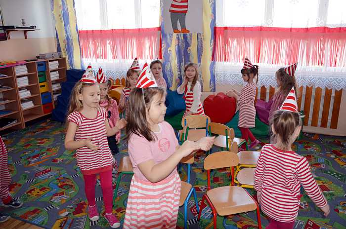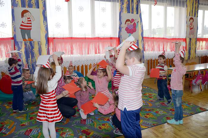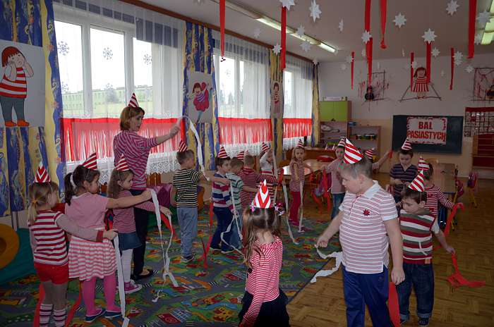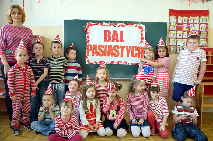 "Basiowy Dzień Pasiastych" był dobrym pomysłem na to, by choć na chwilę przenieść się w świat bohaterki opowiadań. W przygotowaniach do imprezy uczestniczyły wszystkie dzieci z zerówki. W pasiastych strojach rozpoczęliśmy fajną i kolorową zabawę. Były tańce z paskami bibuły i balonami, tworzyliśmy pasiaste obrazy, z zamkniętymi oczami kolorowaliśmy strój Basi. Wiele radości wyzwoliło się podczas bitwy na papierowe kule biło - czerwone.
