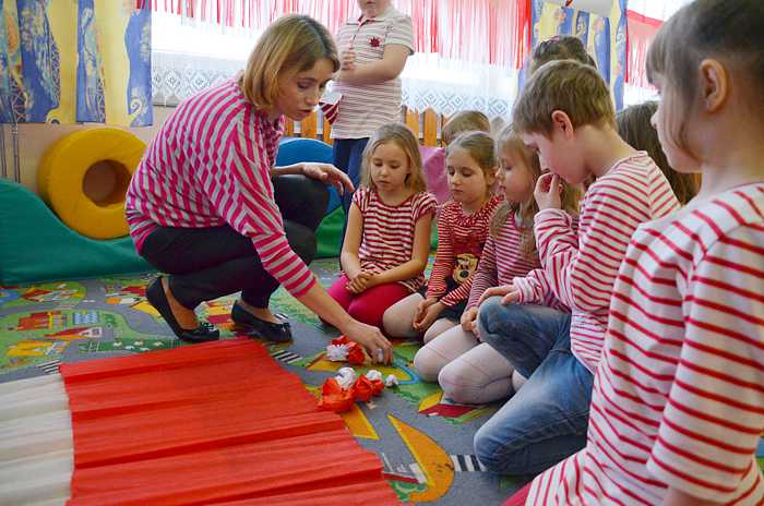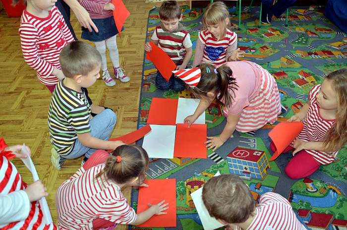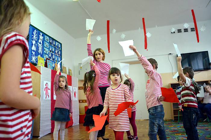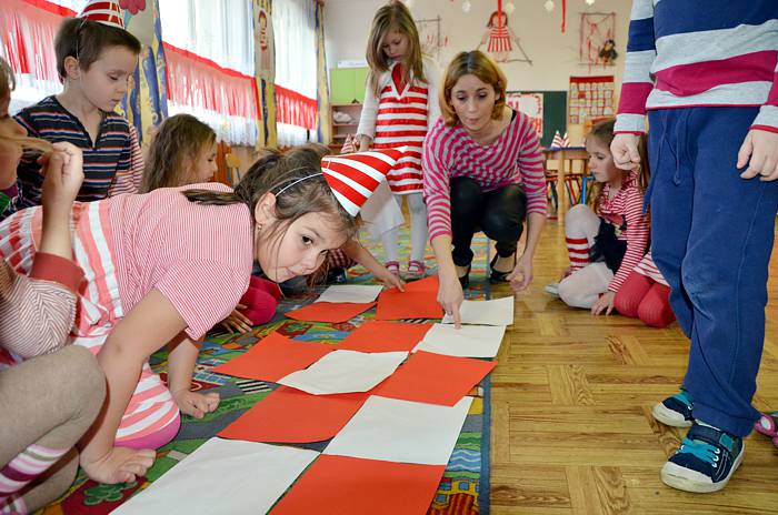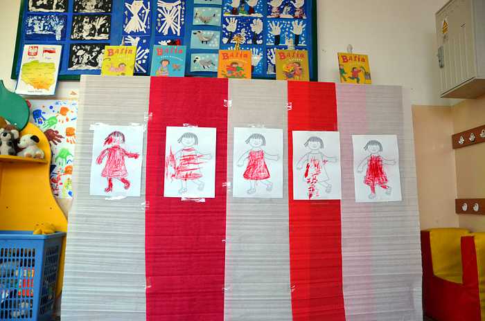 Kolejną, dużą atrakcją okazała się zabawa w teatr. Dzięki własnoręcznie wykonanym kukiełkom Basi i Janka (jej brata) każdy mógł zaprezentować, krótką scenkę z życia książkowej bohaterki. Pośród kolejnych ciekawych zabaw znalazły się również matematyczne łamigłówki i zadania konstrukcyjne. Z biało - czerwonych kartek należało ułożyć mozaiki według zasad i wskazówek, które ustalał nauczyciel. Następnym razem kartki zamieniły się w skrzydełka bocianów, wróbelków, czy motylków i unosiły się nad łąką, pod chmurami, potem lekko opadały na dziecięce głowy i leżały tam tak długo dopóki nie zdmuchnął je wiatr. Gdy dotknęły ziemi były lodowymi kulkami lub rozgrzanymi kamieniami itd.