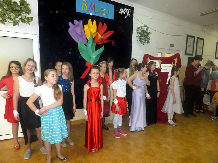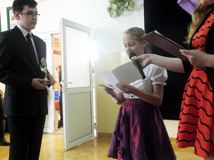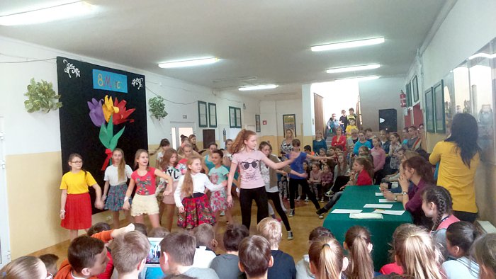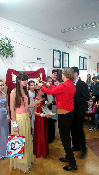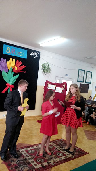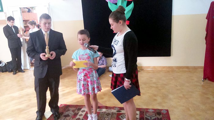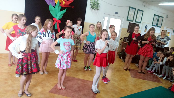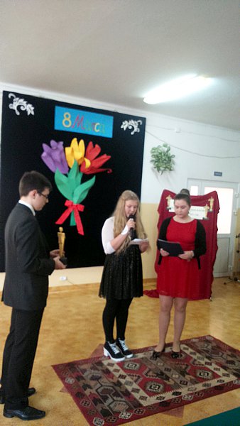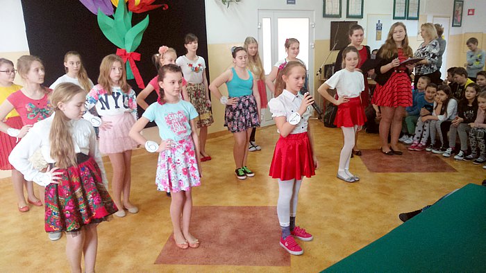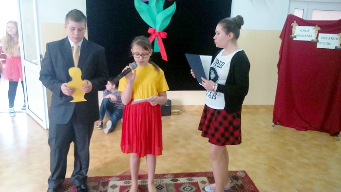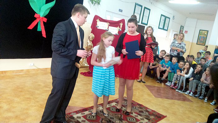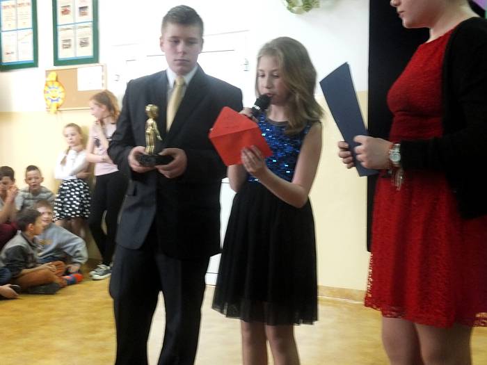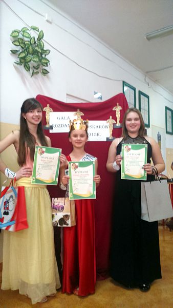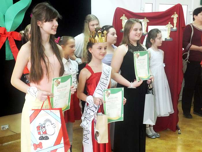 Pierwsza konkurencja polegała na opowiedzeniu kilku zdań o sobie i zaprezentowaniu się w wiosennych, zwiewnych strojach. Drugie zadanie wymagało od kandydatek umiejętności choreograficzno-tanecznych w trakcie wykonywania układu opracowanego przez uczennice klasy VI a : Aleksandrę Dzirbę , Olgę Śmietankę i Katarzynę Polską. Trzecie zadanie - "Czy potrafię trafić do serca chłopaka?" - polegało na rzucaniu piłką do wyciętego z papieru i powieszonego na tablicy serca, z odległości około 3 metrów. Po trzeciej konkurencji nastąpiła przerwa, podczas której na scenie wystąpiły nasze szkolne gwiazdy: Dominika Krawiec i Izabela Ciesielczuk . Pierwsza z nich zaśpiewała piosenkę pt. ,, Ach, jak przyjemnie”, zaś druga - zespołu Farba "Chcę tu zostać" . Iza dodatkowo przygotowała własny akompaniament muzyczny i zagrała na gitarze. Po koncercie rozpoczęła się Gala Oscarowa, która wymagała od dziewcząt wykazania się nienaganną gracją i elokwencją . Atmosfera, rodem z Hoolywood , sprawiła , że wszyscy w napięciu czekali na kandydatki, które miały zaprezentować się w wieczorowych kreacjach , a następnie przejść po czerwonym dywanie, zapozować na tle celebryckiej ścianki, wygłosić mowę i wręczyć Oscary wytypowanym przez siebie osobom. Dziewczyny były wyprowadzane na scenę przez eleganckich panów w czerni, uczniów klasy VI b : Konrada Słowika i Sebastiana Czapkę. Mimo początkowych obaw okazało się, że doskonale poradziły sobie z zadaniami. Wzorowo prowadzące galę: Małgorzata Pitus i Izabela Ciesielczuk po ostatniej konkurencji zapowiedziały przerwę konieczną do podsumowania zmagań . Po burzliwych naradach jury wytypowało zwyciężczynie konkursu: I miejsce - Martyna Wiśniewska, kl. IV c II miejsce - Masza Saczuk, kl. VI a III miejsce - Ewa Romaniszyn, kl. V a Zwyciężczyniom serdecznie gratulujemy! Podczas konkursu wszyscy bawiliśmy się świetnie , dlatego na zakończenie uroczystości wykonaliśmy nasz ulubiony i przez wszystkich znany taniec - oazową belgijkę.